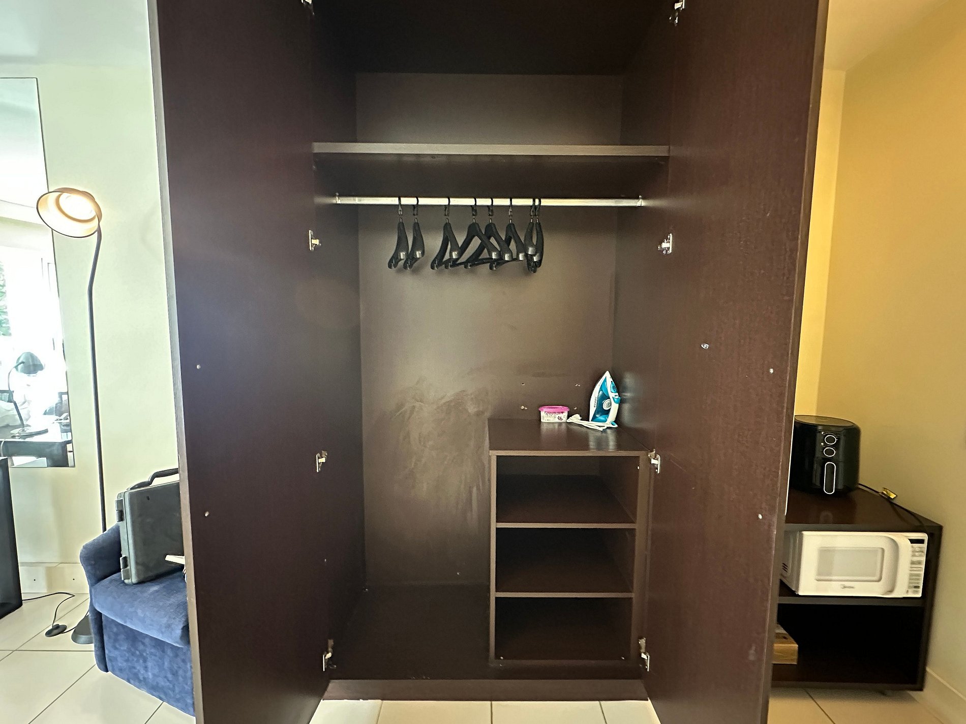 O loft possui uma cama King de alto padrão e um Futón de casal, além de um escritório com escrivaninha larga, armário, banheiro amplo e cozinha compacta com todos os itens essenciais para cozinhar. Vista para a Restinga e para o mar. No prédio é permitido utilizar a piscina, a sauna e os serviços extras.
