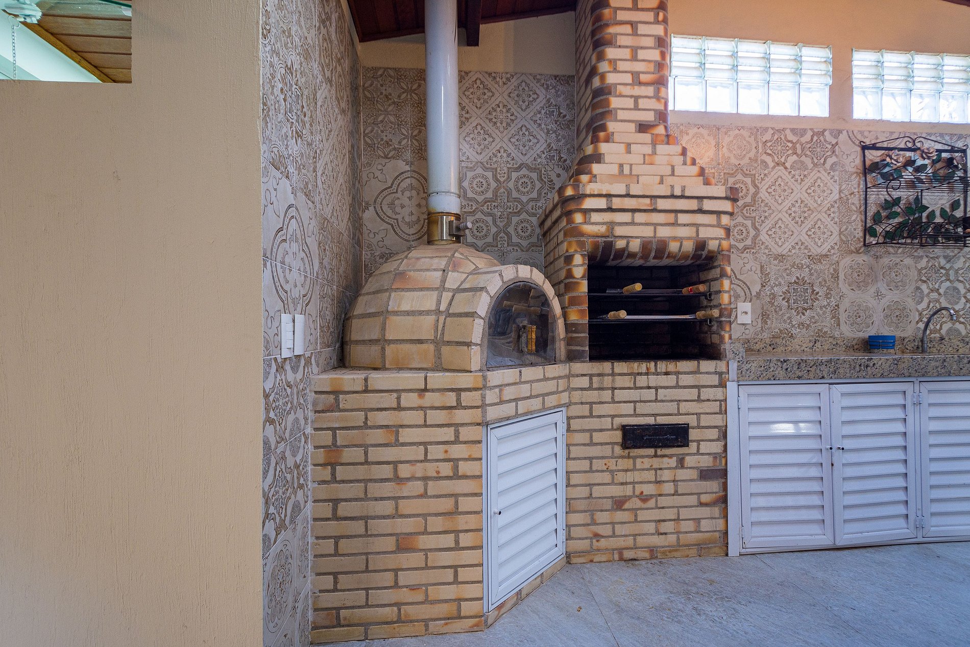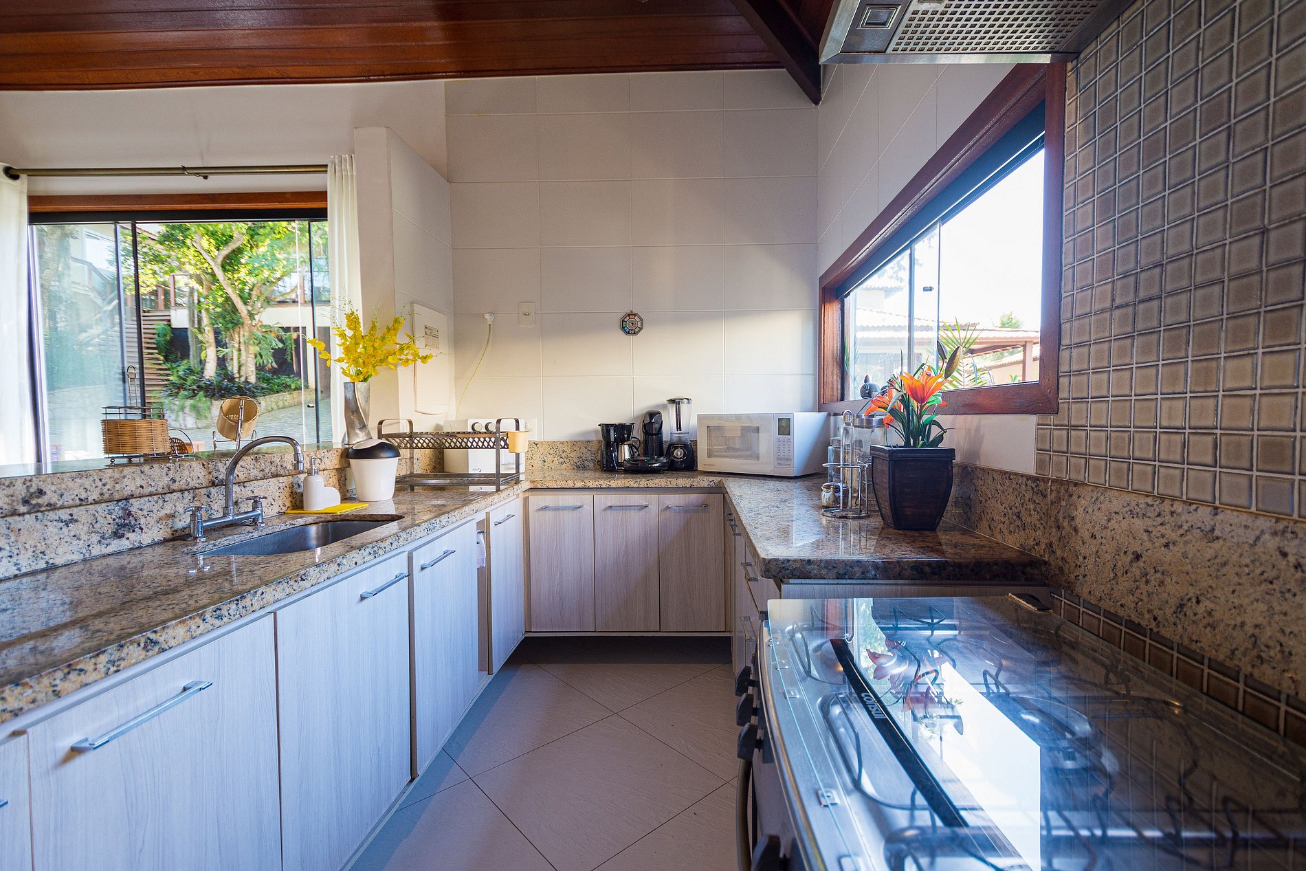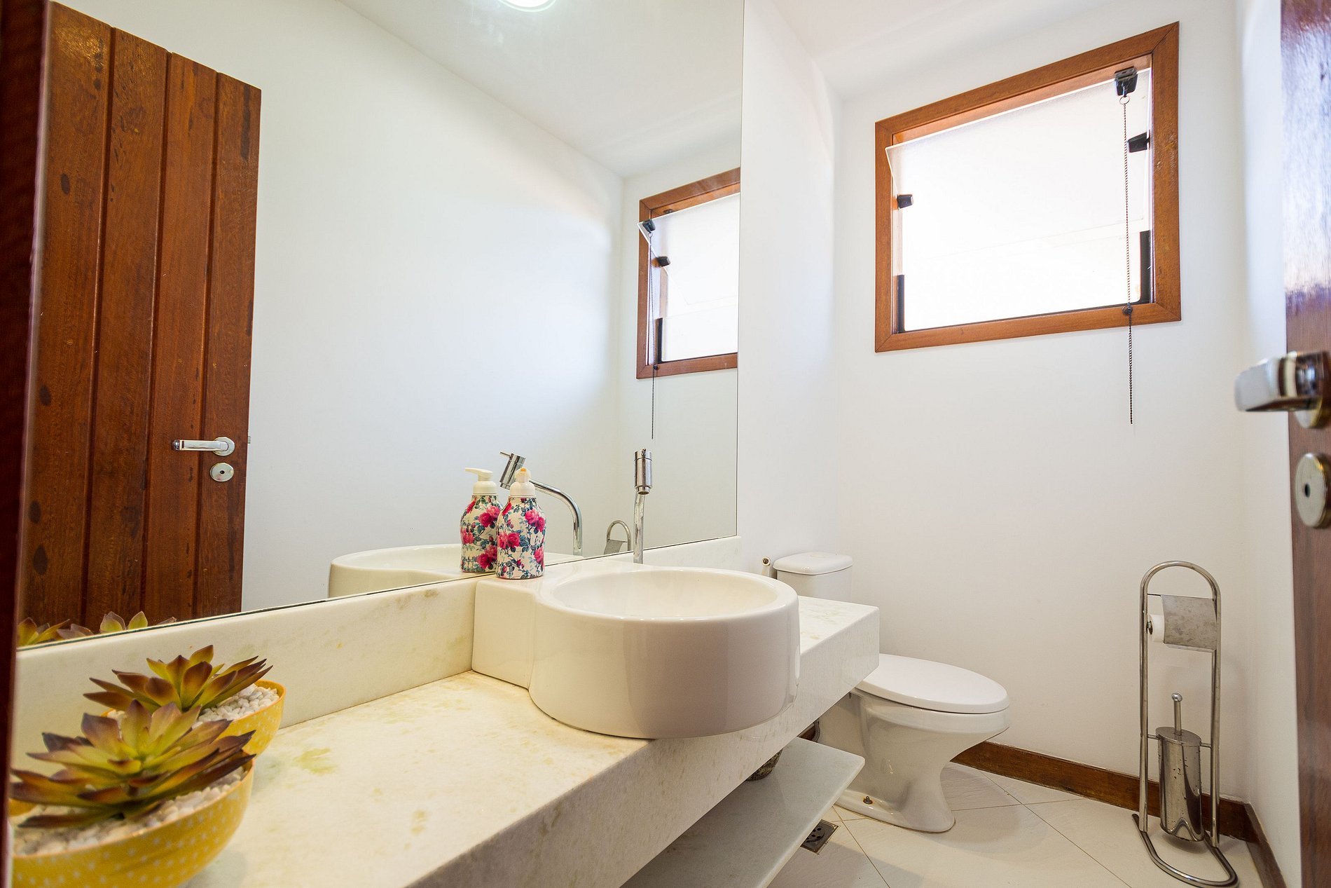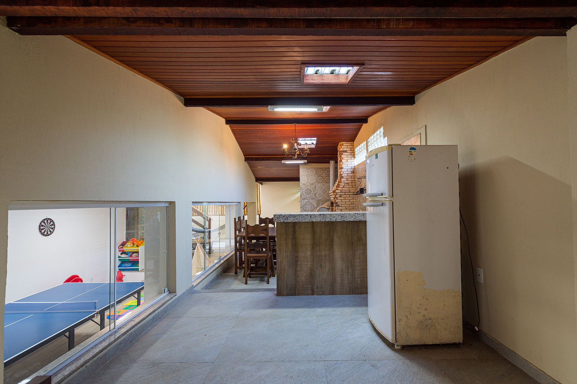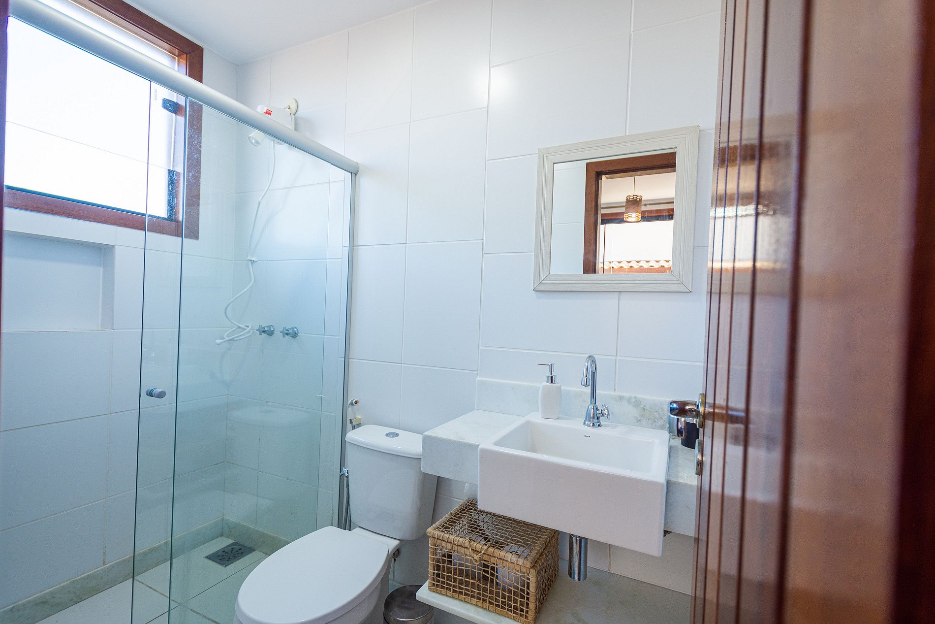 A casa possui quatro suítes com ar-condicionado e um lavabo, além de uma sala de estar bem ampla e cozinha completa. A área externa é espaçosa e tem um deck frontal com mesa e área de churrasco nos fundos com chuveirão e banheiro. Possui garagem para até 2 carros.