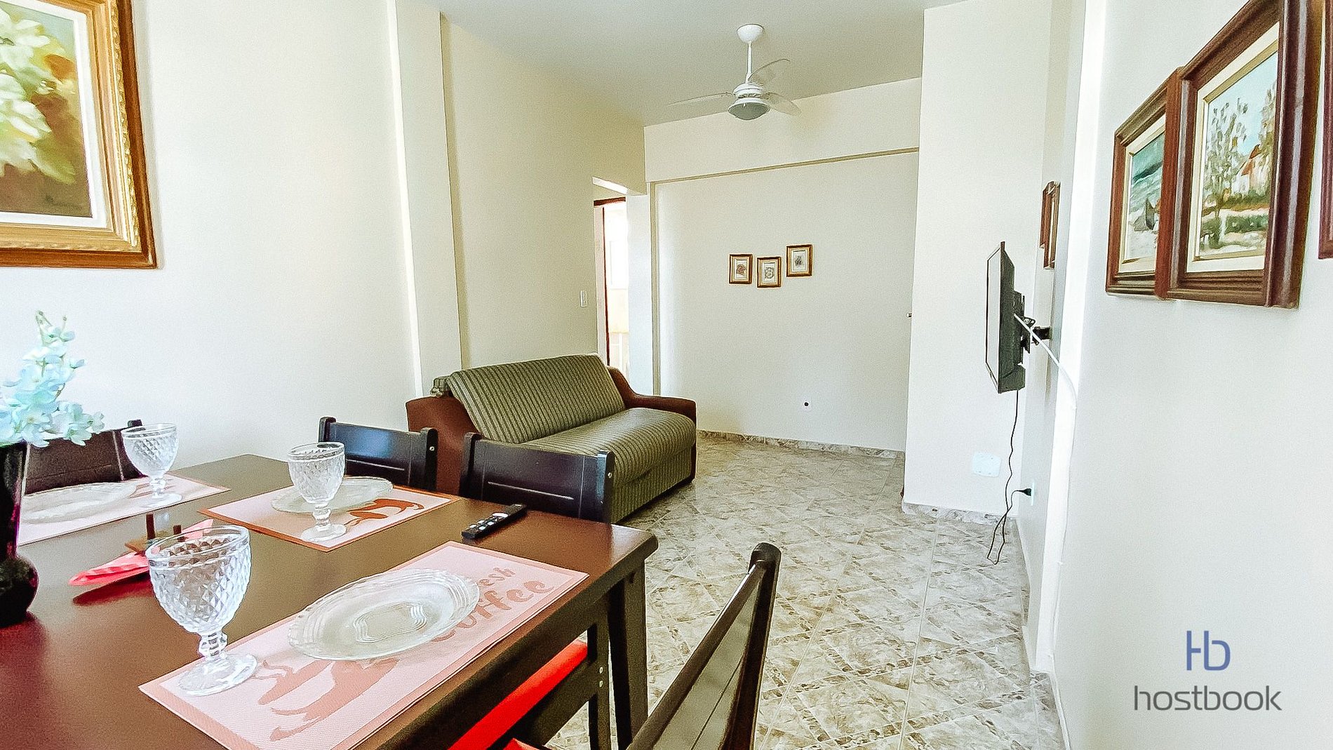 Sala com mesa de Jantar, sofá-cama e TV Smart.