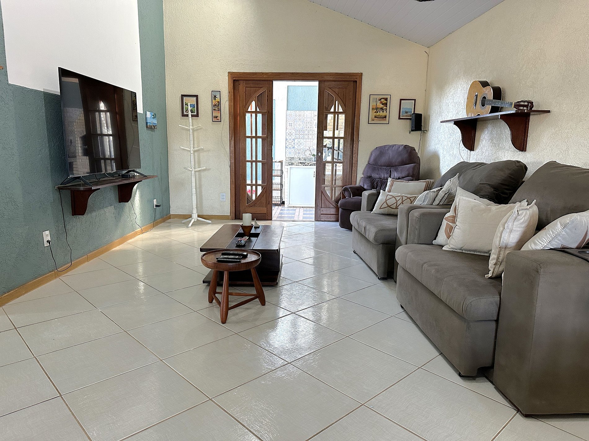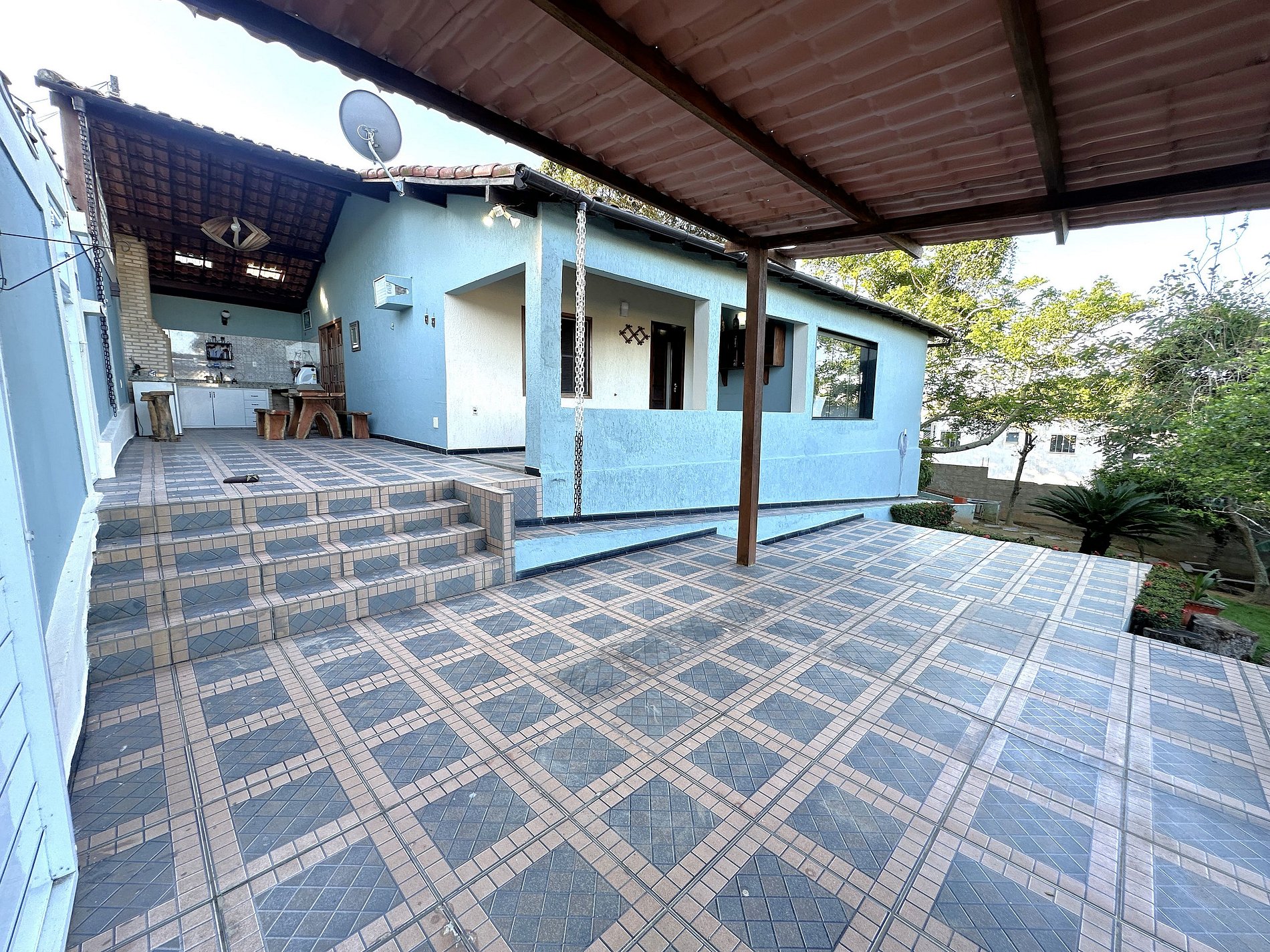 A casa possui 2 quartos, sala de estar, sala de jantar, cozinha ampla, varanda, cozinha gourmet, lavanderia e um quintal enorme e florido, além de garagem com portão automático. Ar-condicionado e ventilador de teto nos dois quartos.