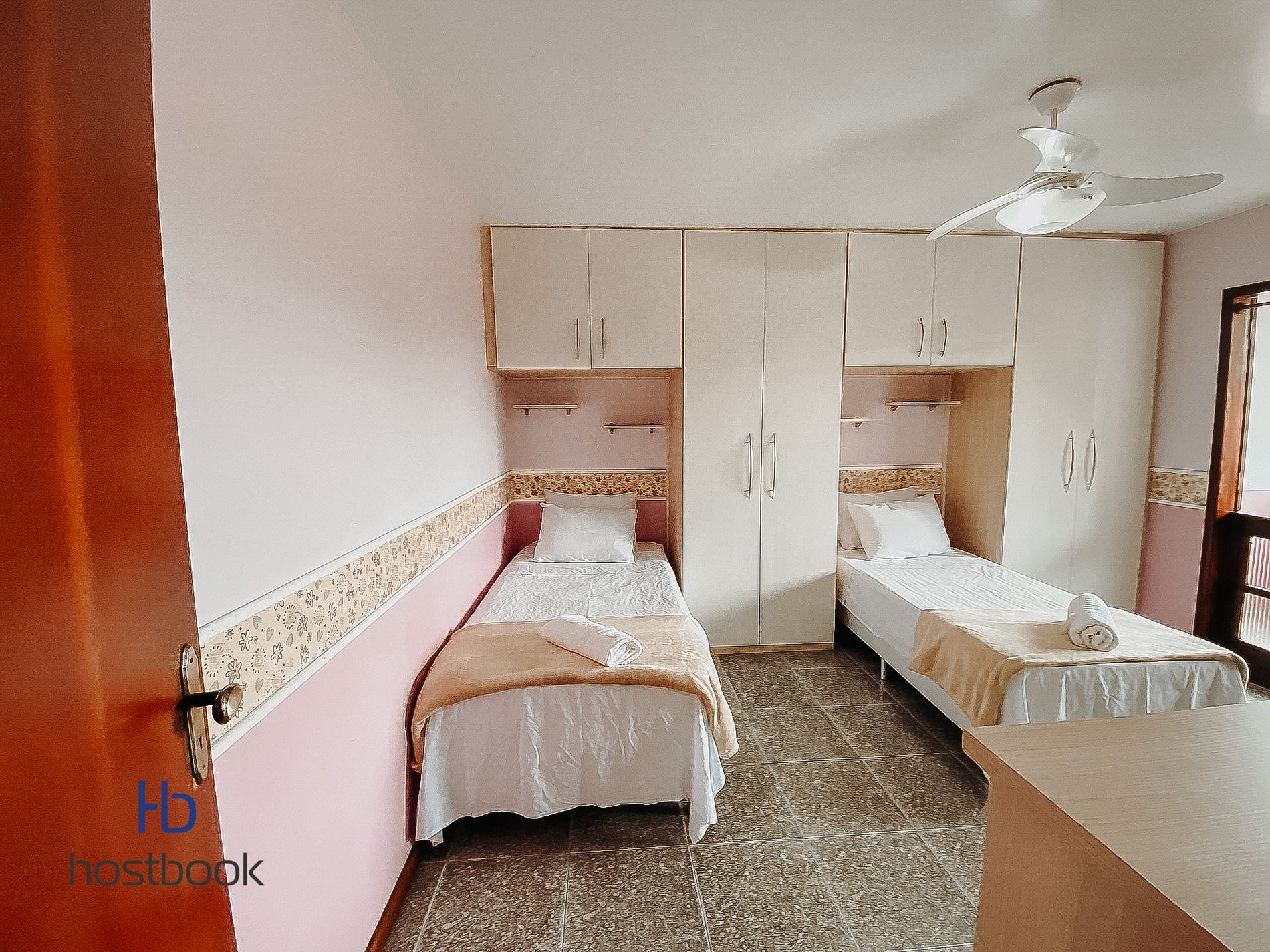 A casa possui 3 quartos. Uma suite master com banheira, ar condicionado e closet. Um quarto com duas camas de solteiro e um quarto com uma cama de casal.