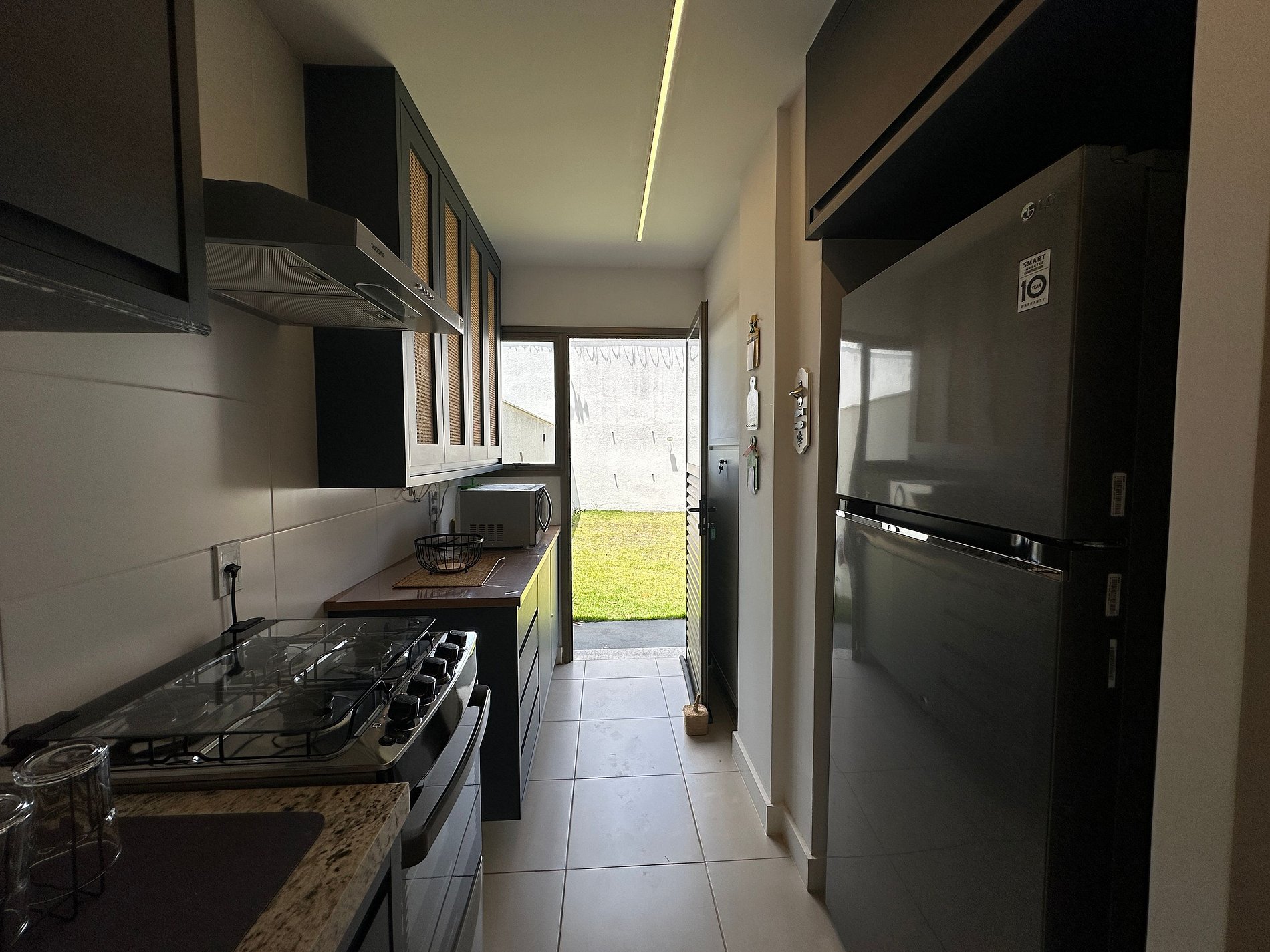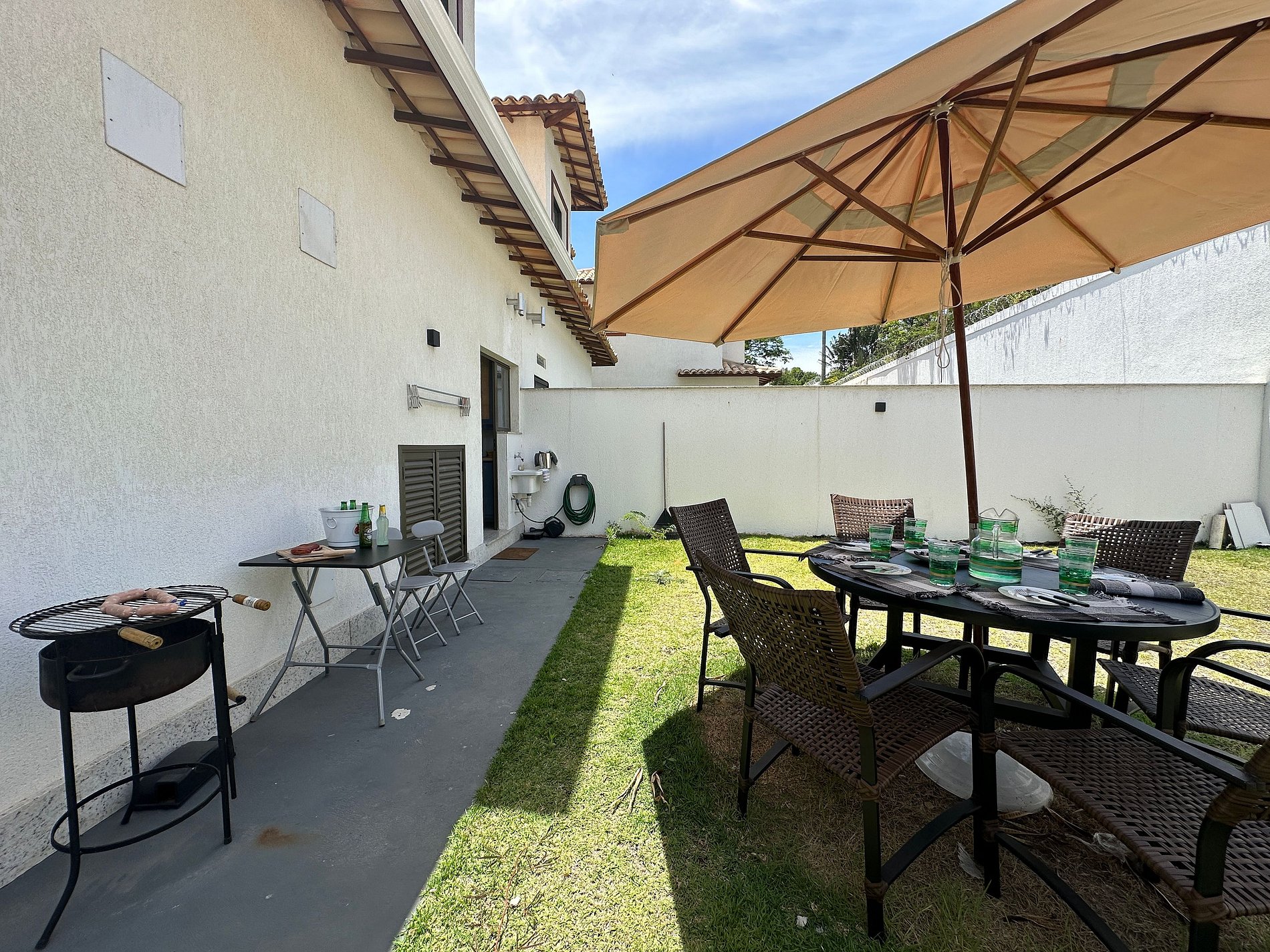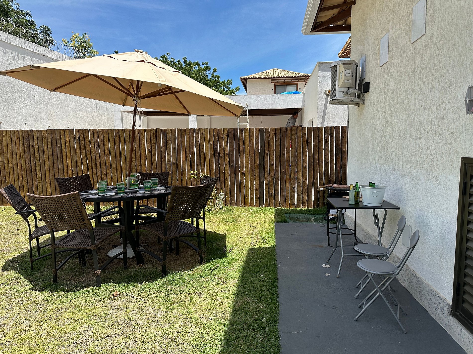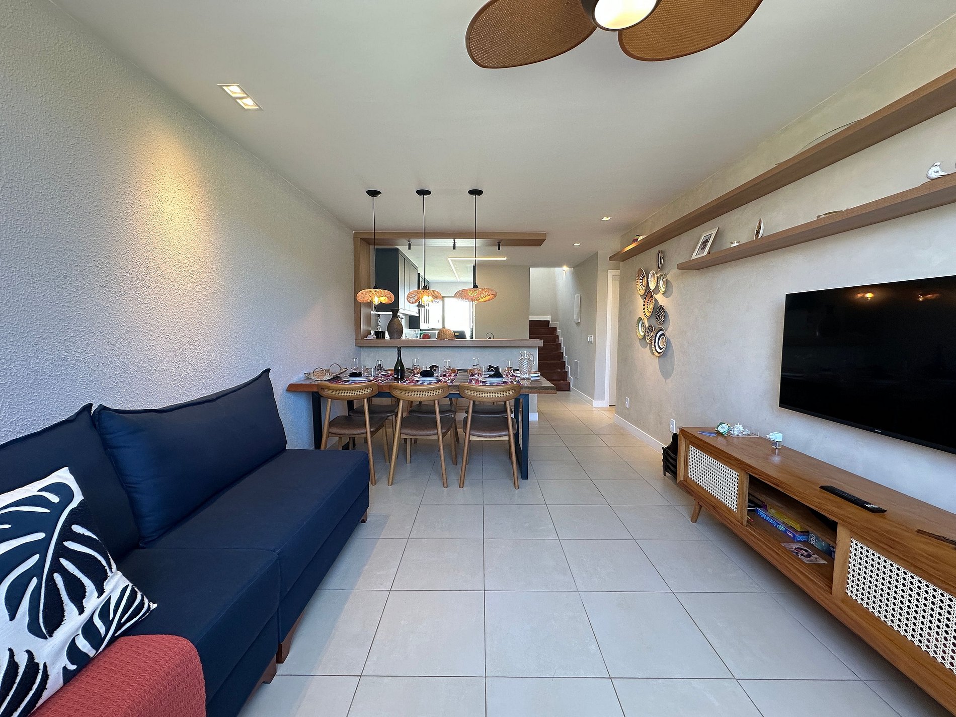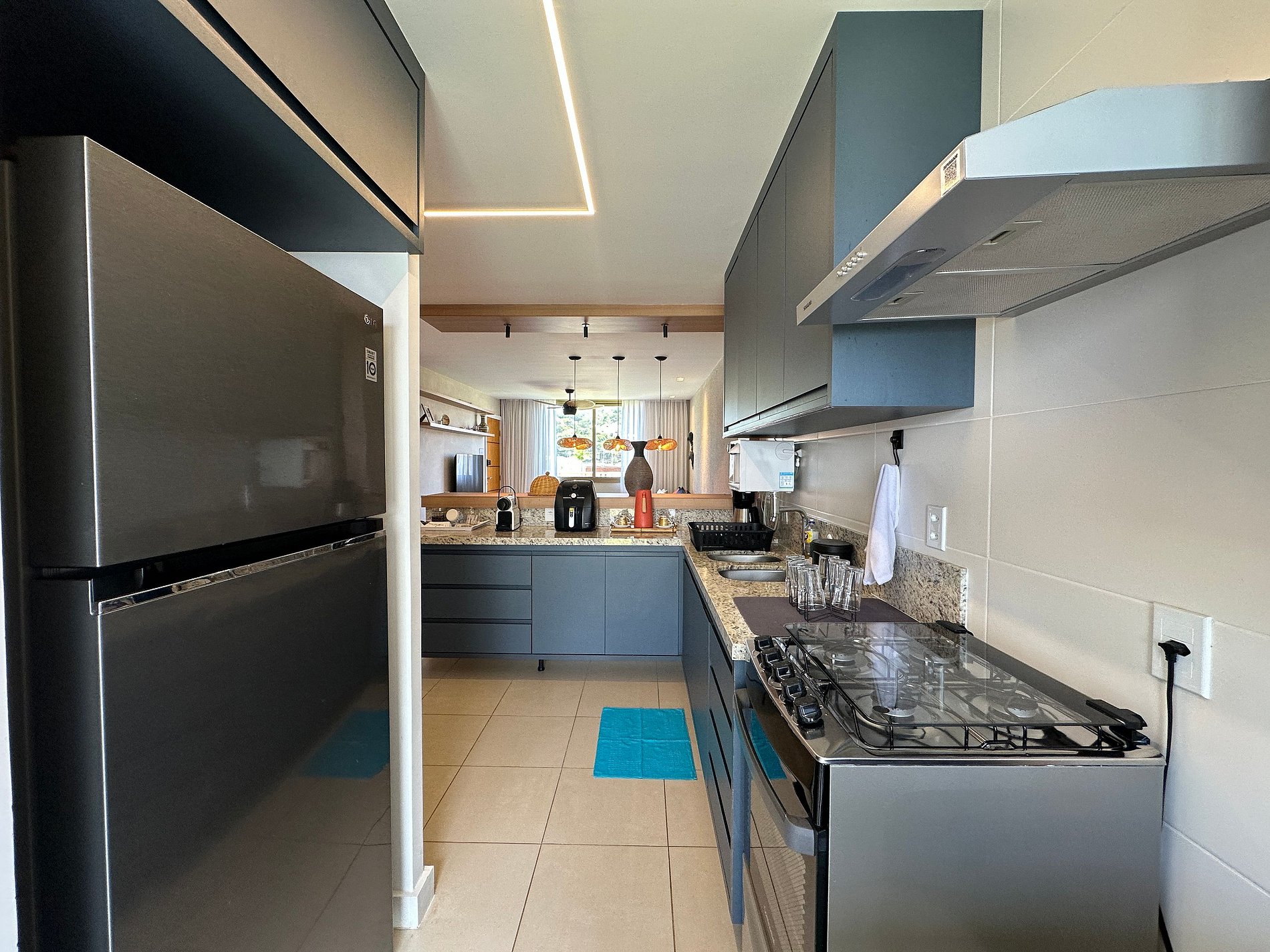 A casa possui 3 quartos, sendo duas suítes e ar-condicionado em todos eles. Com sala ampla e cozinha totalmente equipada, varanda e um quintal amplo com churrasqueira portátil, onde é possível fazer um churrasco em família