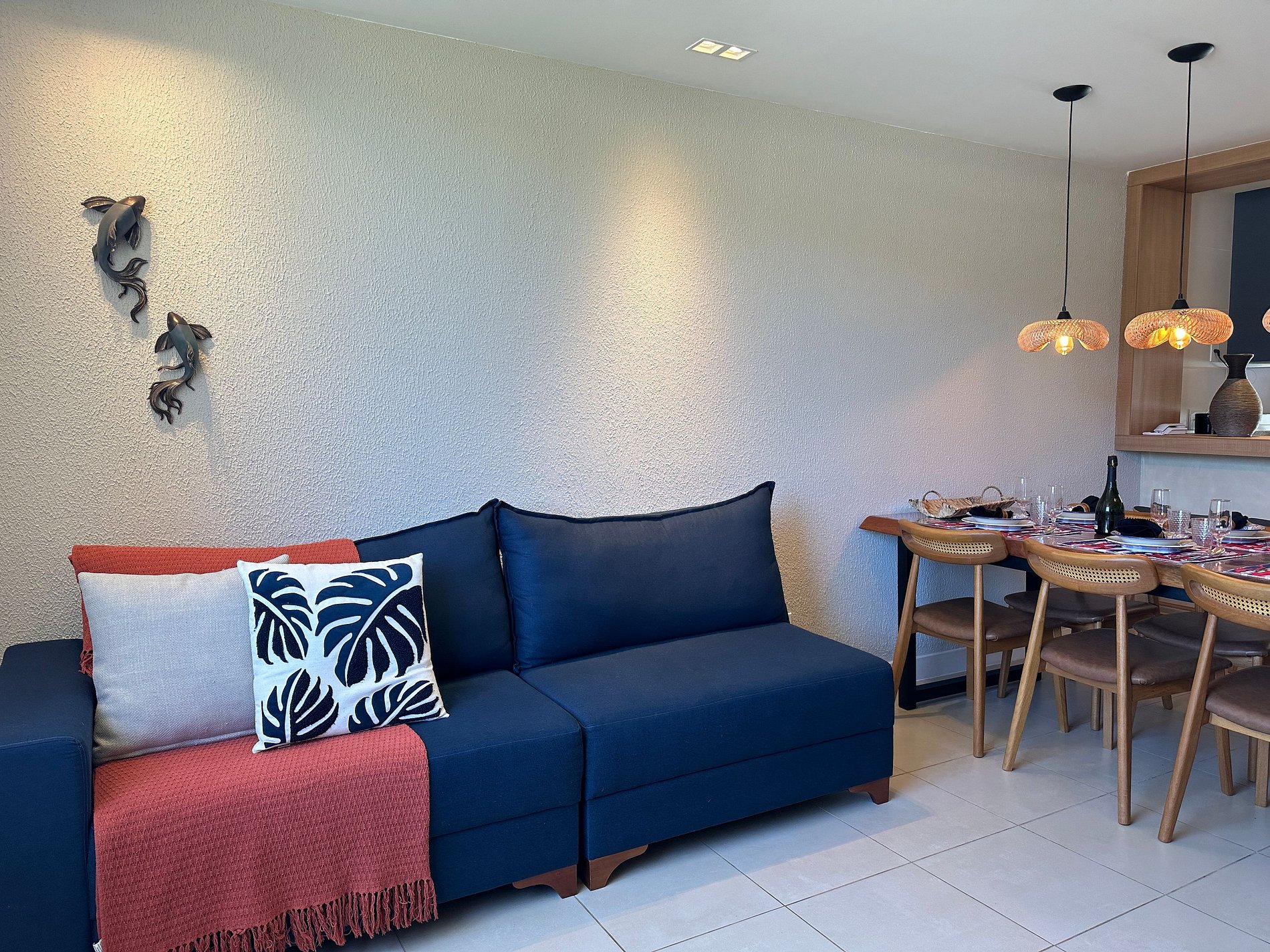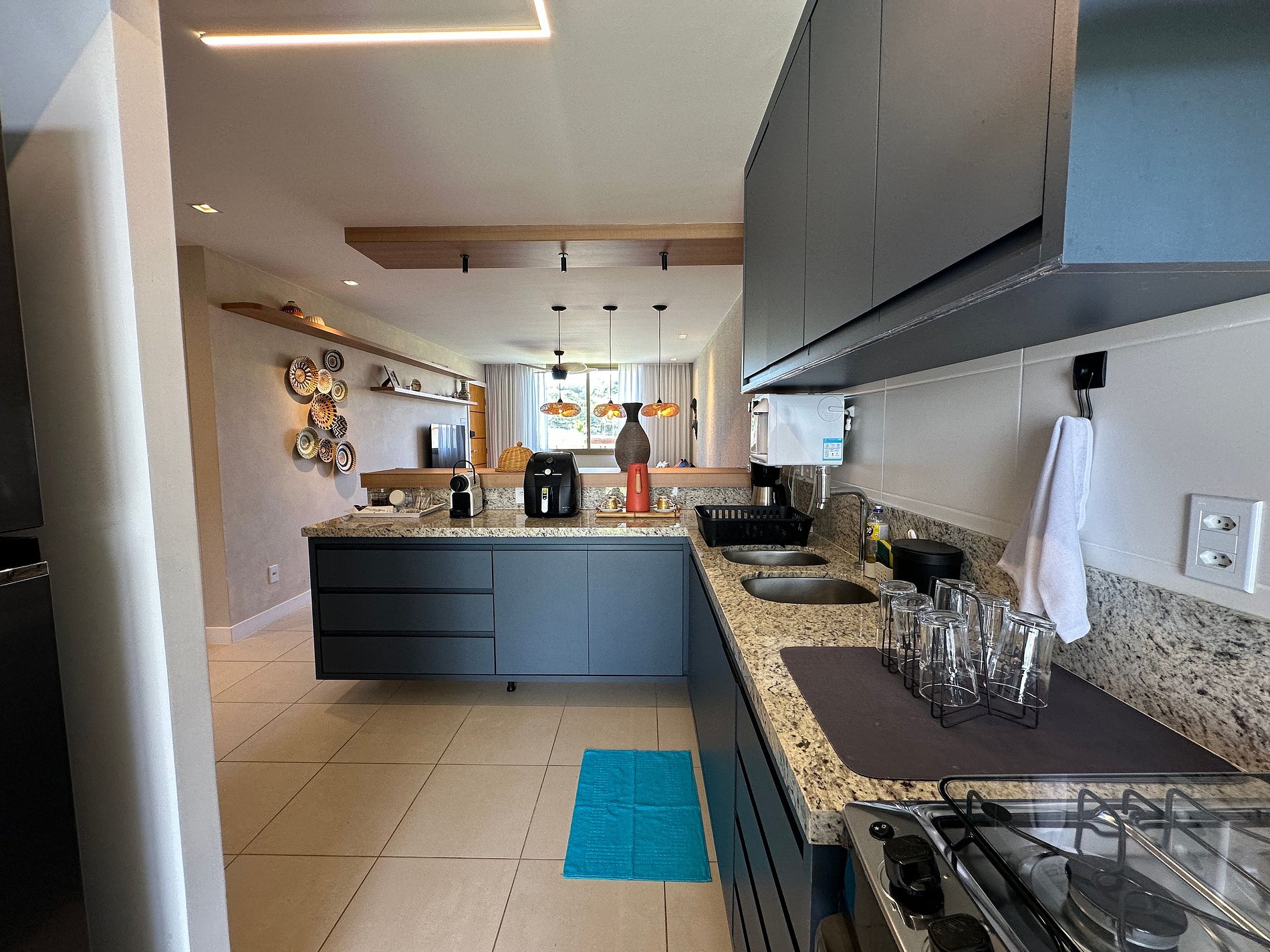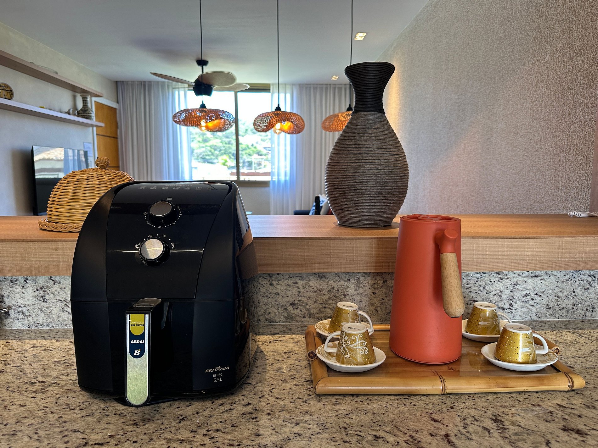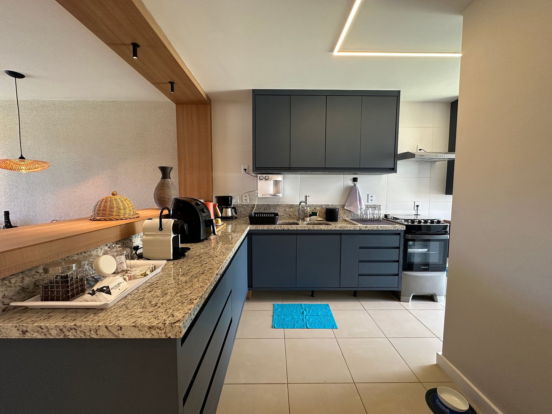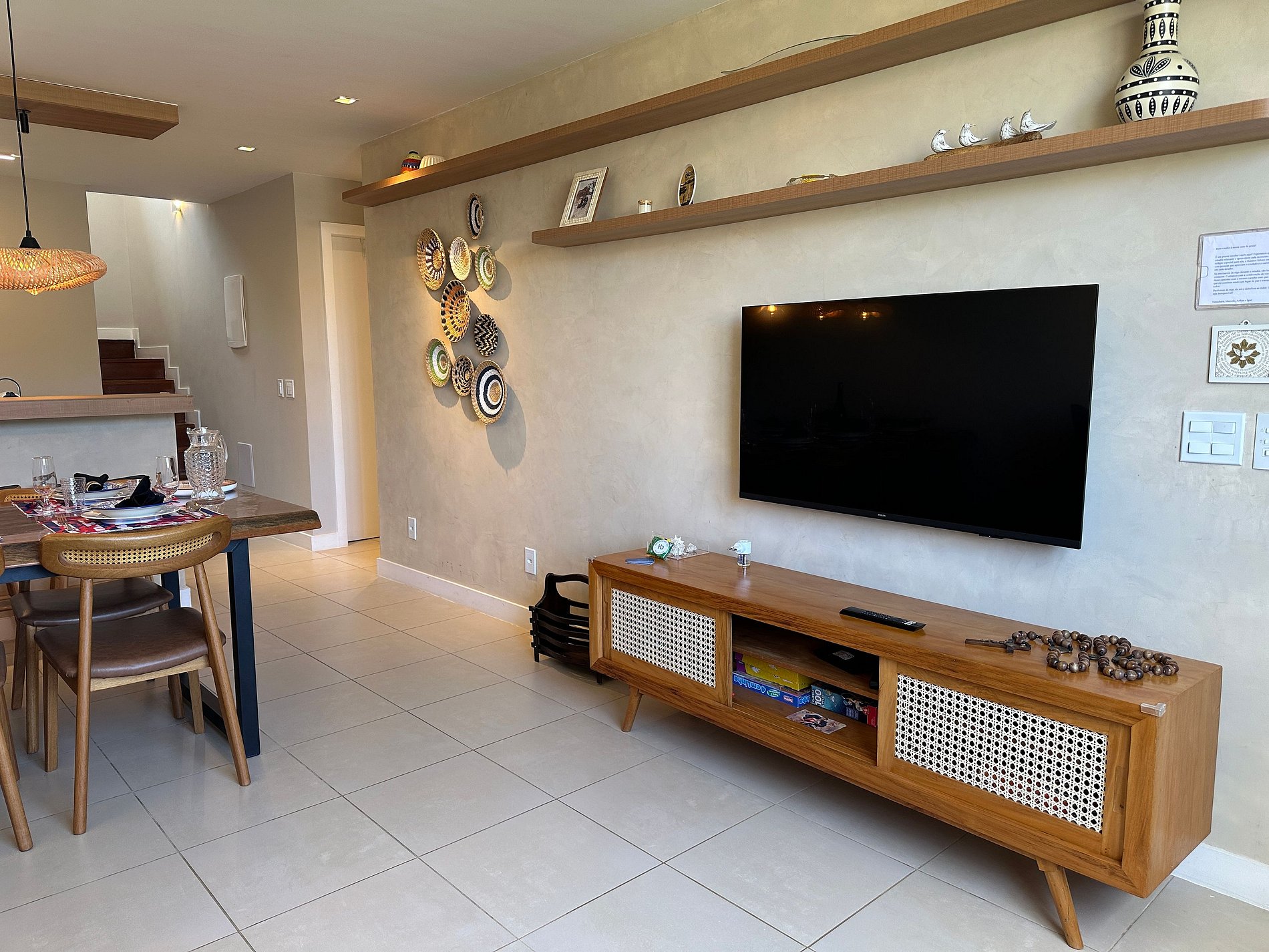 A casa possui 3 quartos, sendo duas suítes e ar-condicionado em todos eles. Com sala ampla e cozinha totalmente equipada, varanda e um quintal amplo com churrasqueira portátil, onde é possível fazer um churrasco em família