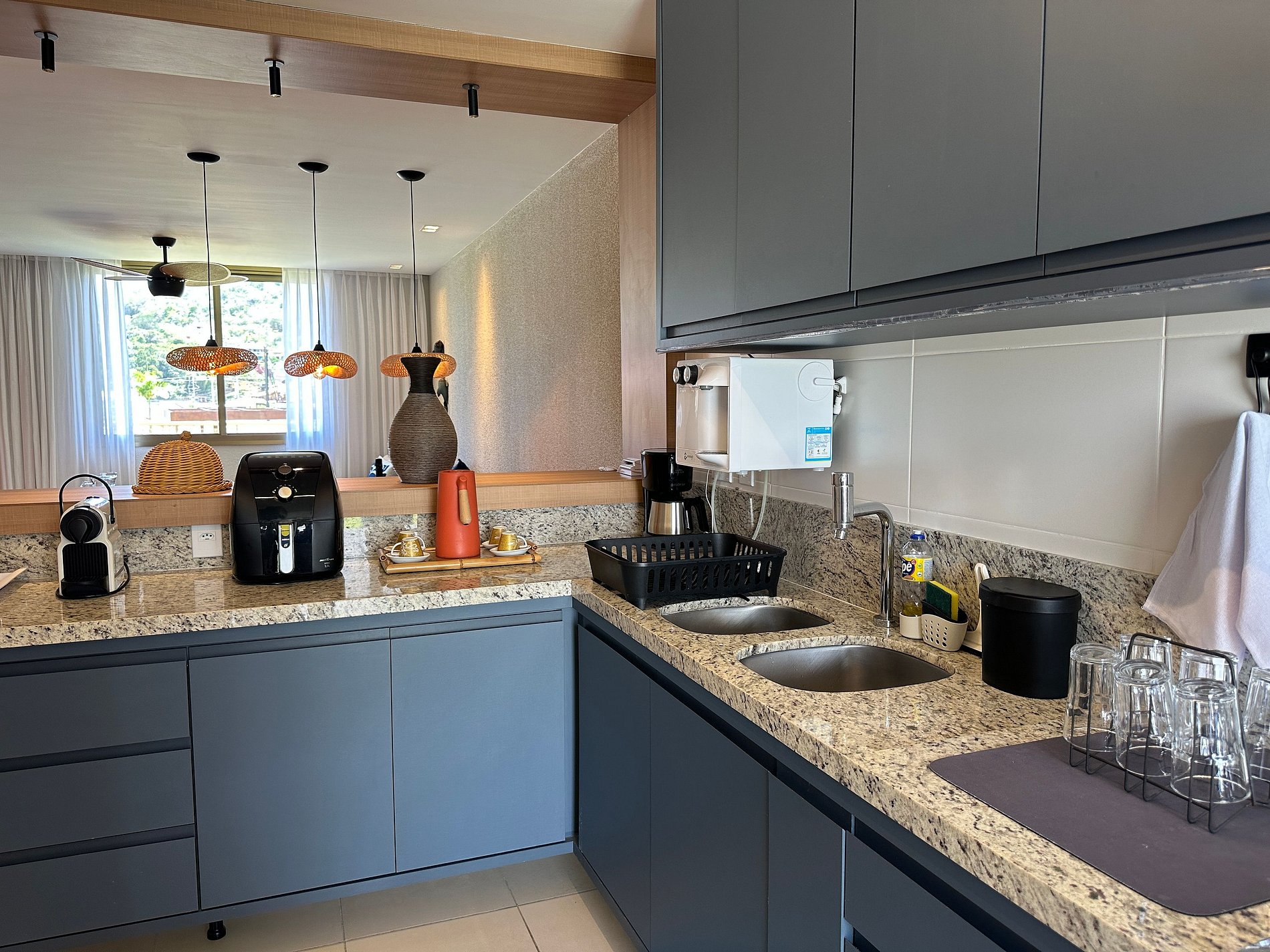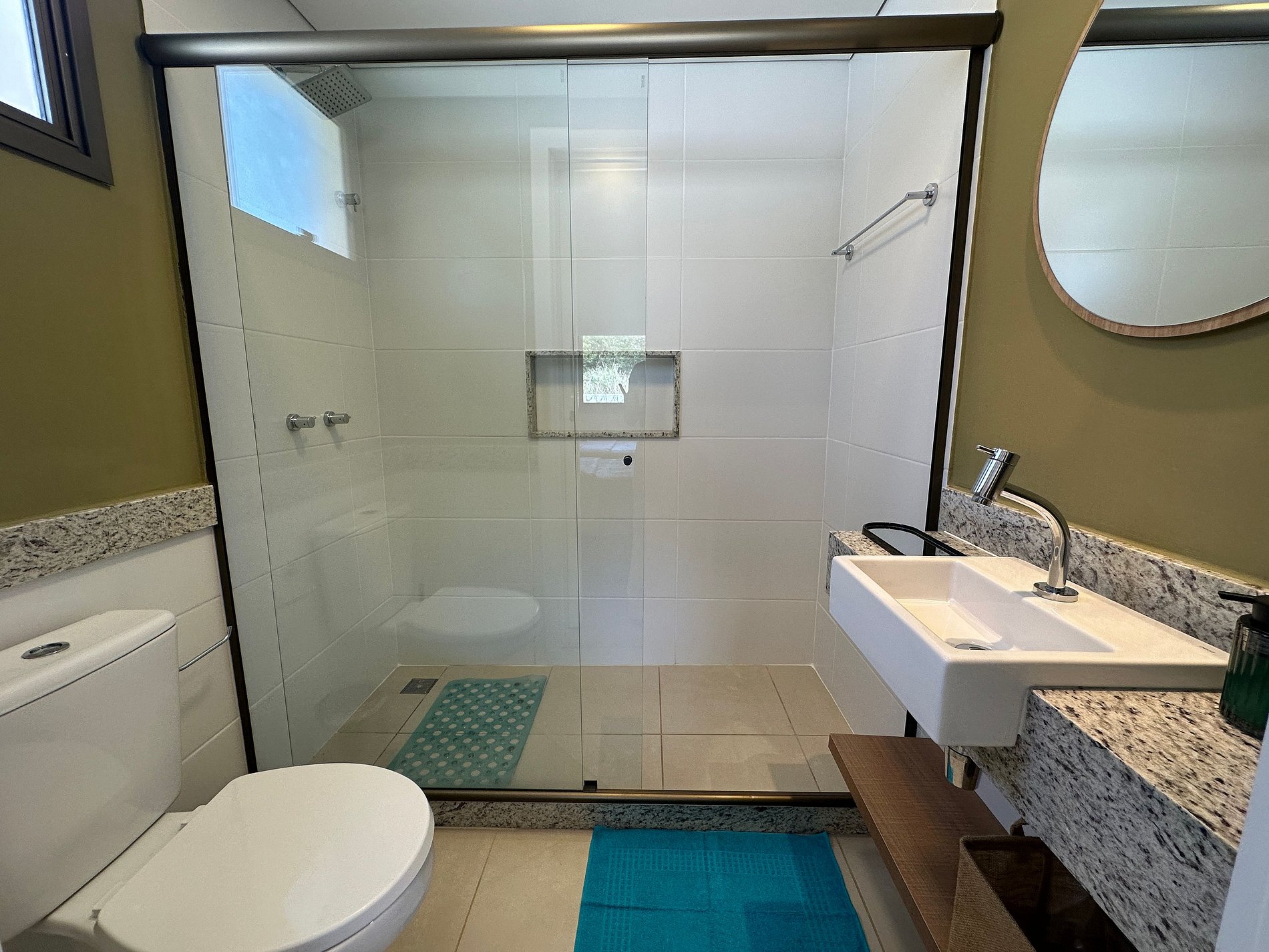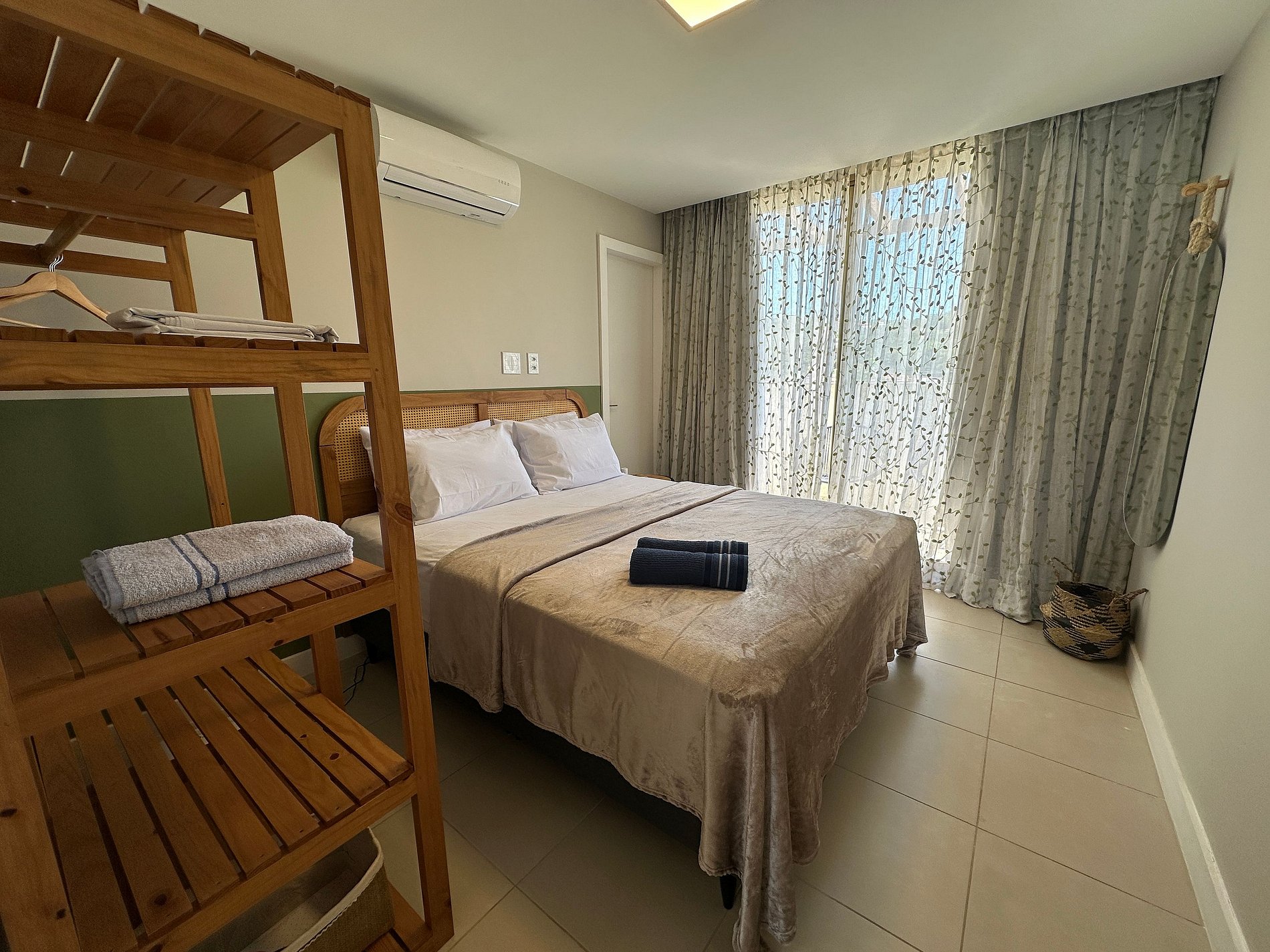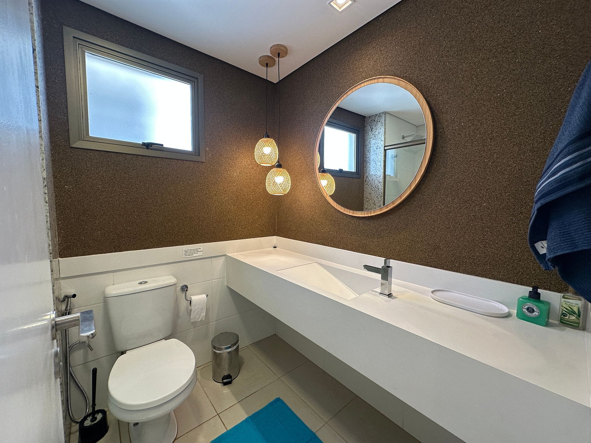A casa possui 3 quartos, sendo duas suítes e ar-condicionado em todos eles. Com sala ampla e cozinha totalmente equipada, varanda e um quintal amplo com churrasqueira portátil, onde é possível fazer um churrasco em família