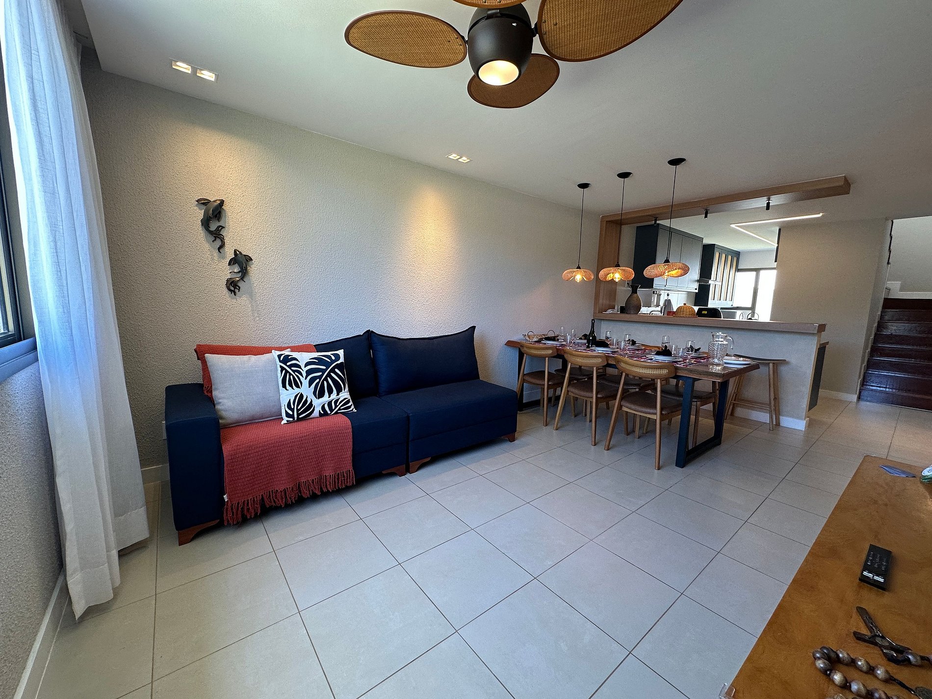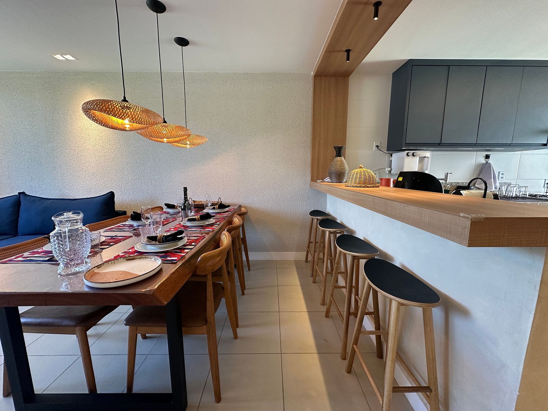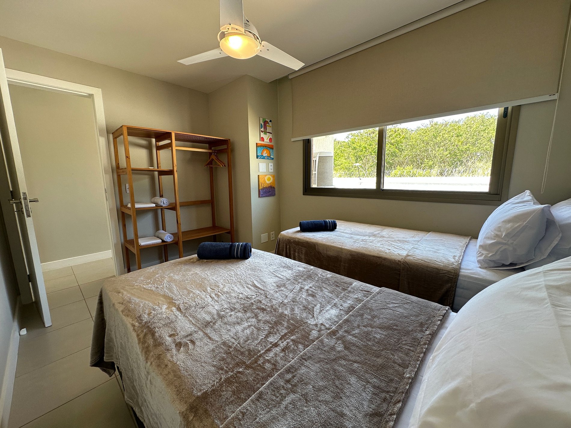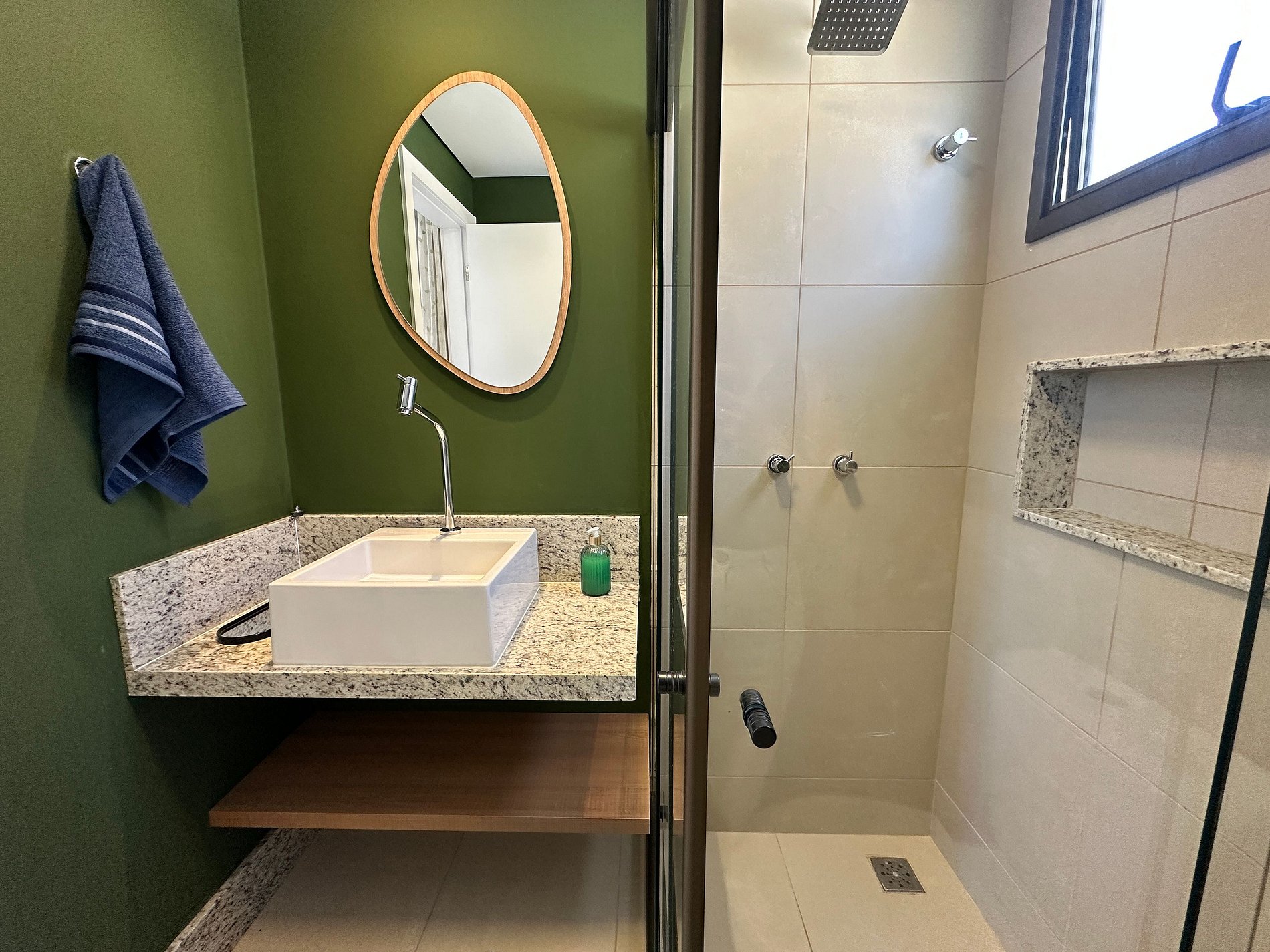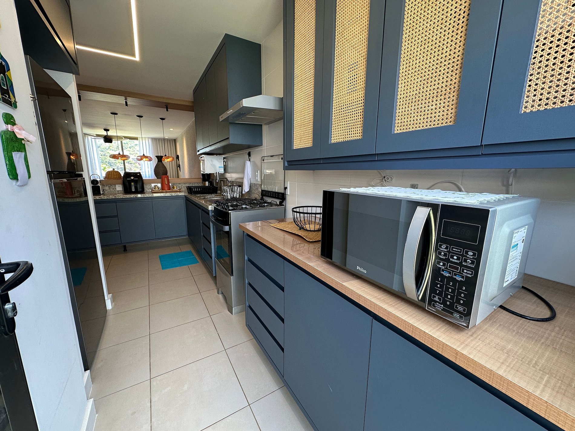 A casa possui 3 quartos, sendo duas suítes e ar-condicionado em todos eles. Com sala ampla e cozinha totalmente equipada, varanda e um quintal amplo com churrasqueira portátil, onde é possível fazer um churrasco em família
