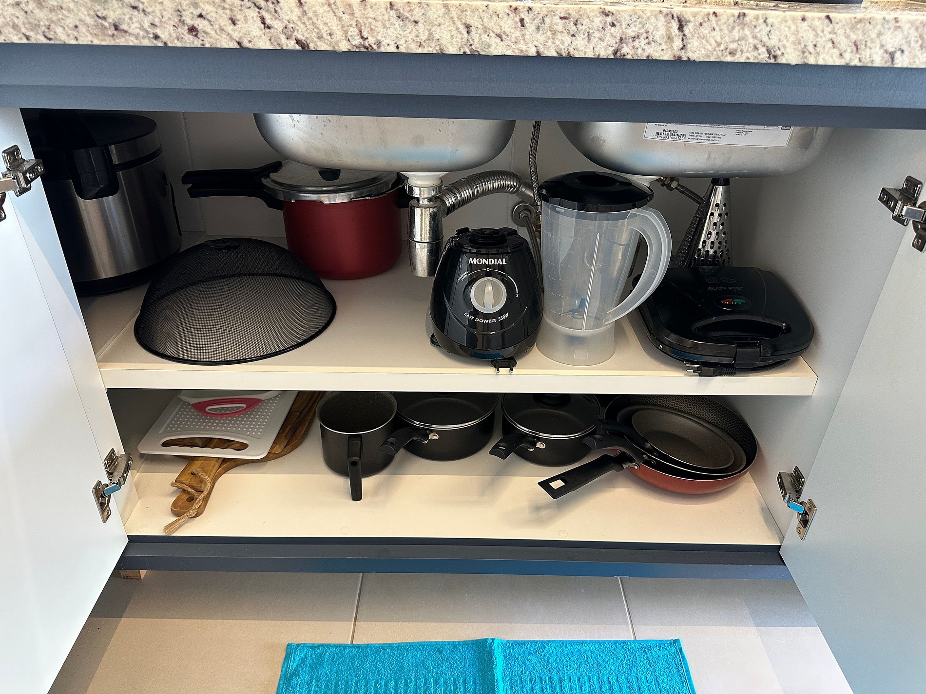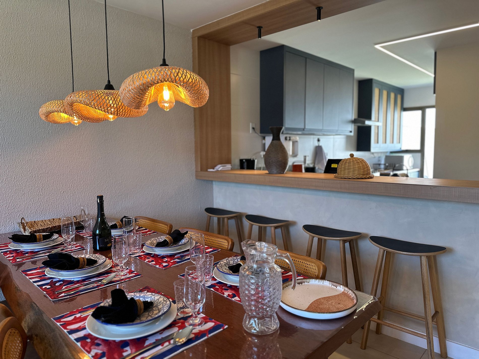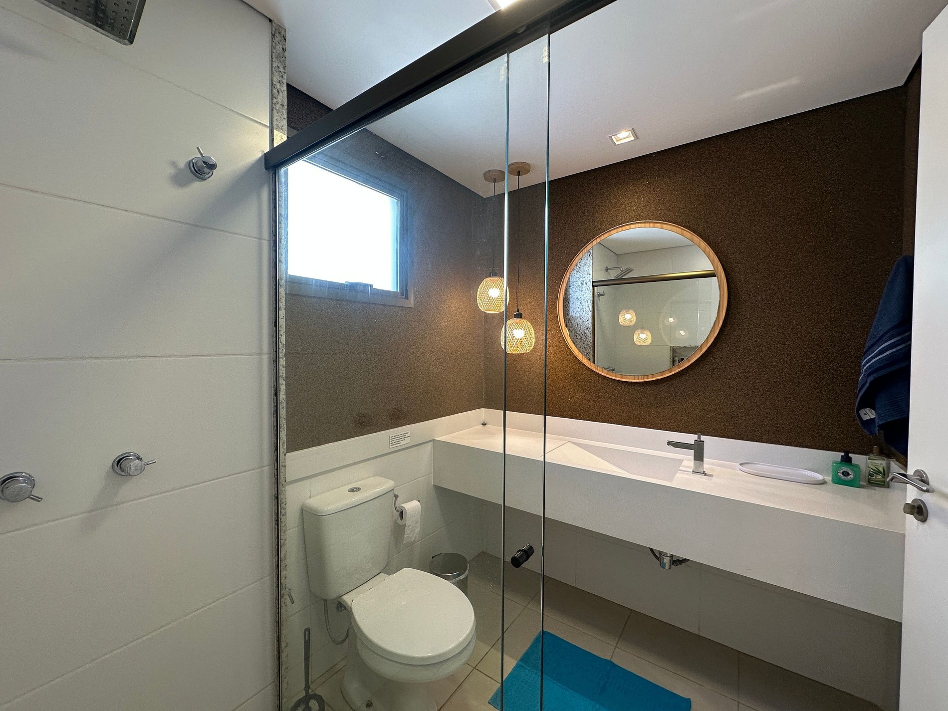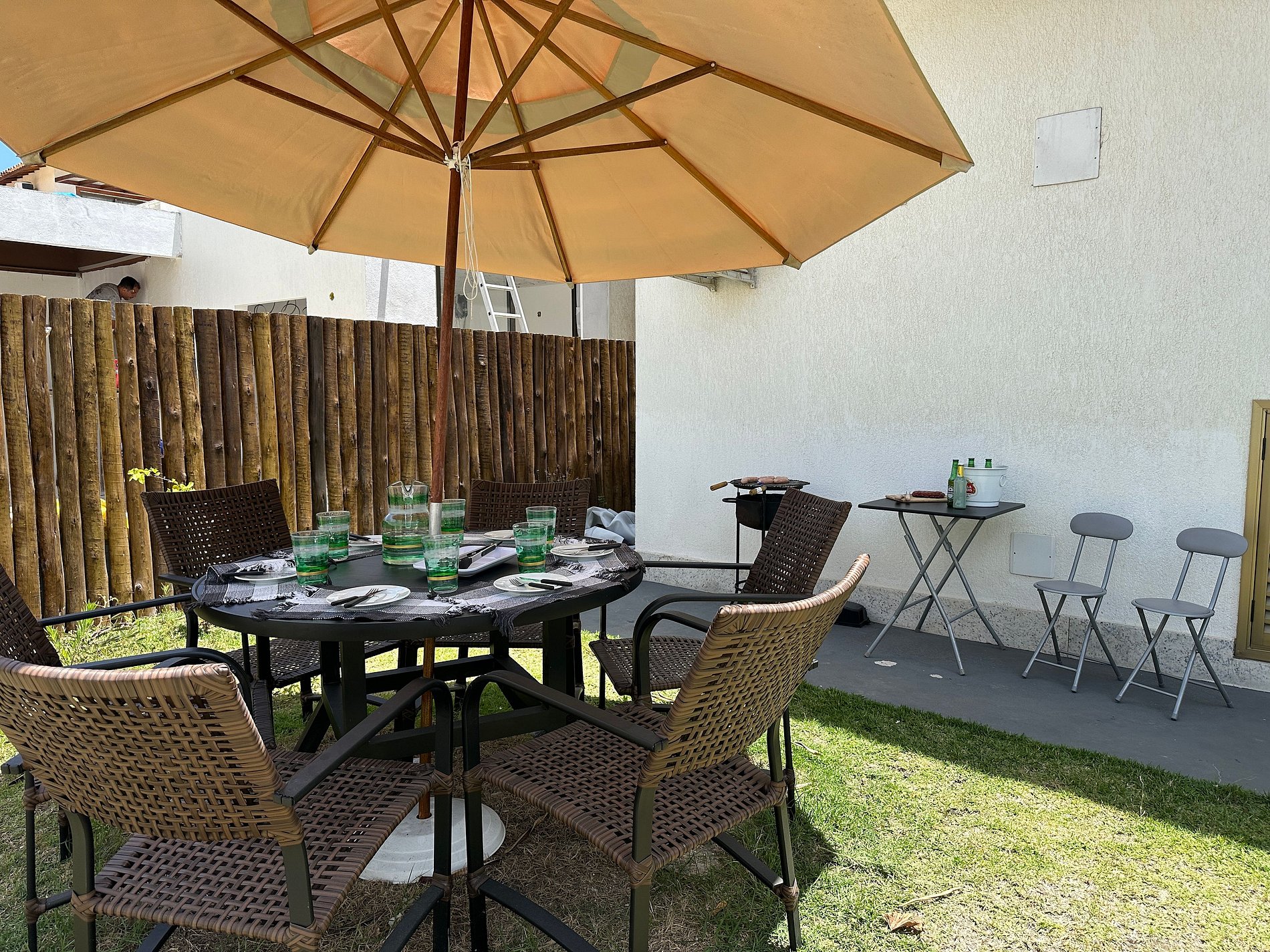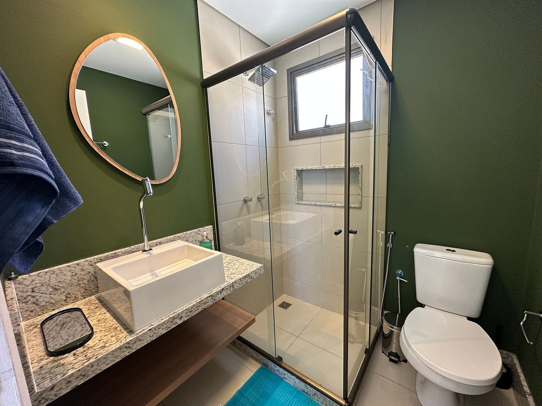 A casa possui 3 quartos, sendo duas suítes e ar-condicionado em todos eles. Com sala ampla e cozinha totalmente equipada, varanda e um quintal amplo com churrasqueira portátil, onde é possível fazer um churrasco em família