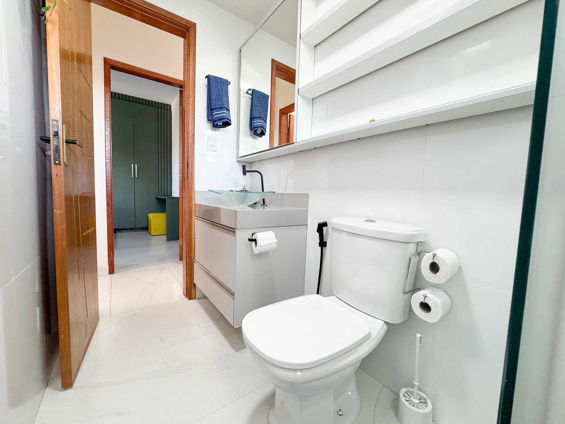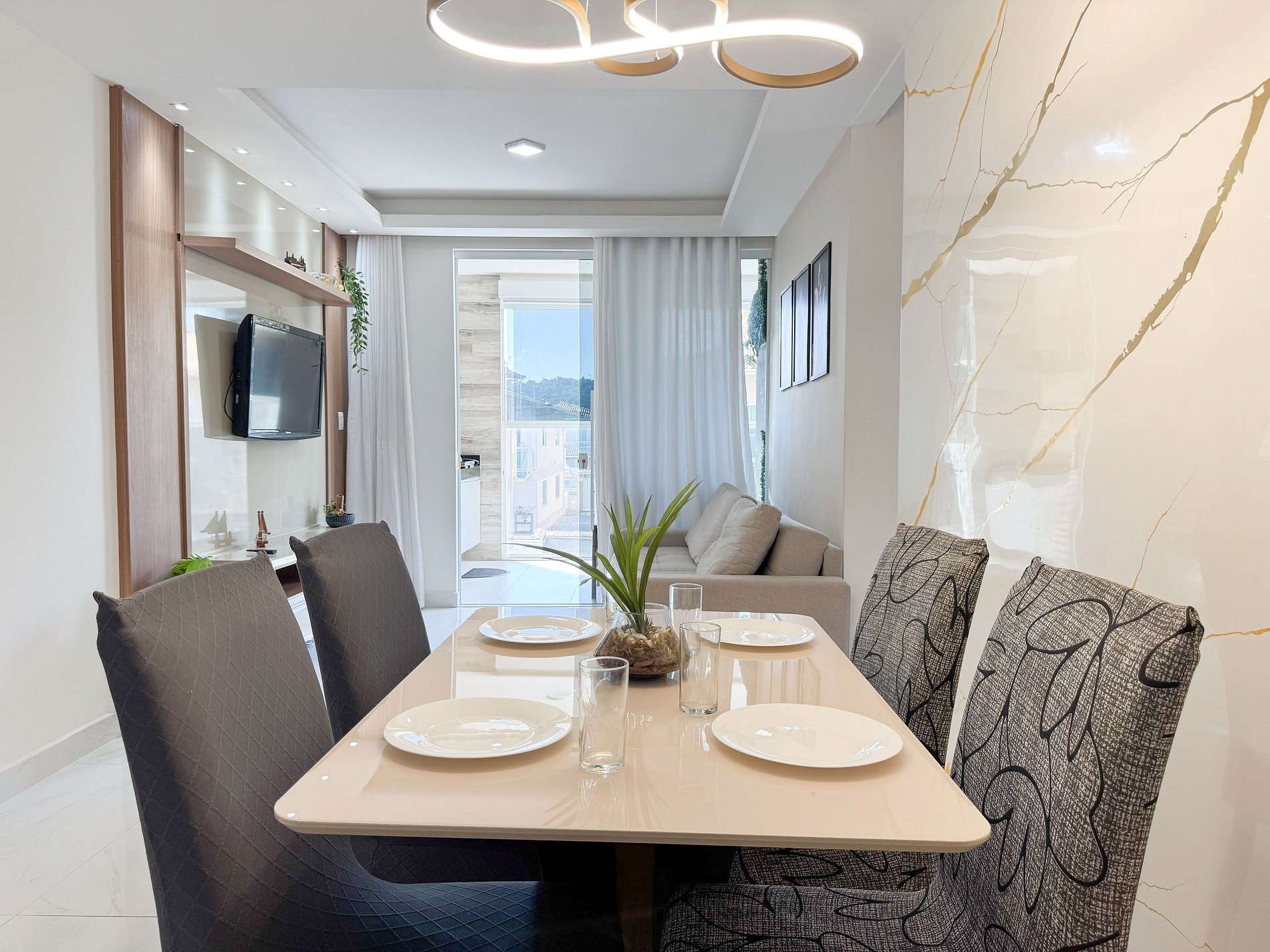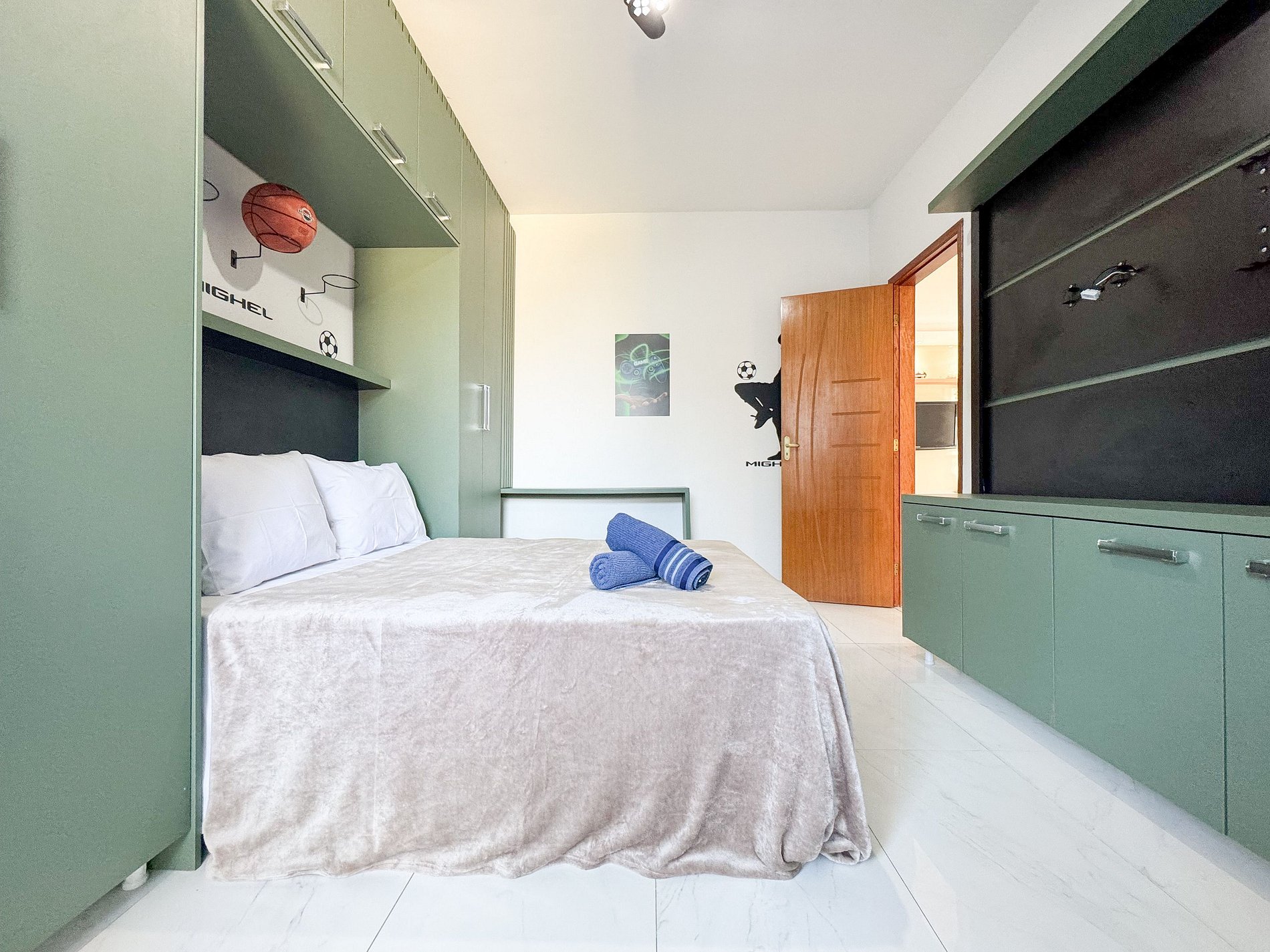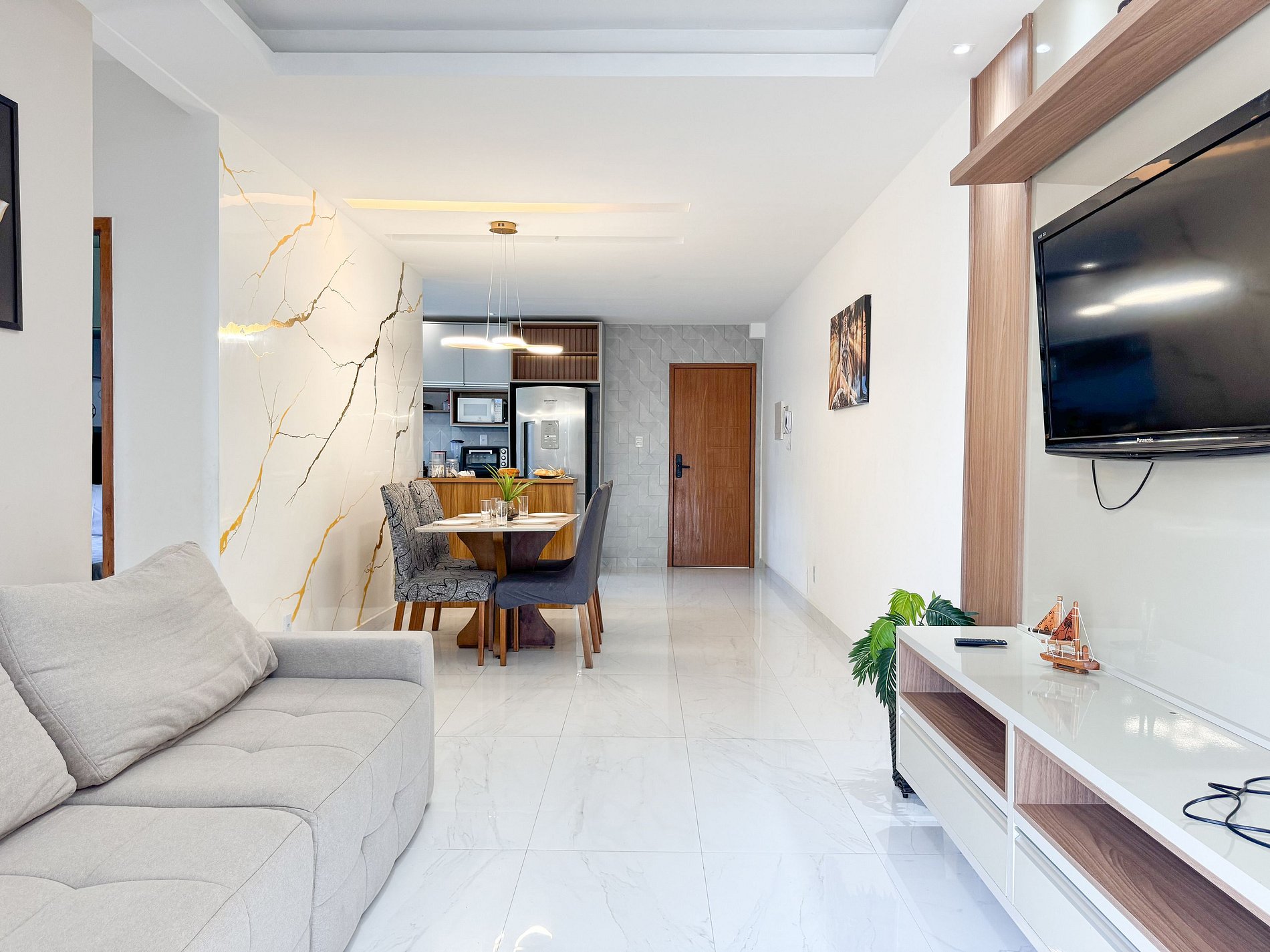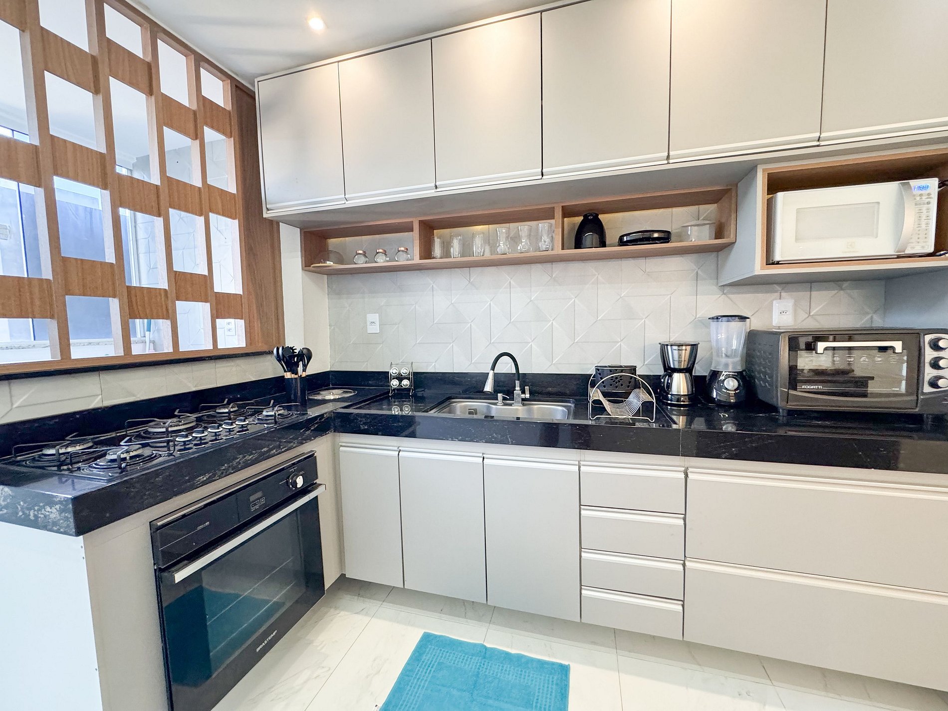 O apartamento possui 2 quartos com ar condicionado, sendo uma suíte, 1 banheiro, sala aconchegante com TV smart e mesa para jantar. Cozinha completa com todos os tipos de utensílios e panelas.
