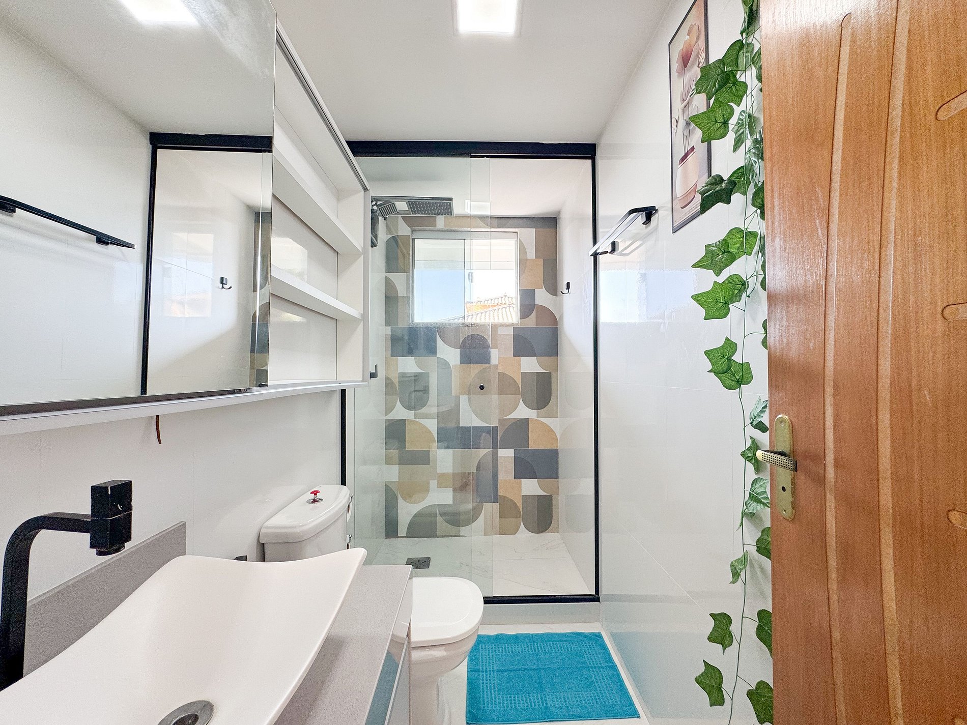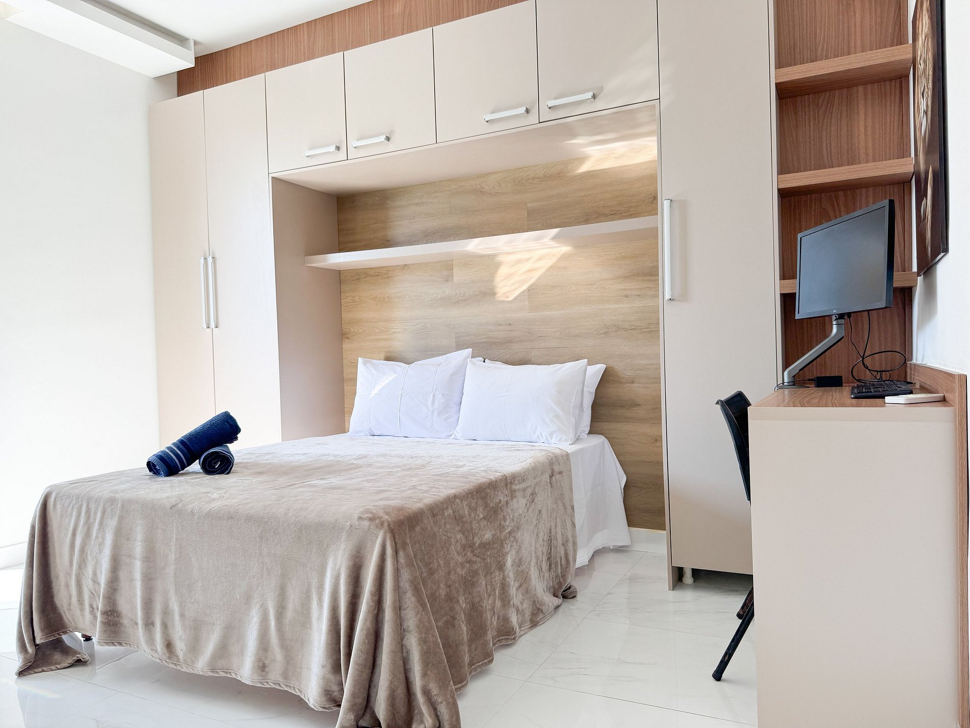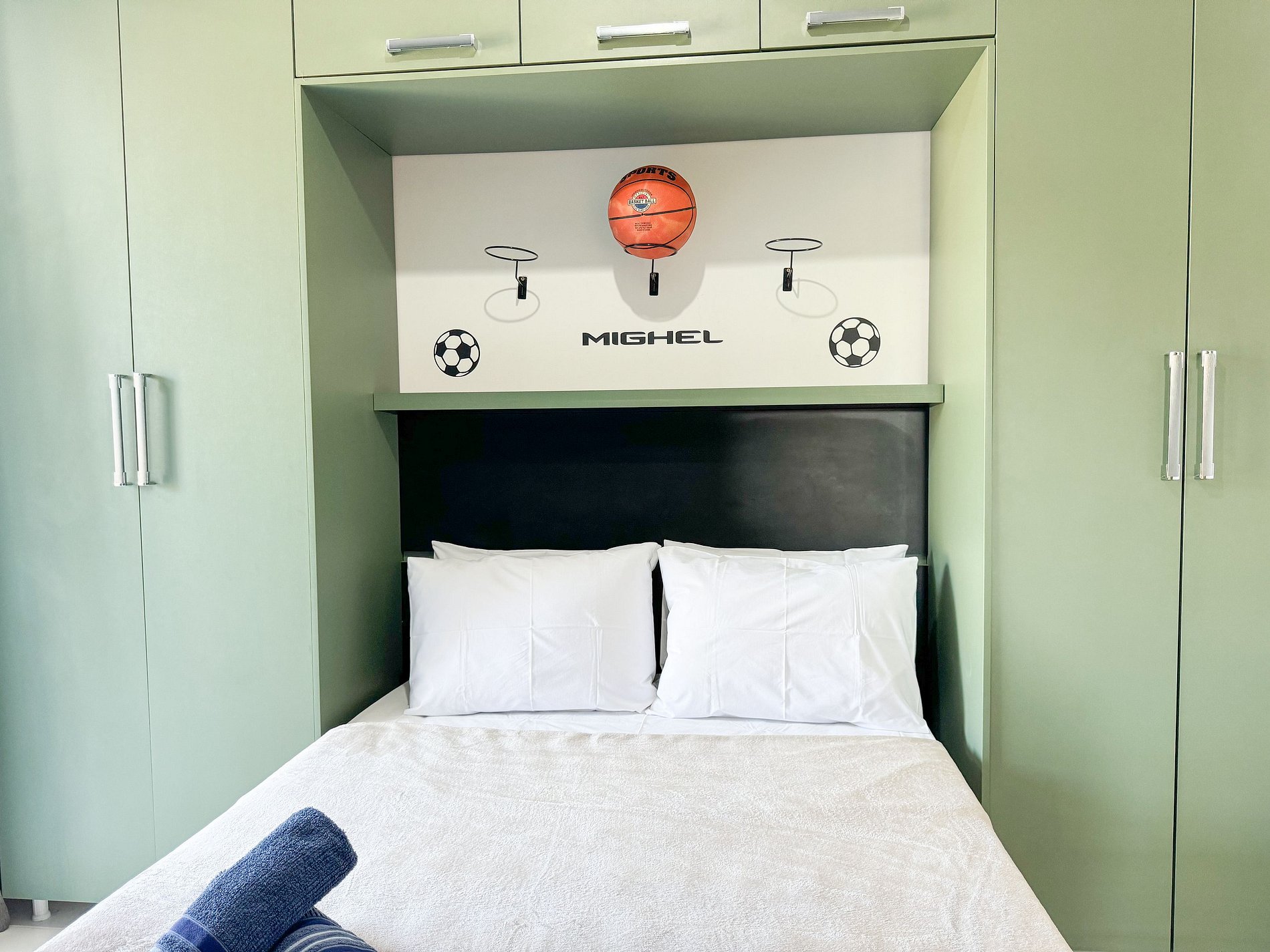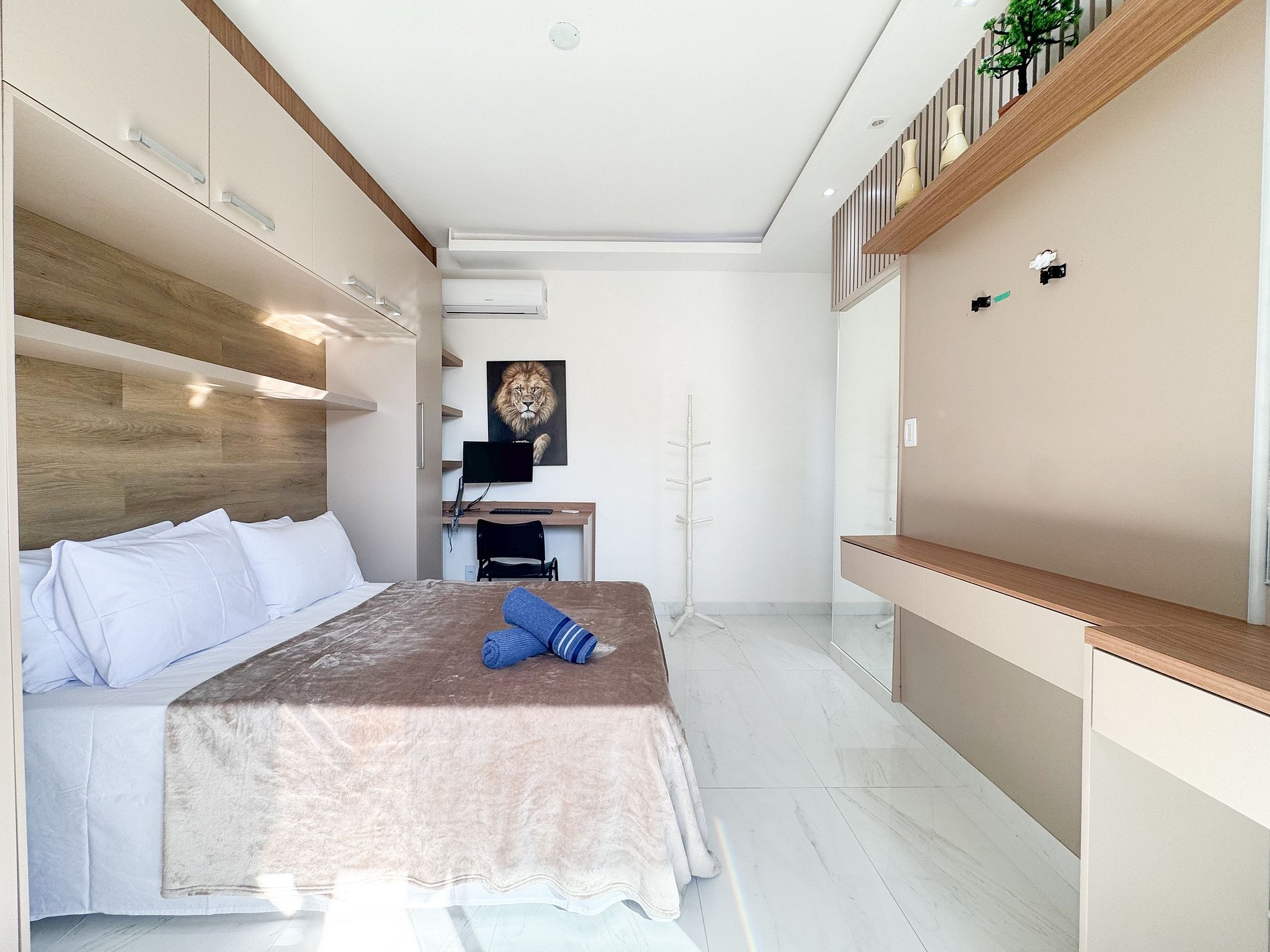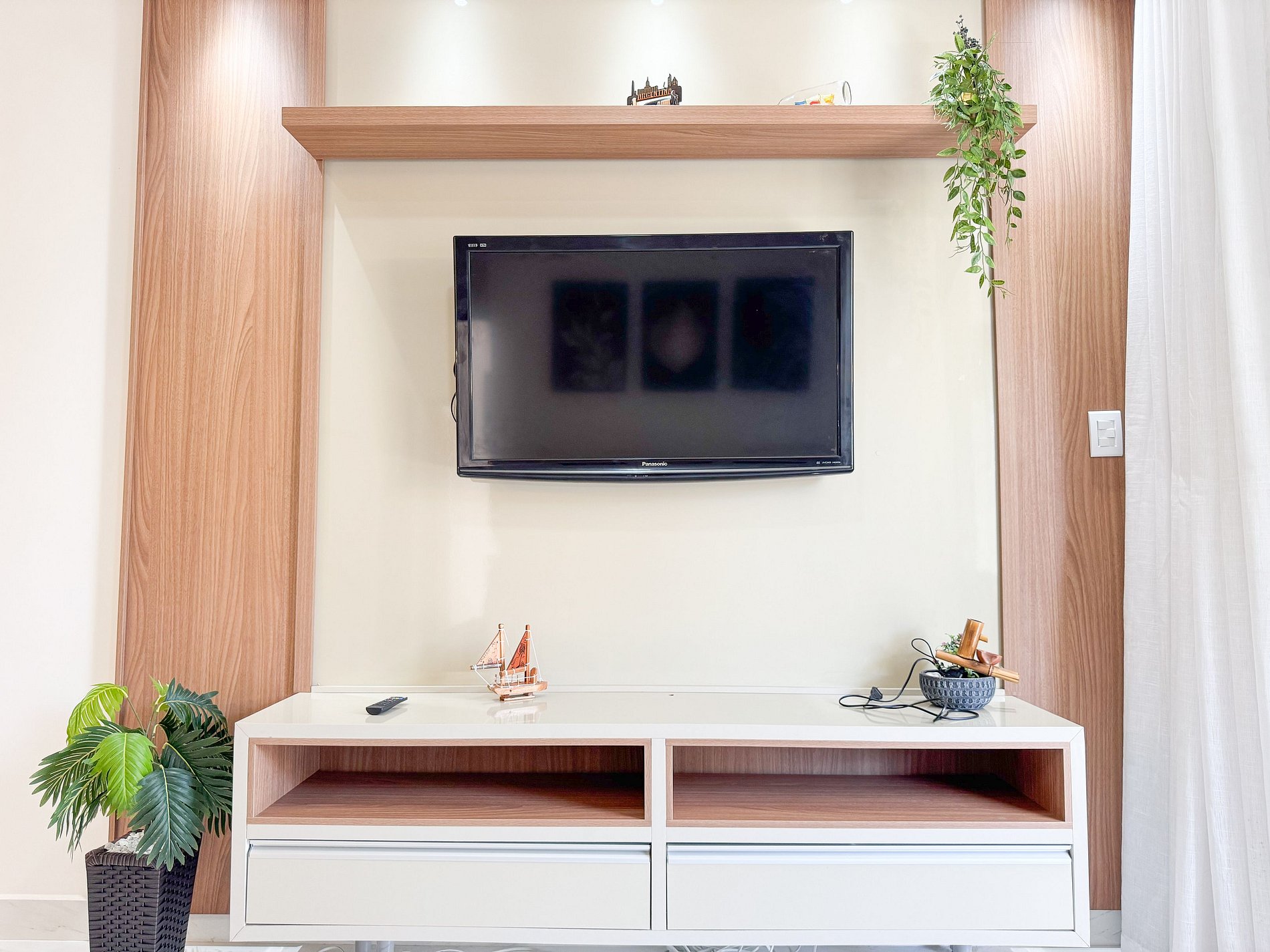 O apartamento possui 2 quartos com ar condicionado, sendo uma suíte, 1 banheiro, sala aconchegante com TV smart e mesa para jantar. Cozinha completa com todos os tipos de utensílios e panelas.