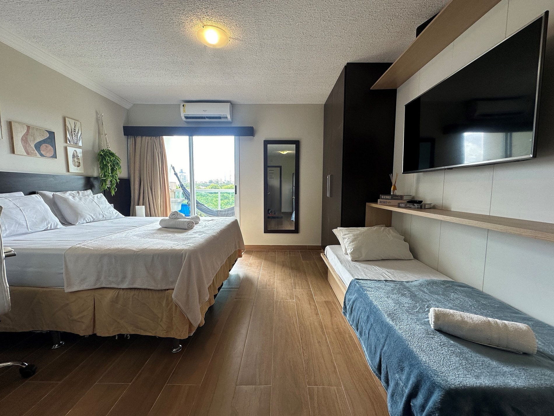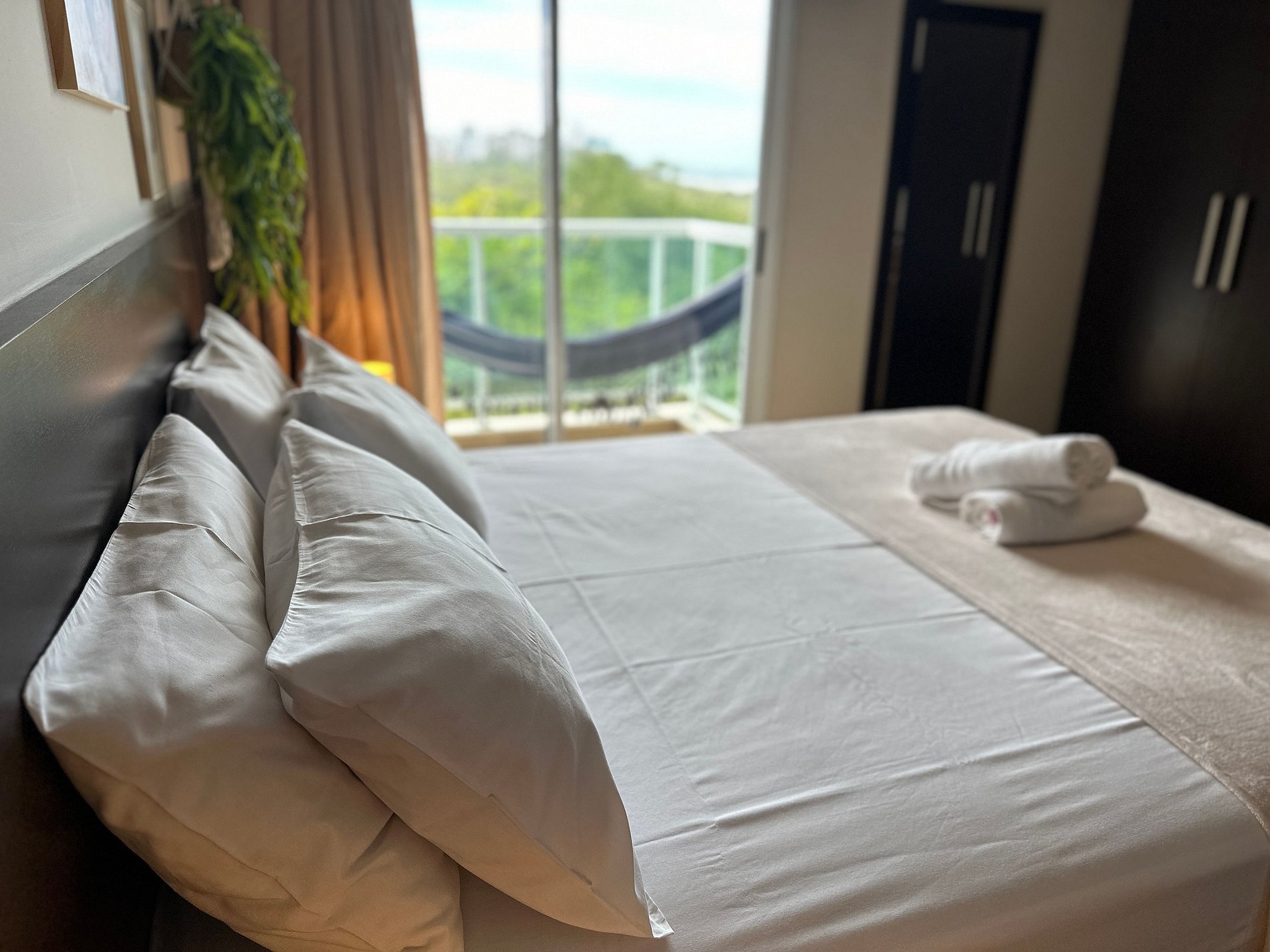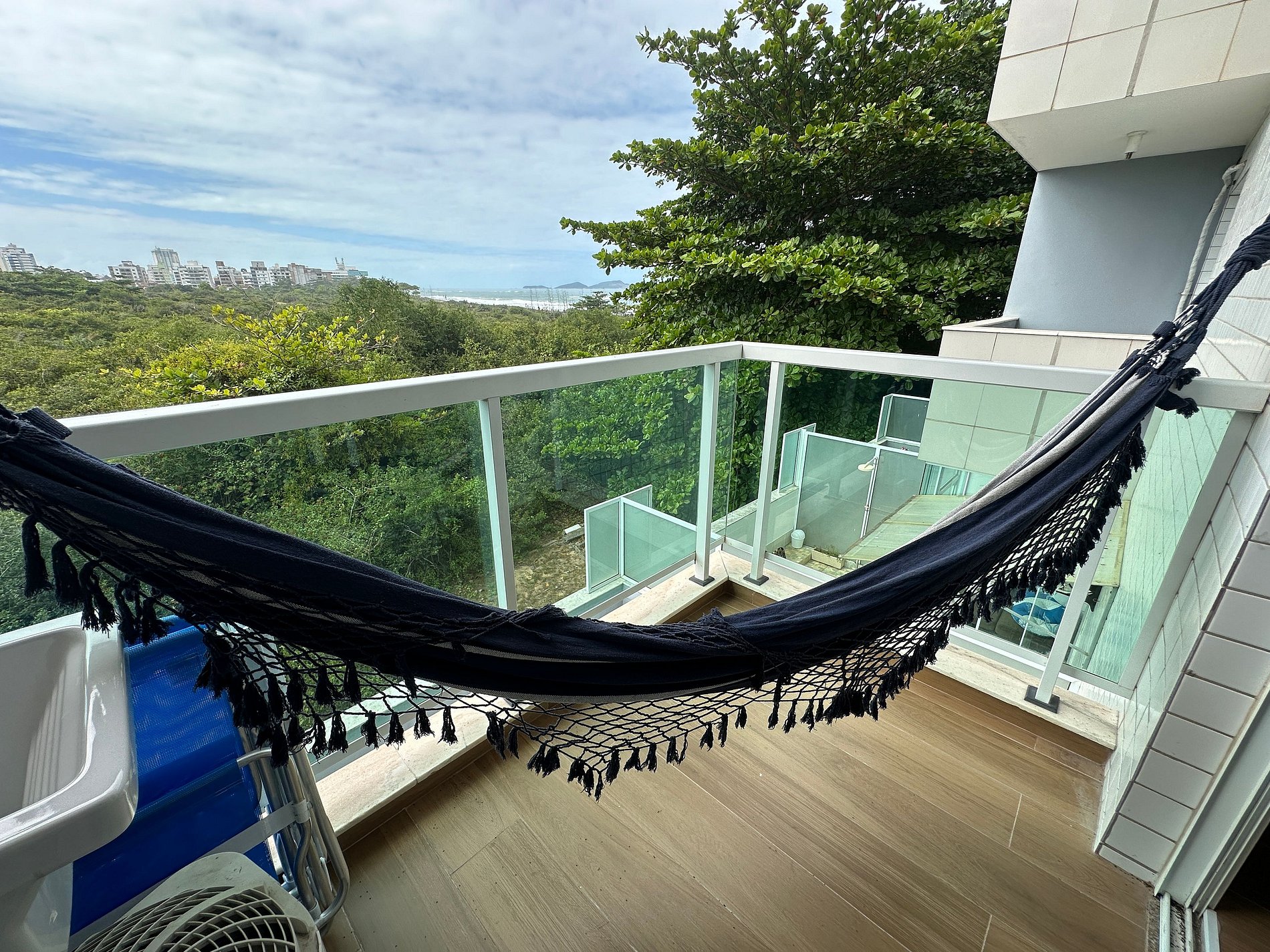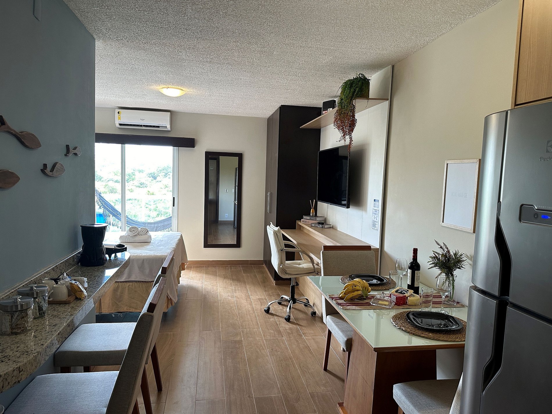 O loft possui uma cama Queen de alto padrão e uma cama de solteiro dobrável que vira uma mesa de escritório, armário, banheiro amplo e cozinha compacta com todos os itens essenciais para cozinhar. Vista para a Restinga e para o mar. No prédio é permitido utilizar a piscina, a sauna e os serviços extras.