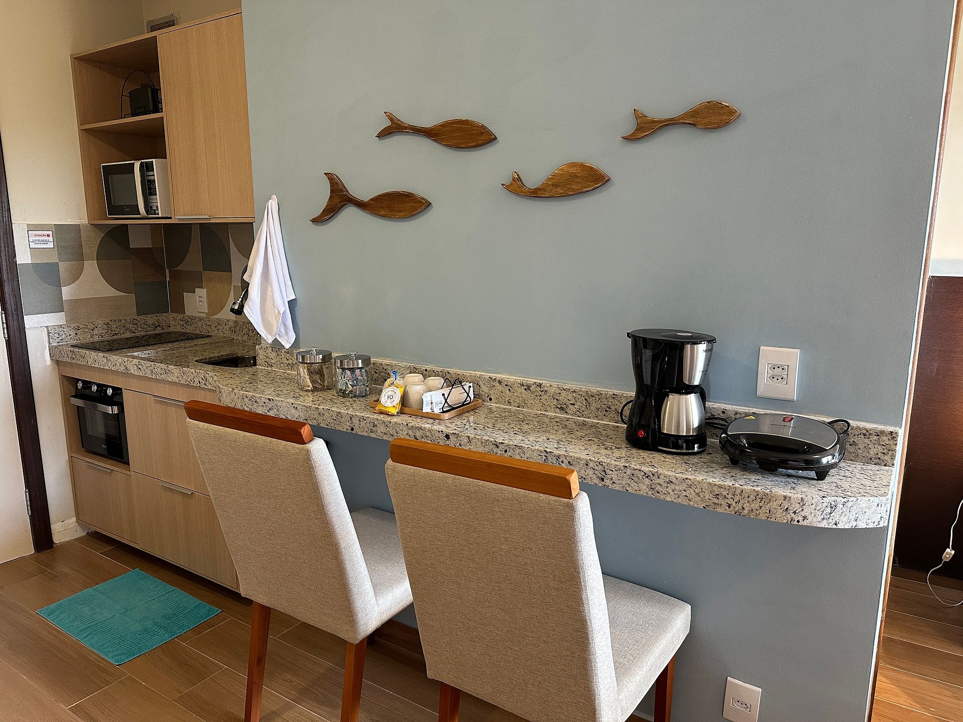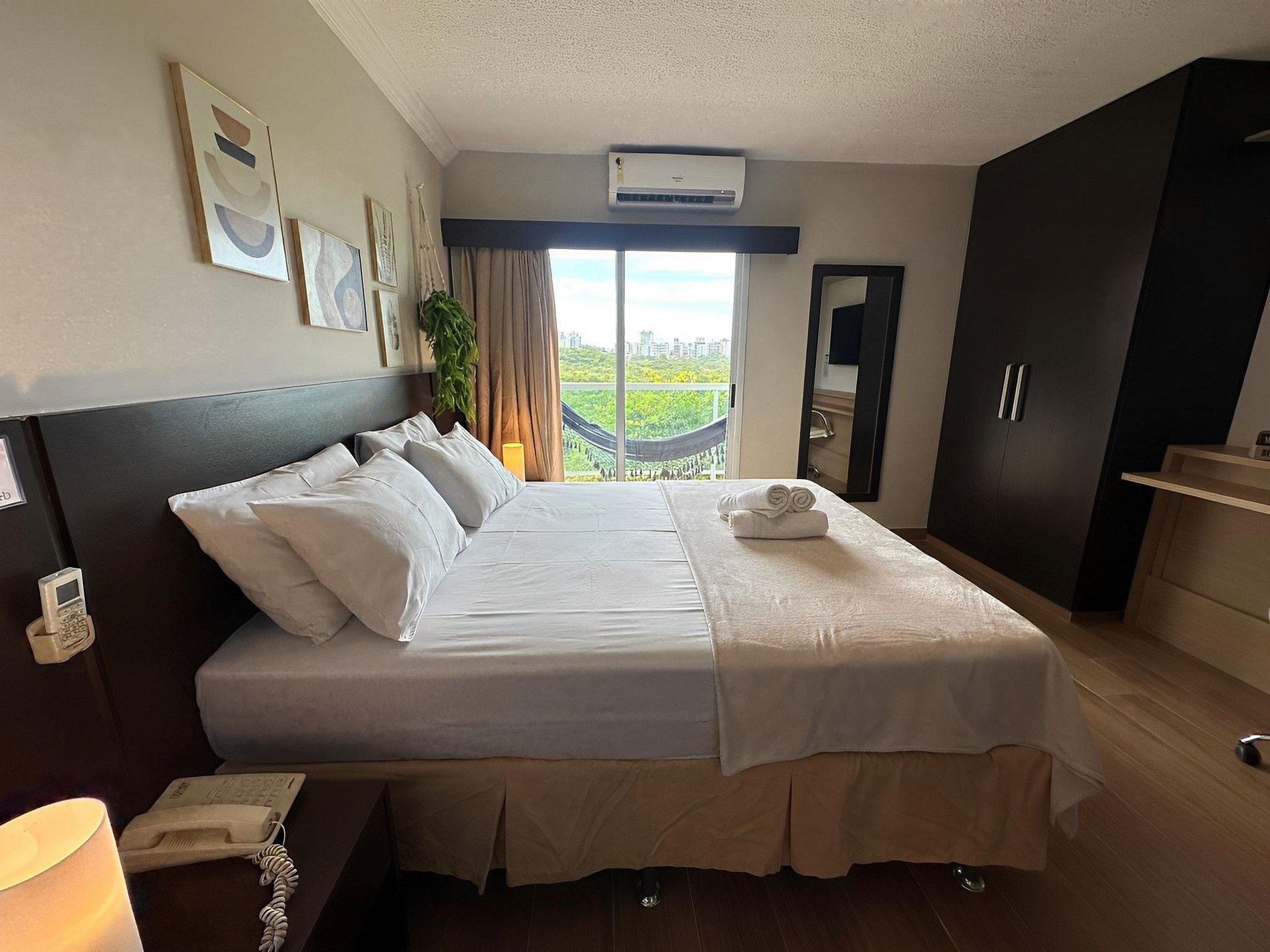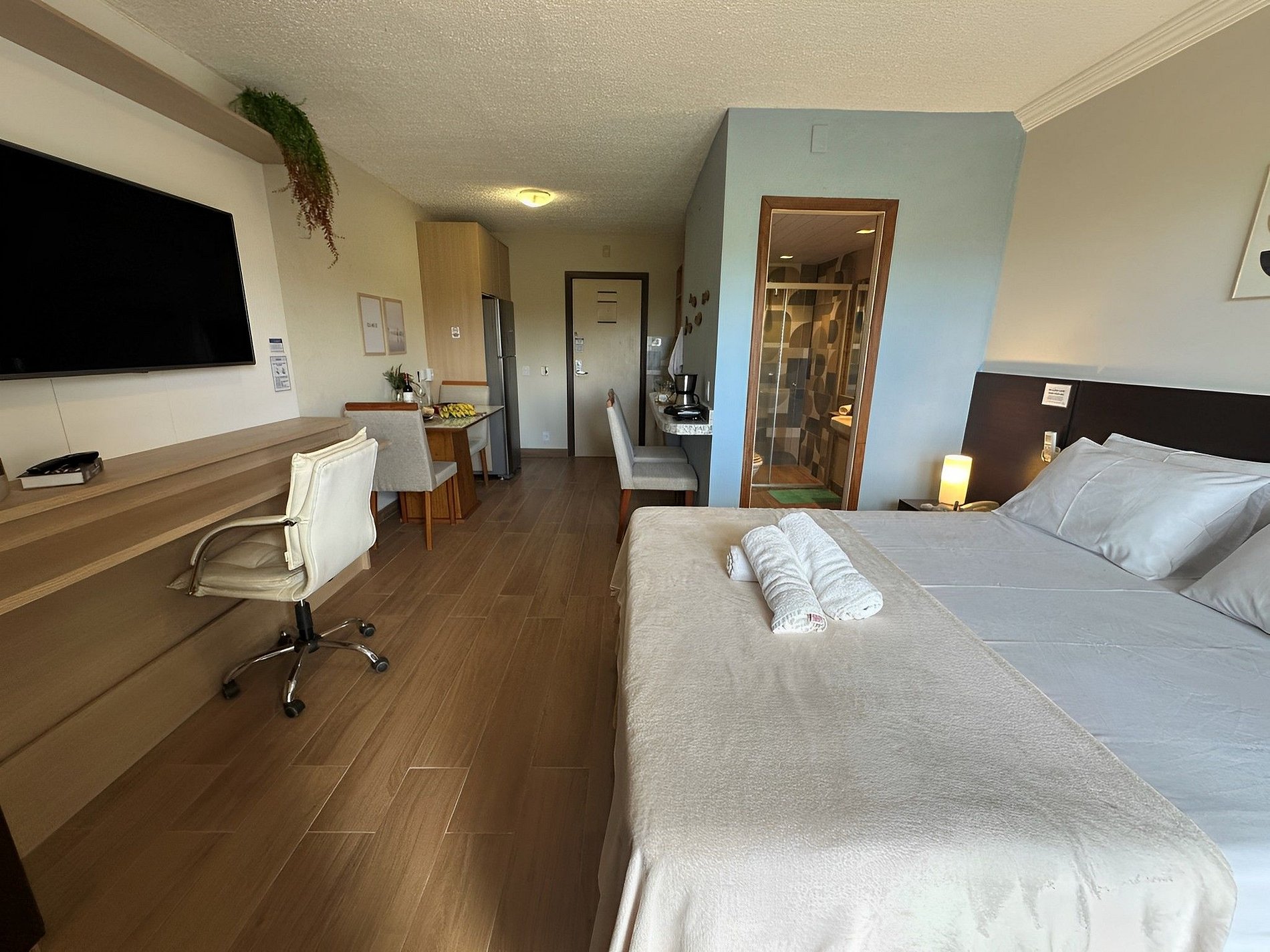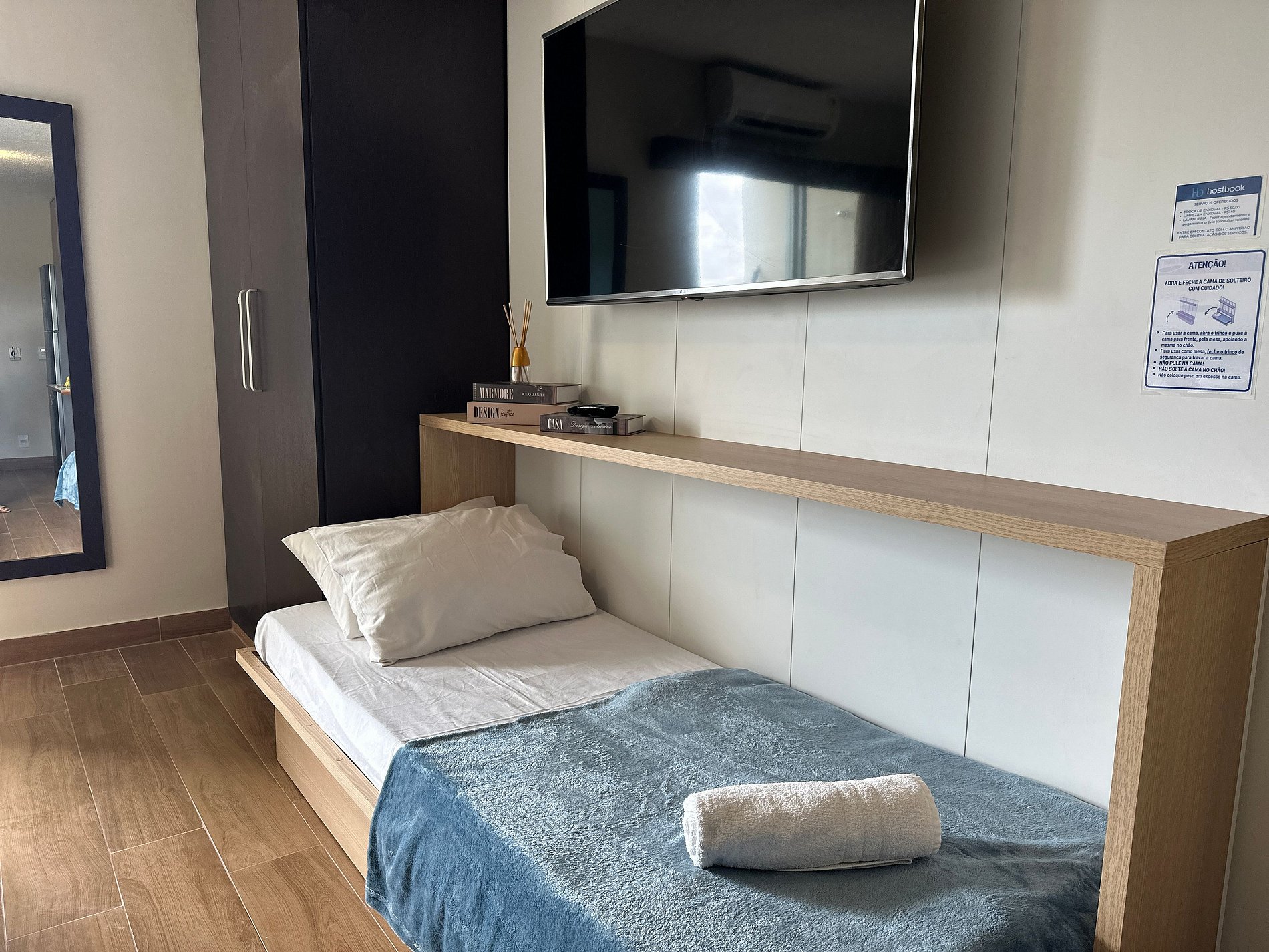 O loft possui uma cama Queen de alto padrão e uma cama de solteiro dobrável que vira uma mesa de escritório, armário, banheiro amplo e cozinha compacta com todos os itens essenciais para cozinhar. Vista para a Restinga e para o mar. No prédio é permitido utilizar a piscina, a sauna e os serviços extras.