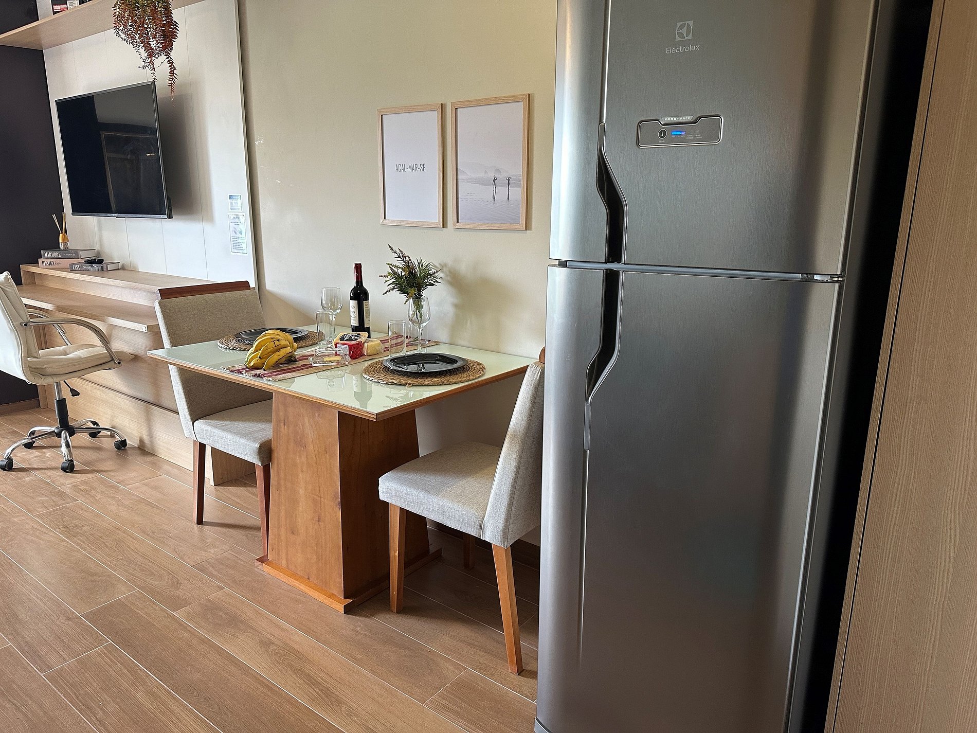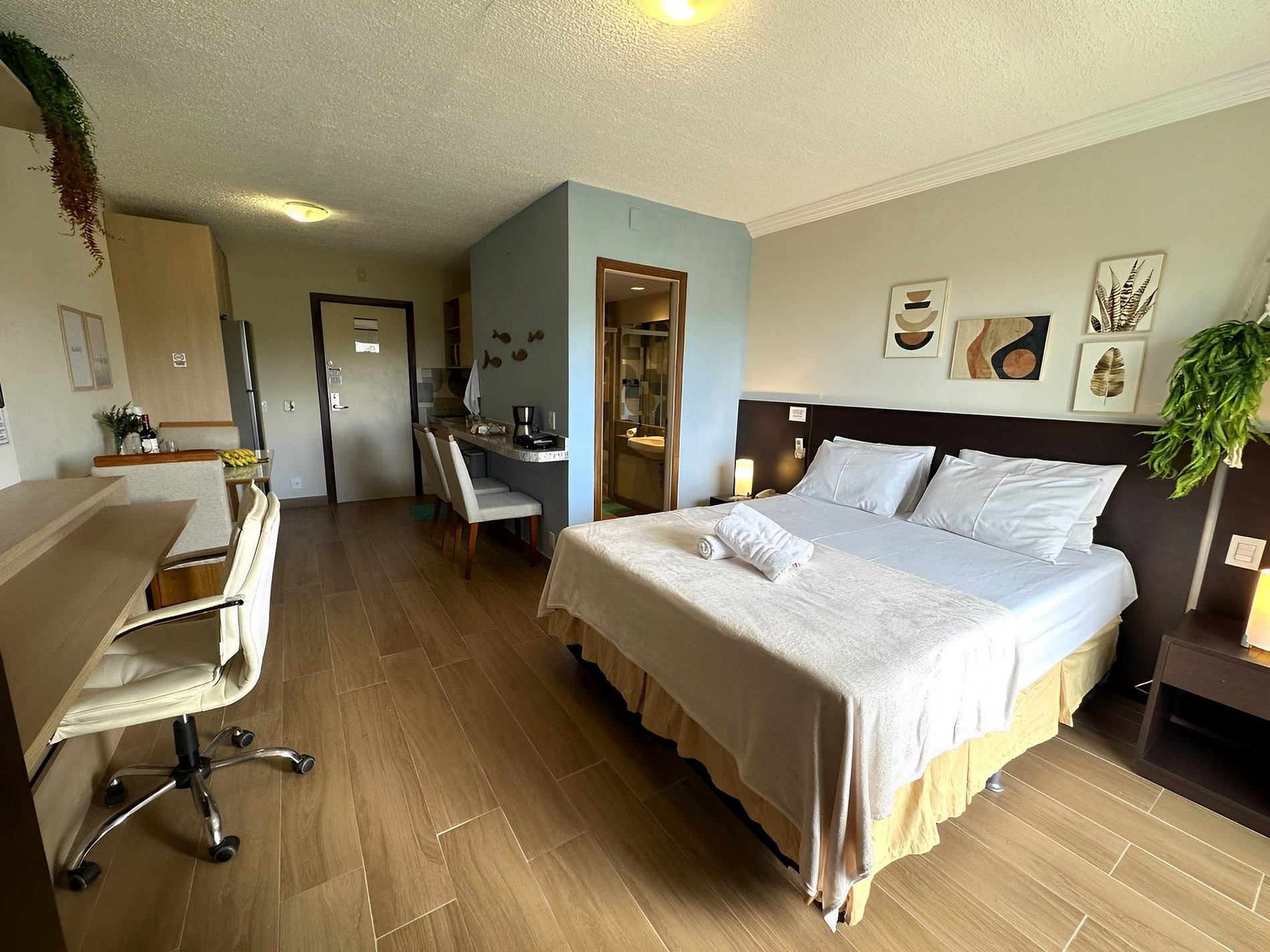 O loft possui uma cama Queen de alto padrão e uma cama de solteiro dobrável que vira uma mesa de escritório, armário, banheiro amplo e cozinha compacta com todos os itens essenciais para cozinhar. Vista para a Restinga e para o mar. No prédio é permitido utilizar a piscina, a sauna e os serviços extras.