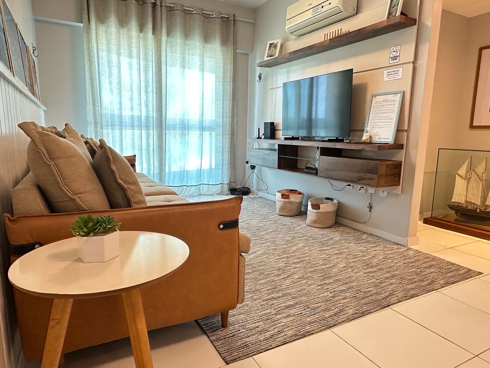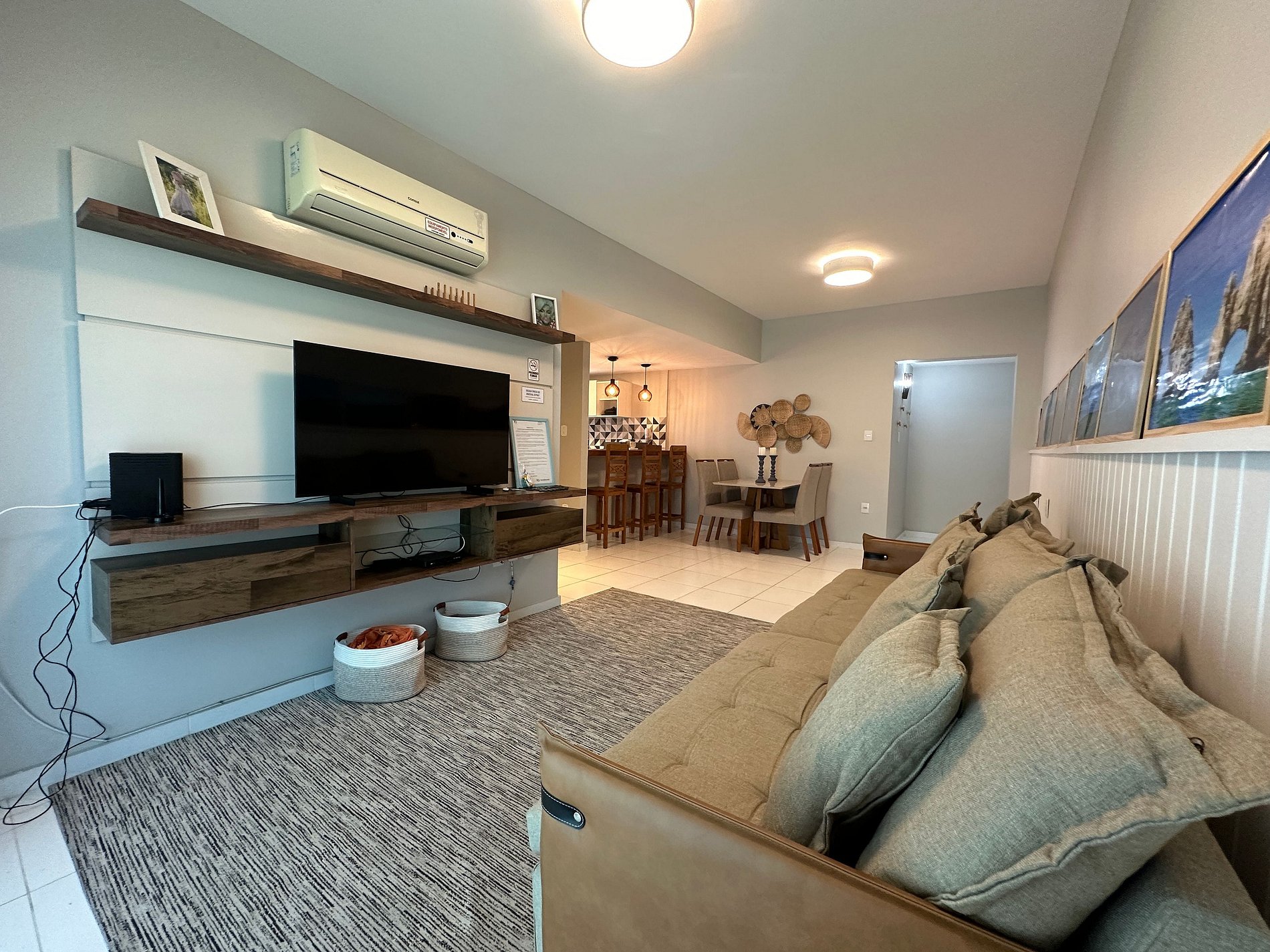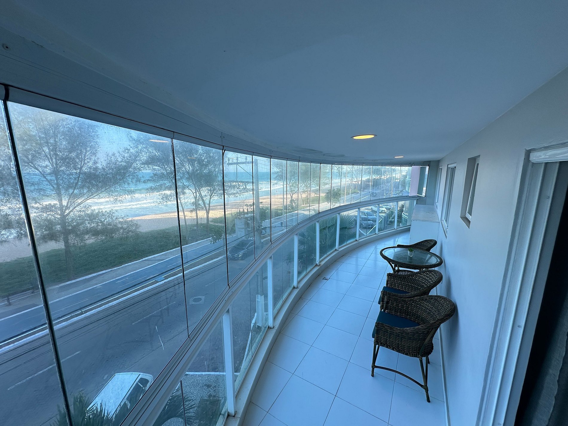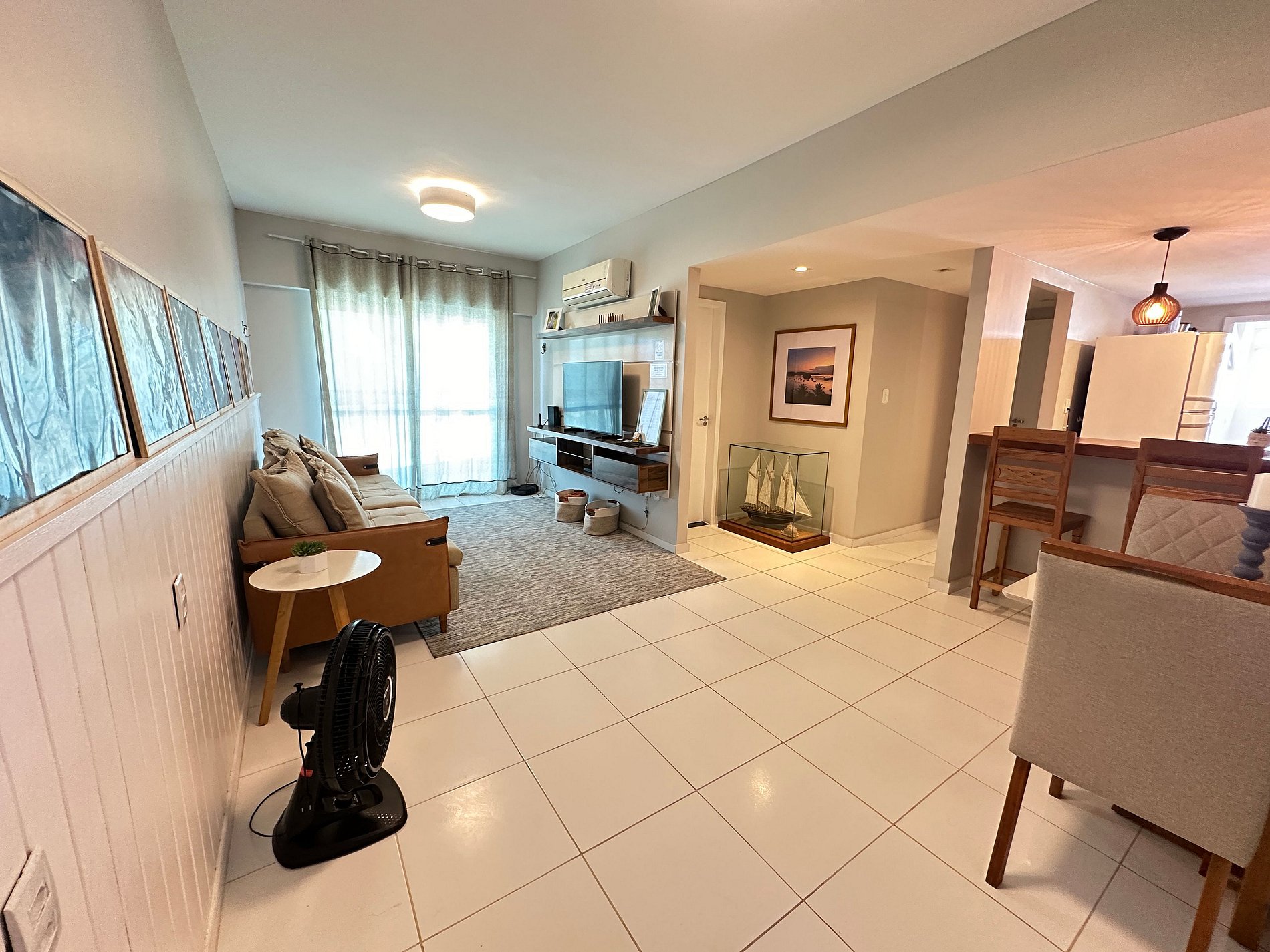 O apartamento possui todos os cômodos muito amplos, com sala estar e jantar, cozinha, área de serviço, varanda de frente para o mar e dois quartos, sendo uma suíte, todos com ar-condicionado. A varanda possui cortina de vidro e espaço para trabalhar. Espaço muito completo para longas estadias e famílias ou casais.