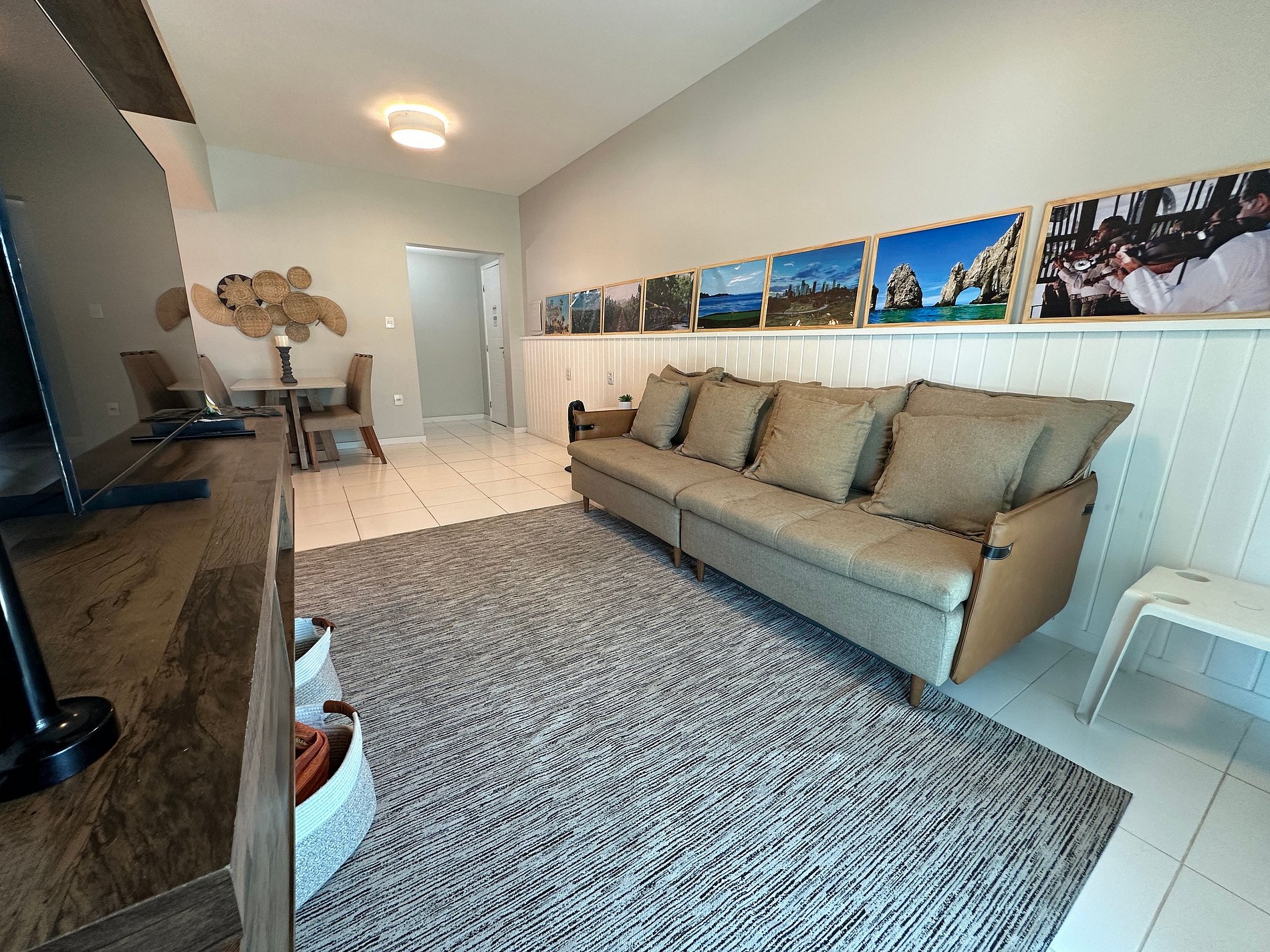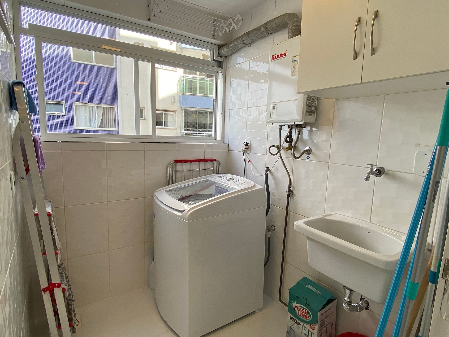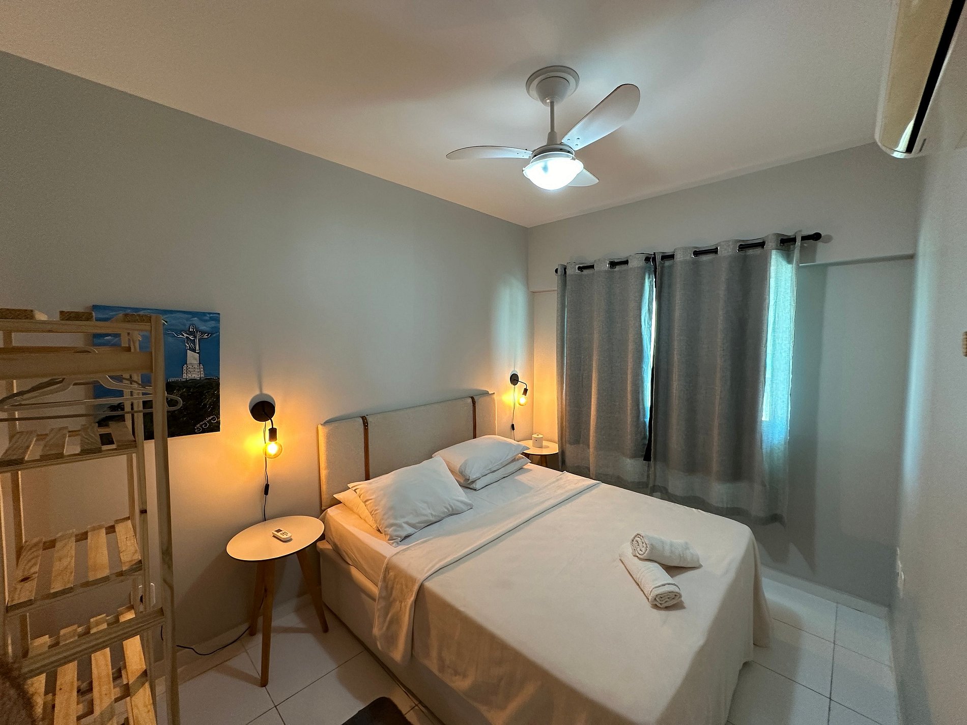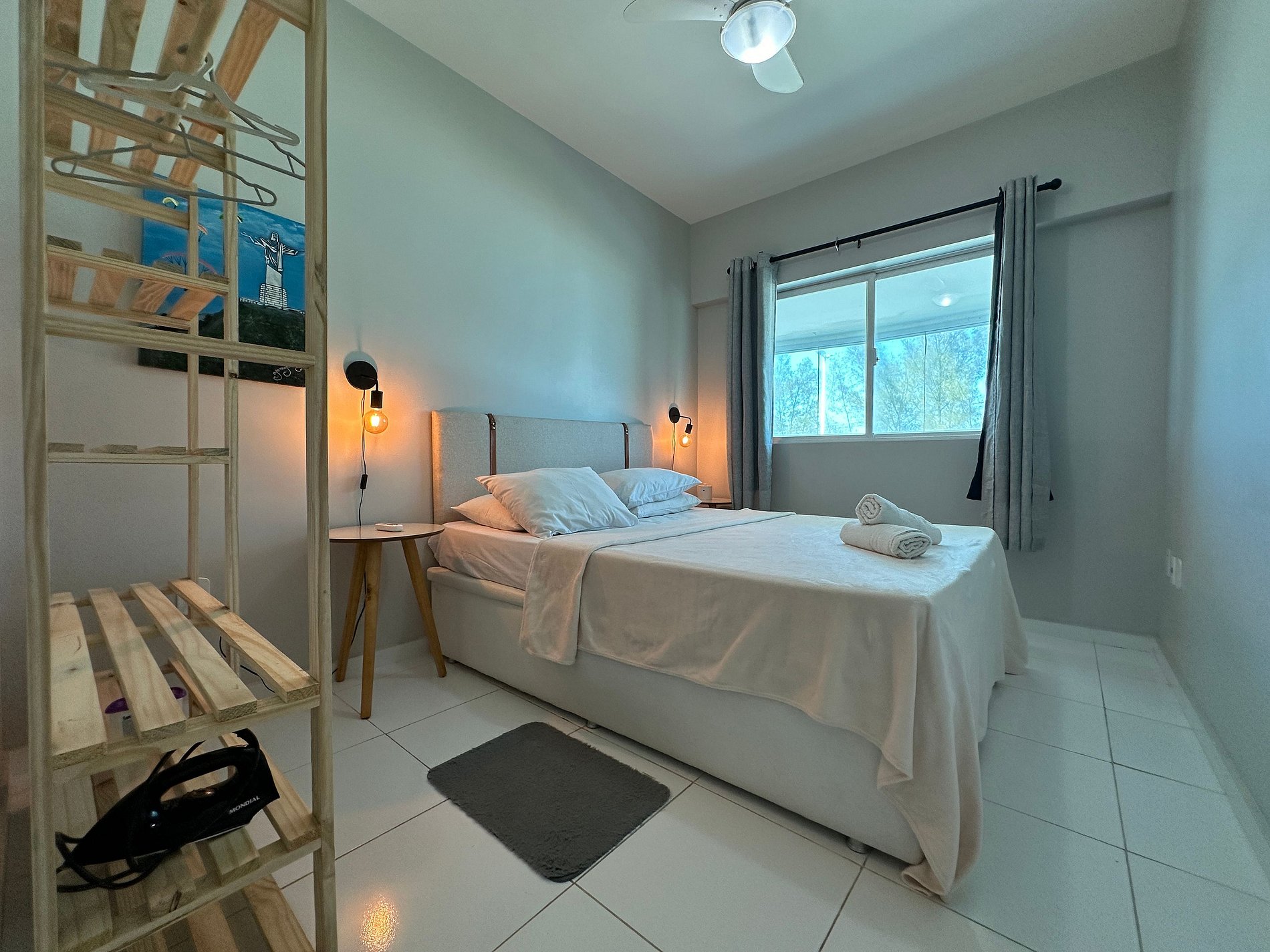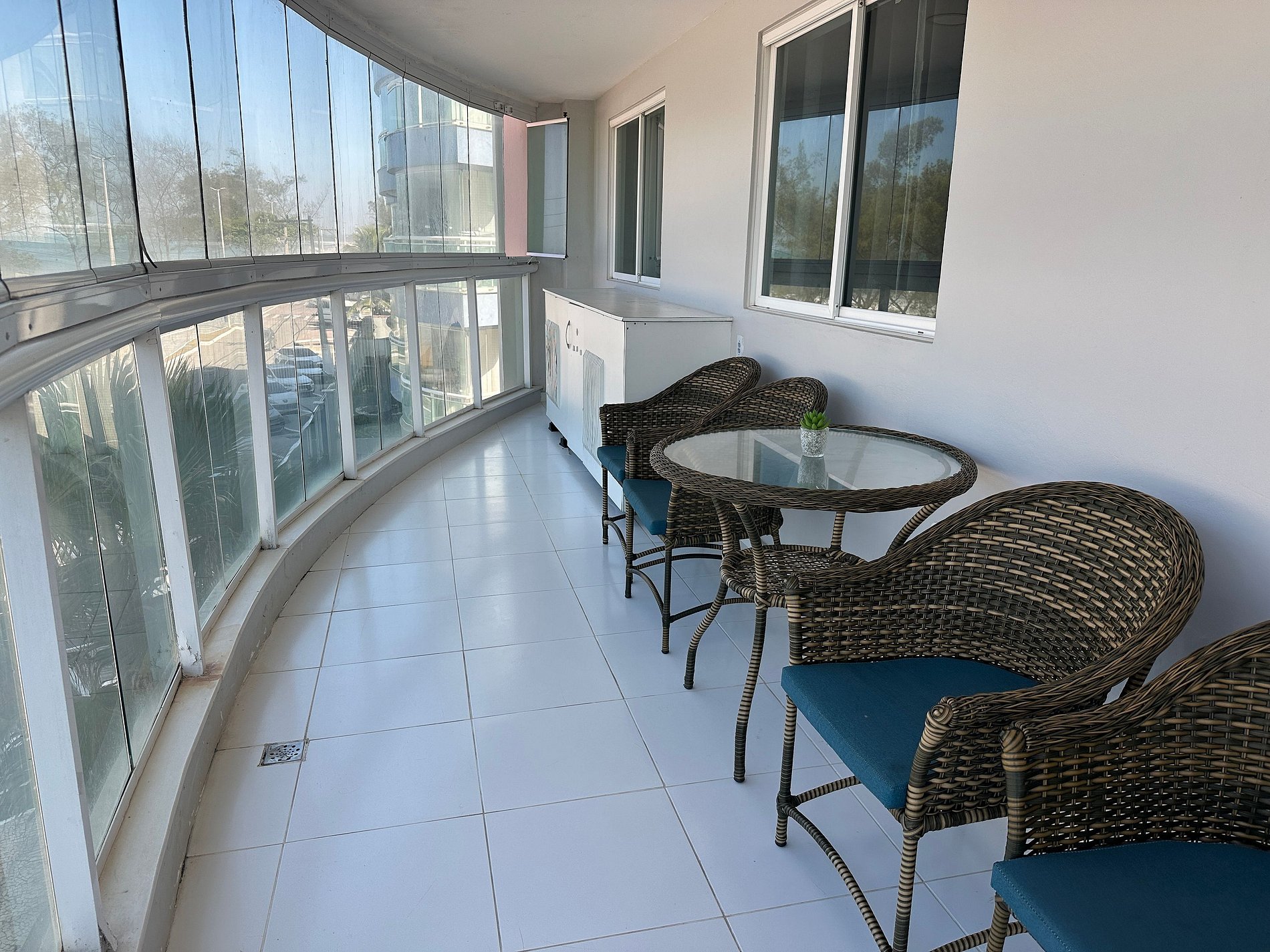 O apartamento possui todos os cômodos muito amplos, com sala estar e jantar, cozinha, área de serviço, varanda de frente para o mar e dois quartos, sendo uma suíte, todos com ar-condicionado. A varanda possui cortina de vidro e espaço para trabalhar. Espaço muito completo para longas estadias e famílias ou casais.