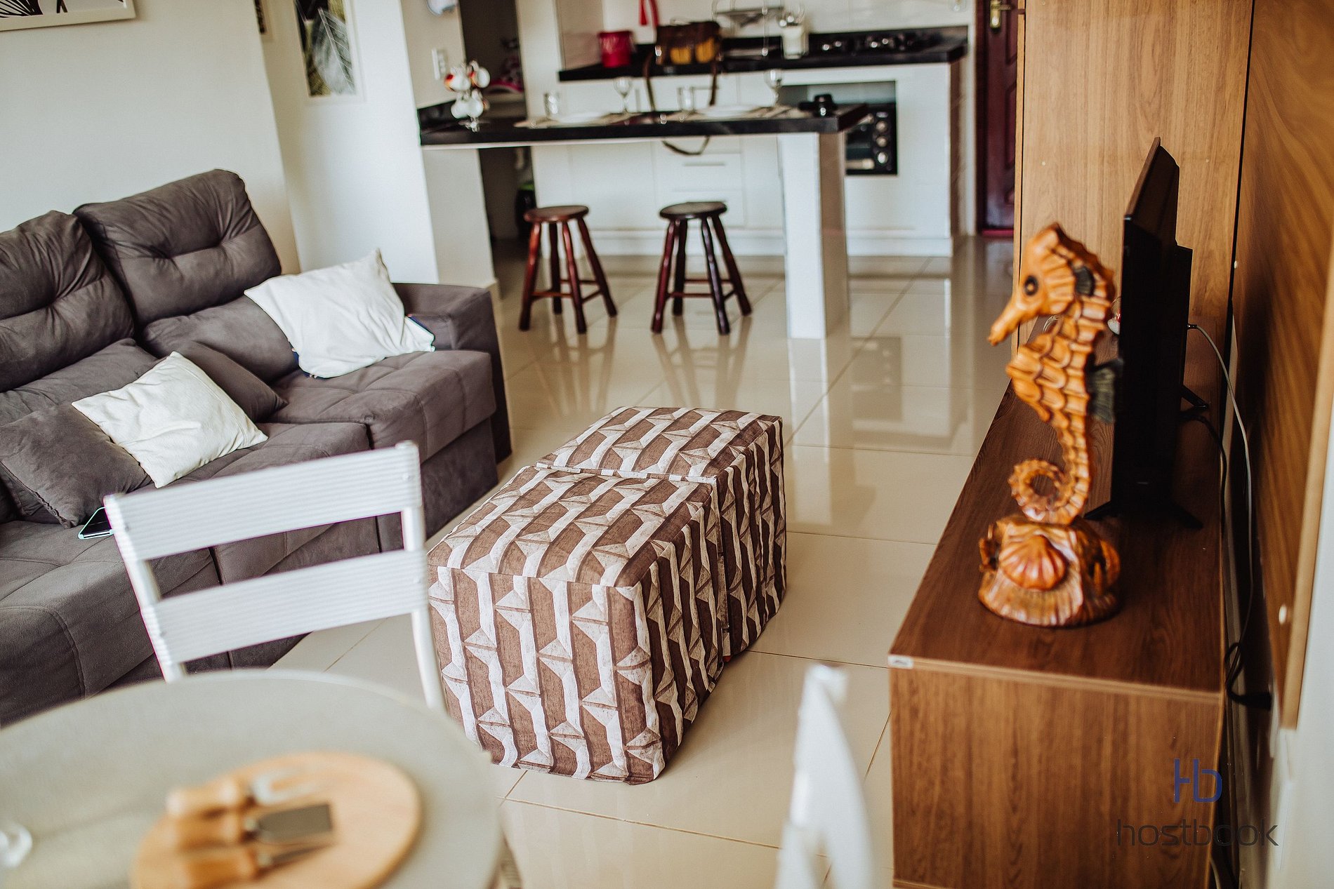 O apartamento possui uma sala ampla com TV smart. O quarto possui uma cama confortável, ar condicionado e uma janela com vista para o mar. Cozinha completa com utensílios para cozinhar, cafeteira, liquidificador entre outros itens. Fornecemos roupa de cama e toalhas de banho. O prédio não possui elevador mas o apartamento fica no primeiro andar com poucas escadas para subir.