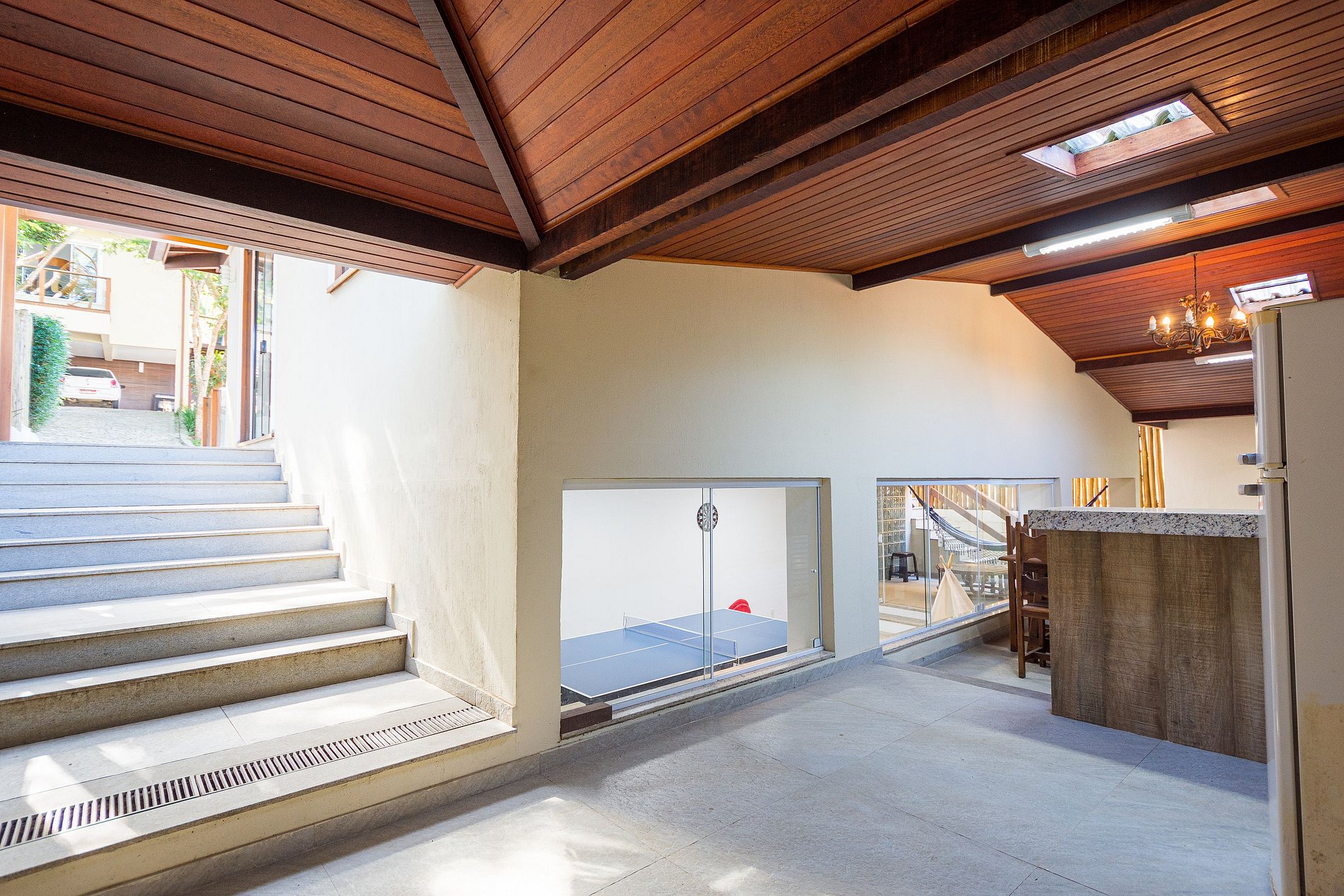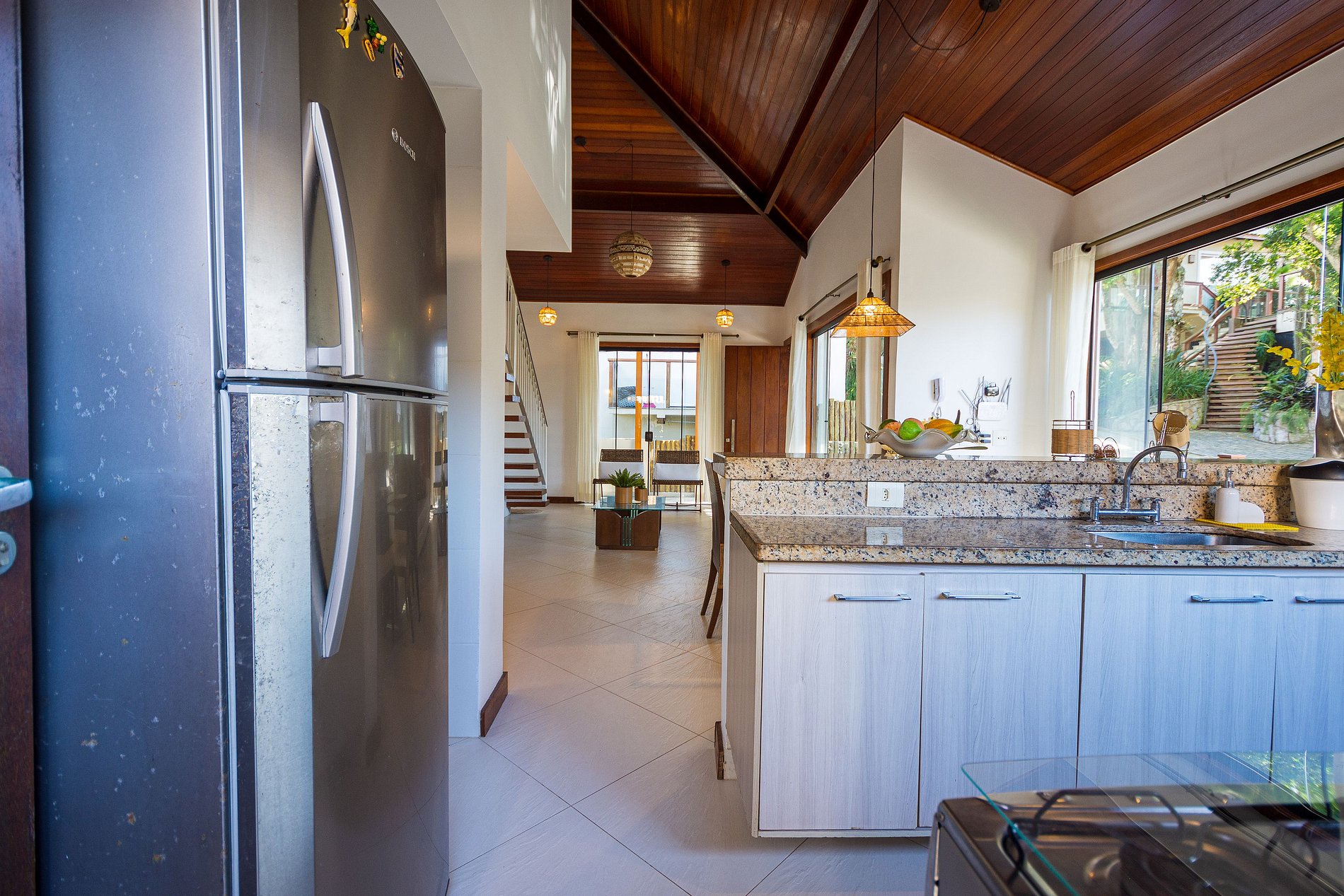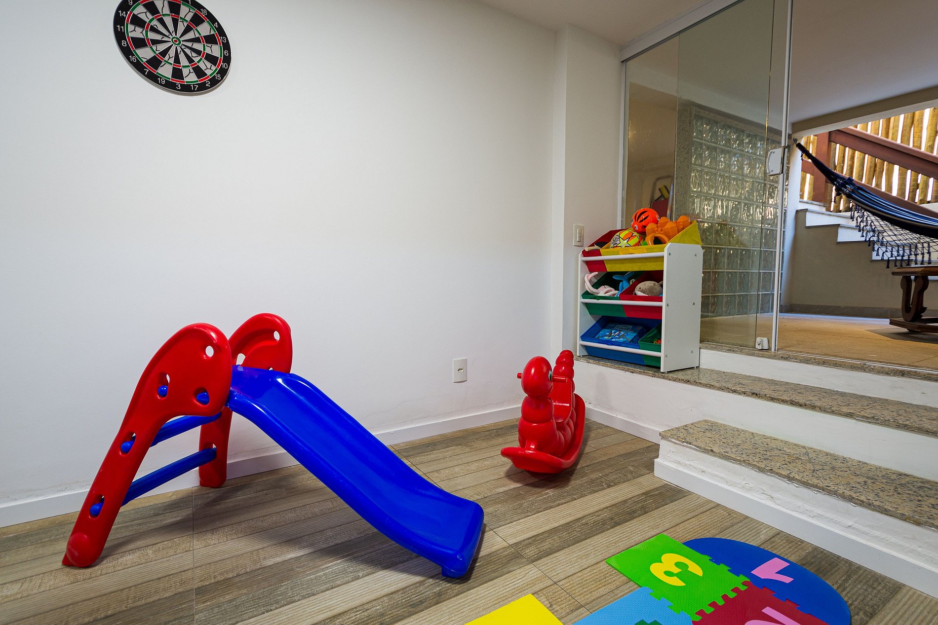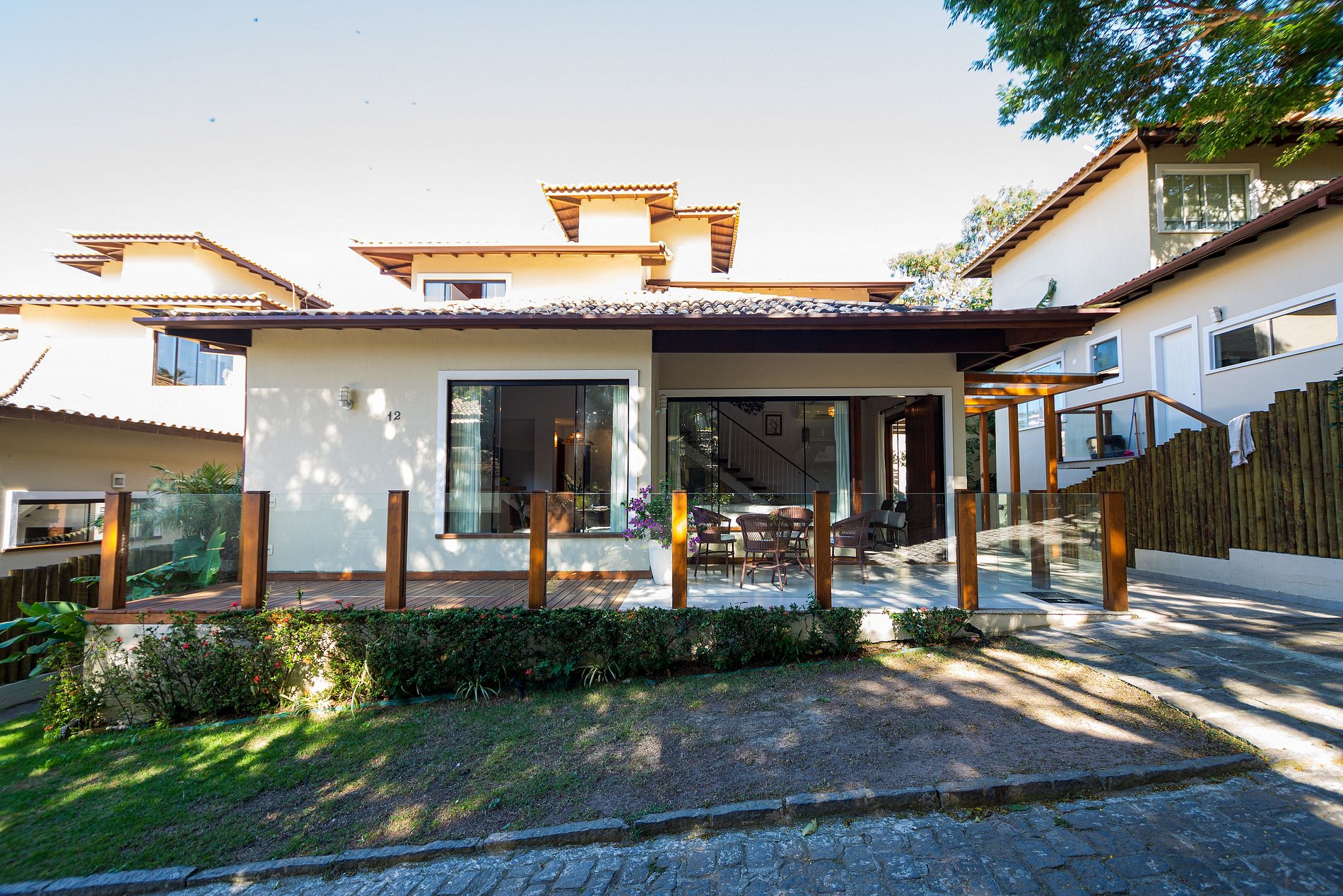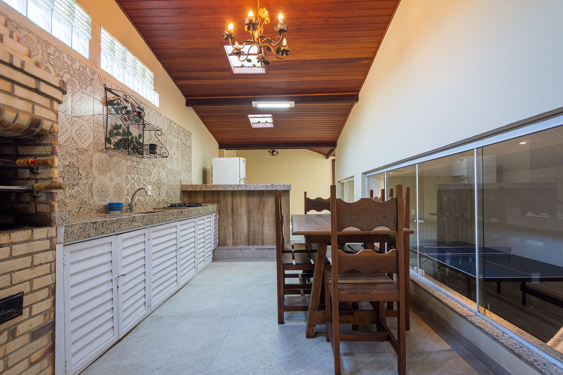 A casa possui quatro suítes com ar-condicionado e um lavabo, além de uma sala de estar bem ampla e cozinha completa. A área externa é espaçosa e tem um deck frontal com mesa e área de churrasco nos fundos com chuveirão e banheiro. Possui garagem para até 2 carros.