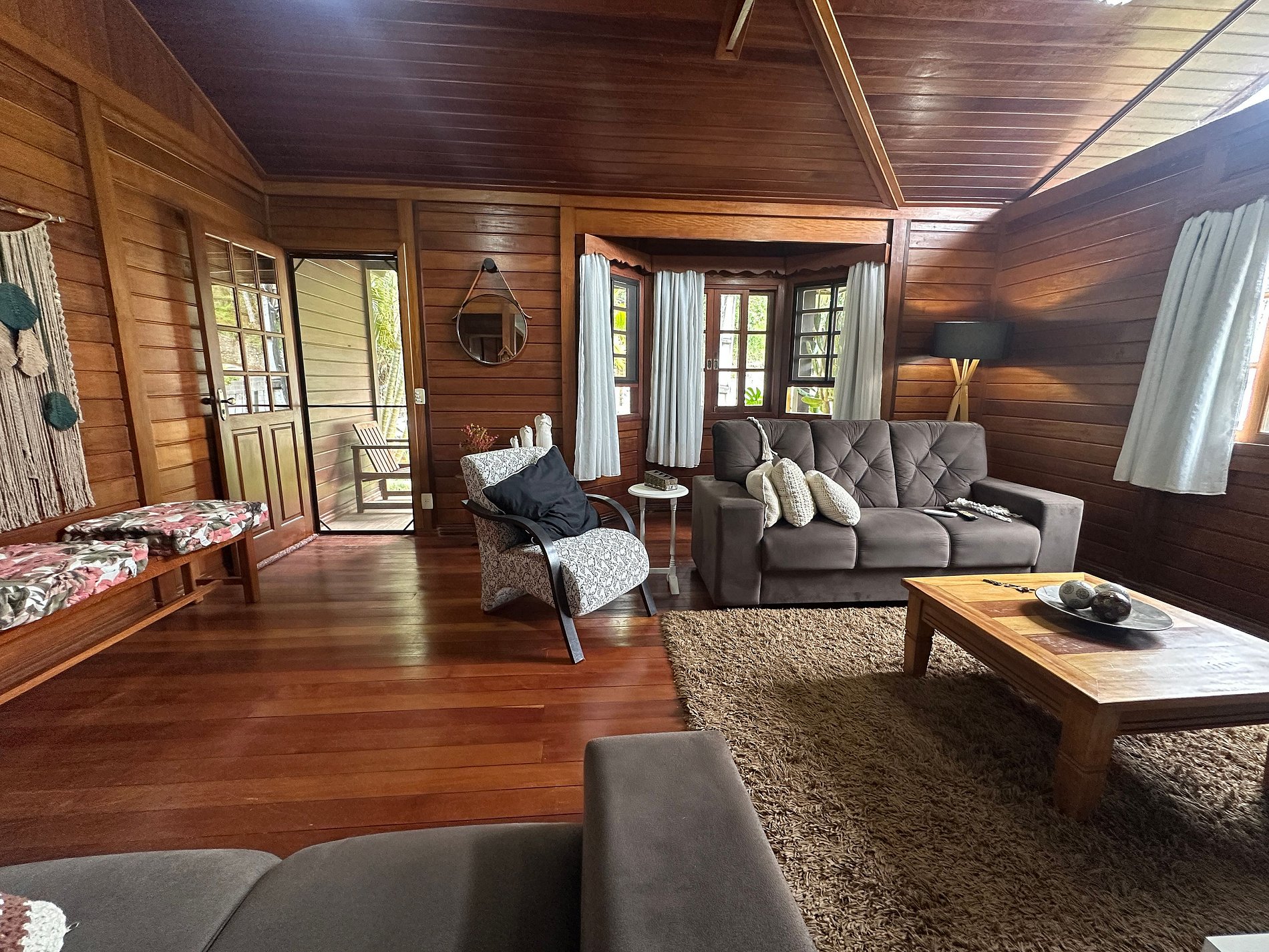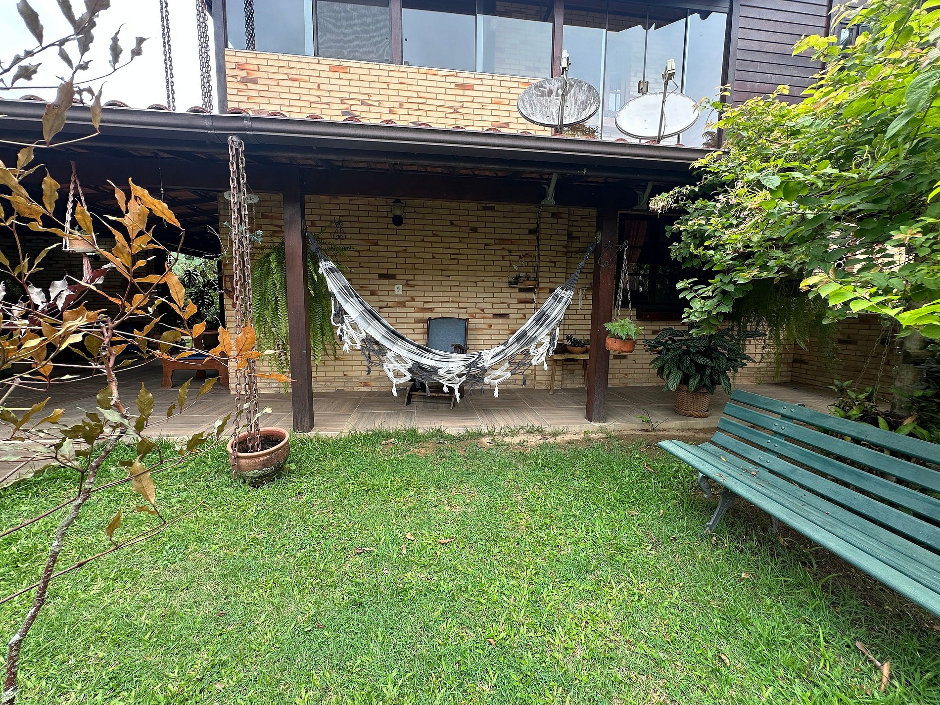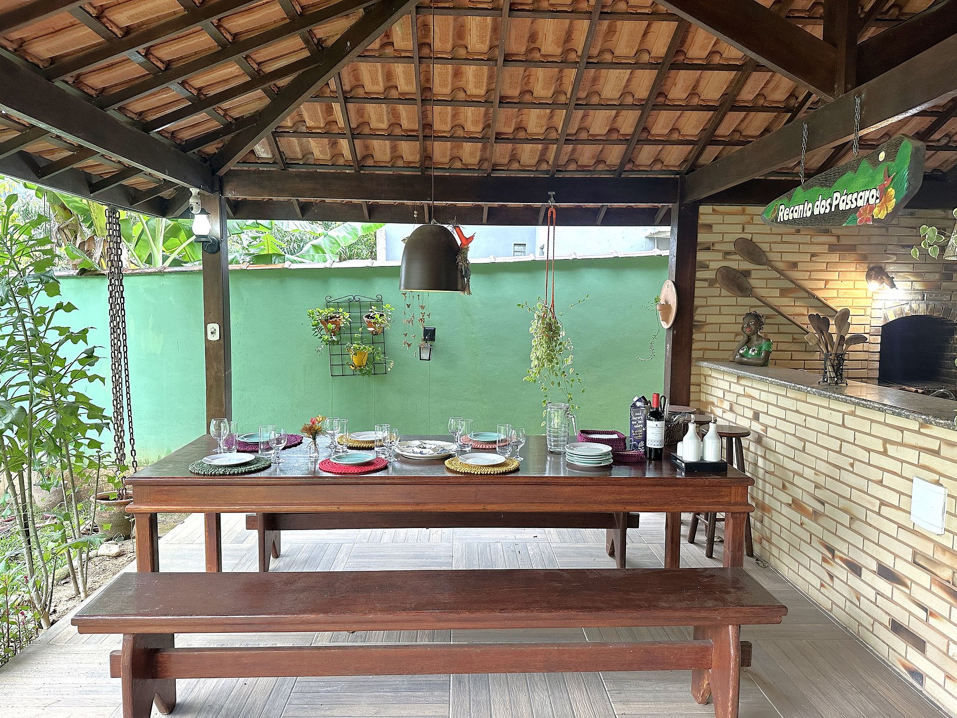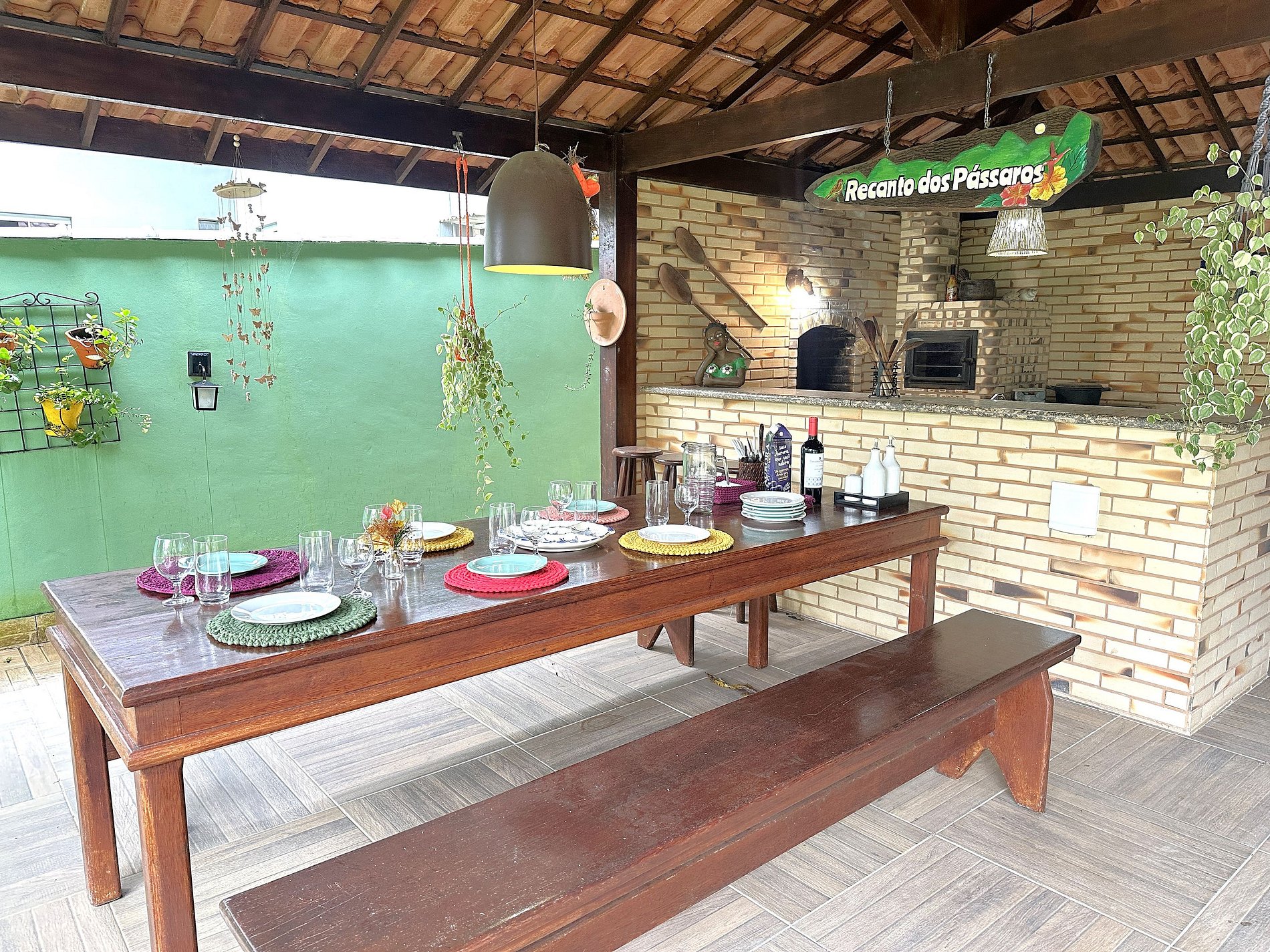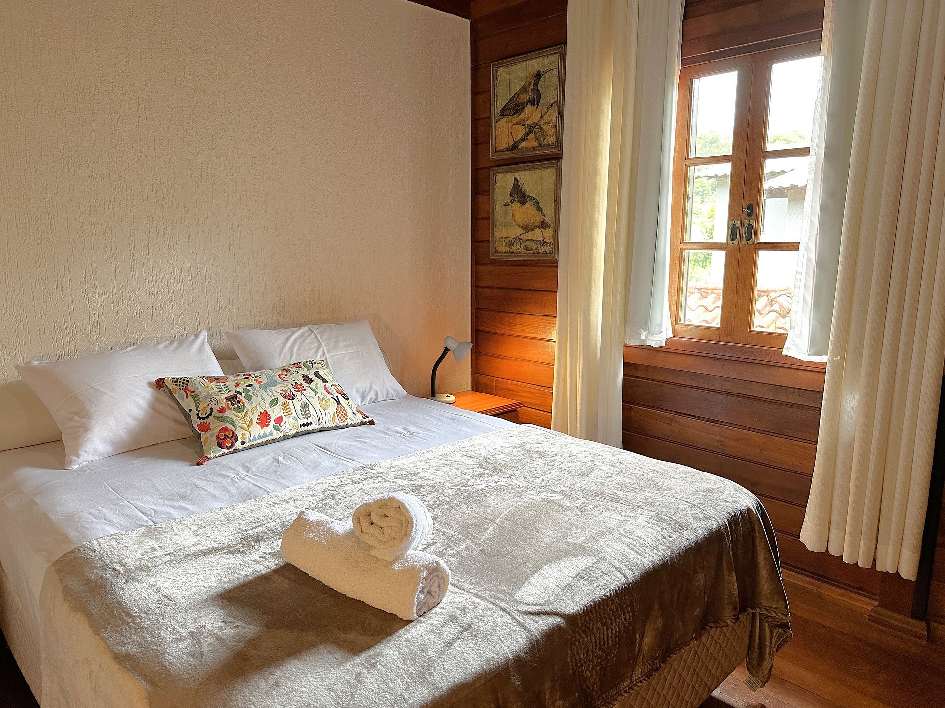 A casa possui 4 quartos, sendo 1 suíte, duas salas amplas, duas cozinhas e mais 2 banheiros. Todos os cômodos são decorados e equipados para comodidade dos hóspedes. Porém a grande atração está na área externa. Em um terreno de 1000m², temos um jardim maravilhoso com frutíferas e diversos locais para descansar, além de um chuveirão e uma área de churrasco ampla, com direito a fogão a lenha.