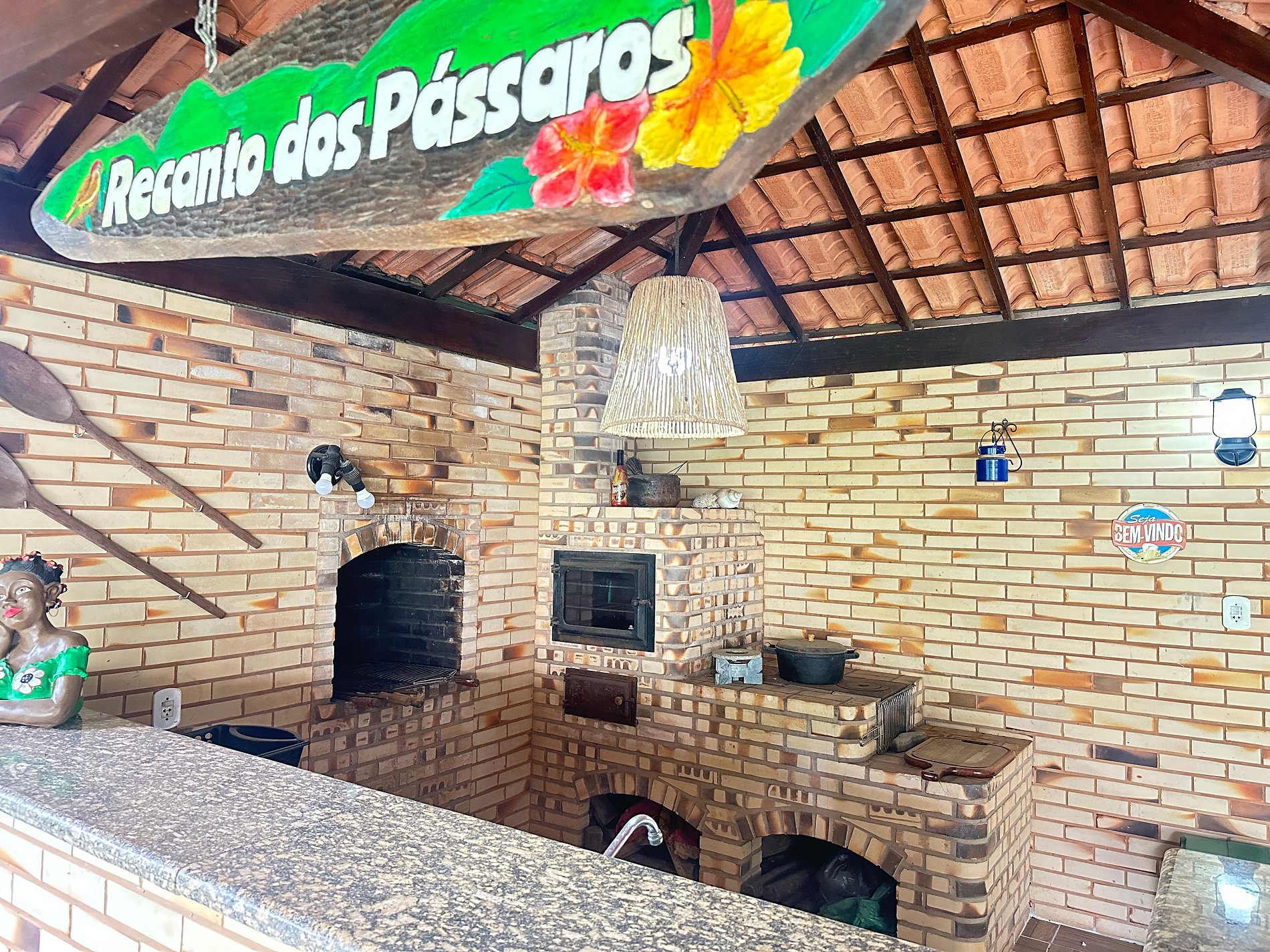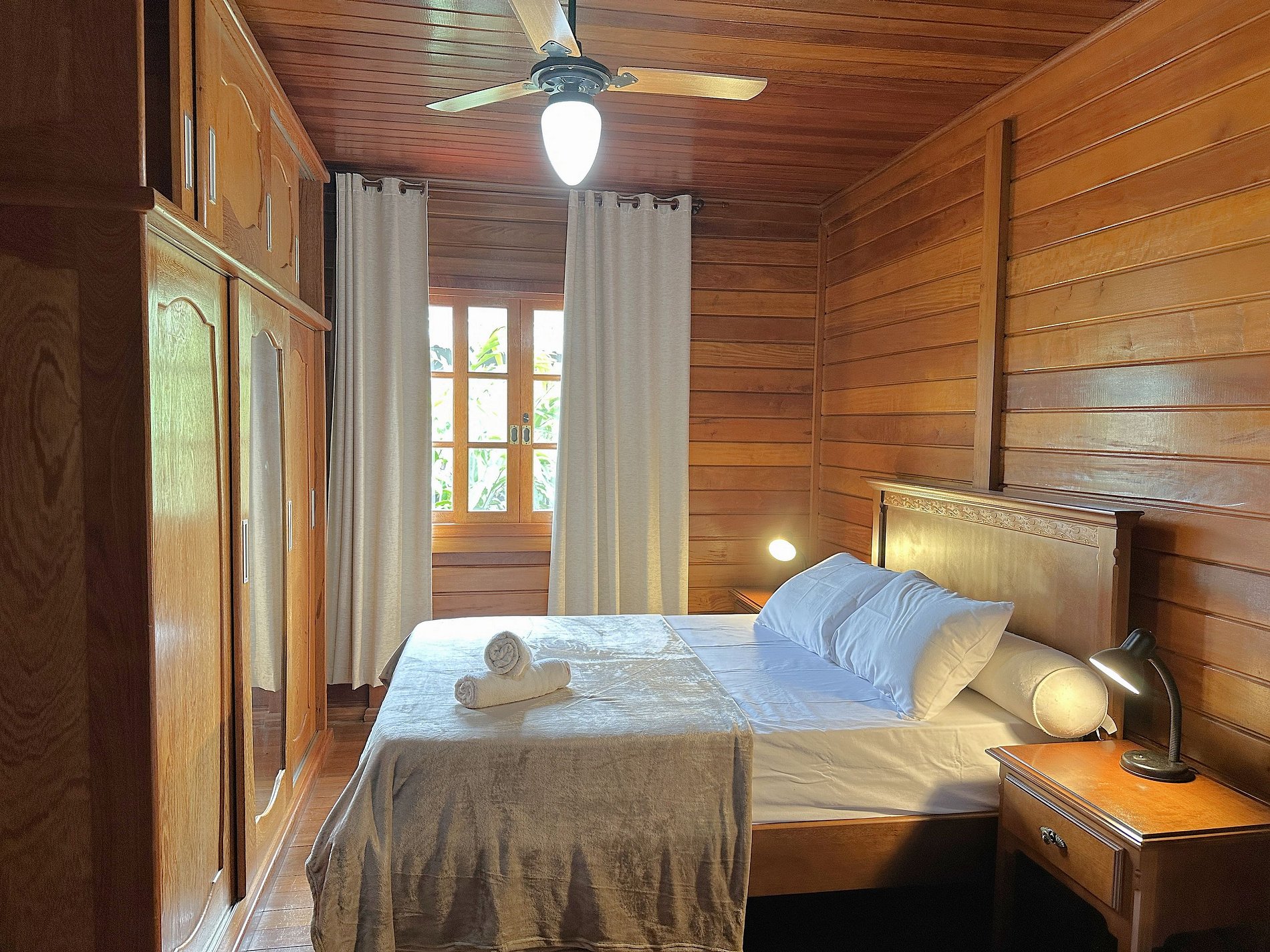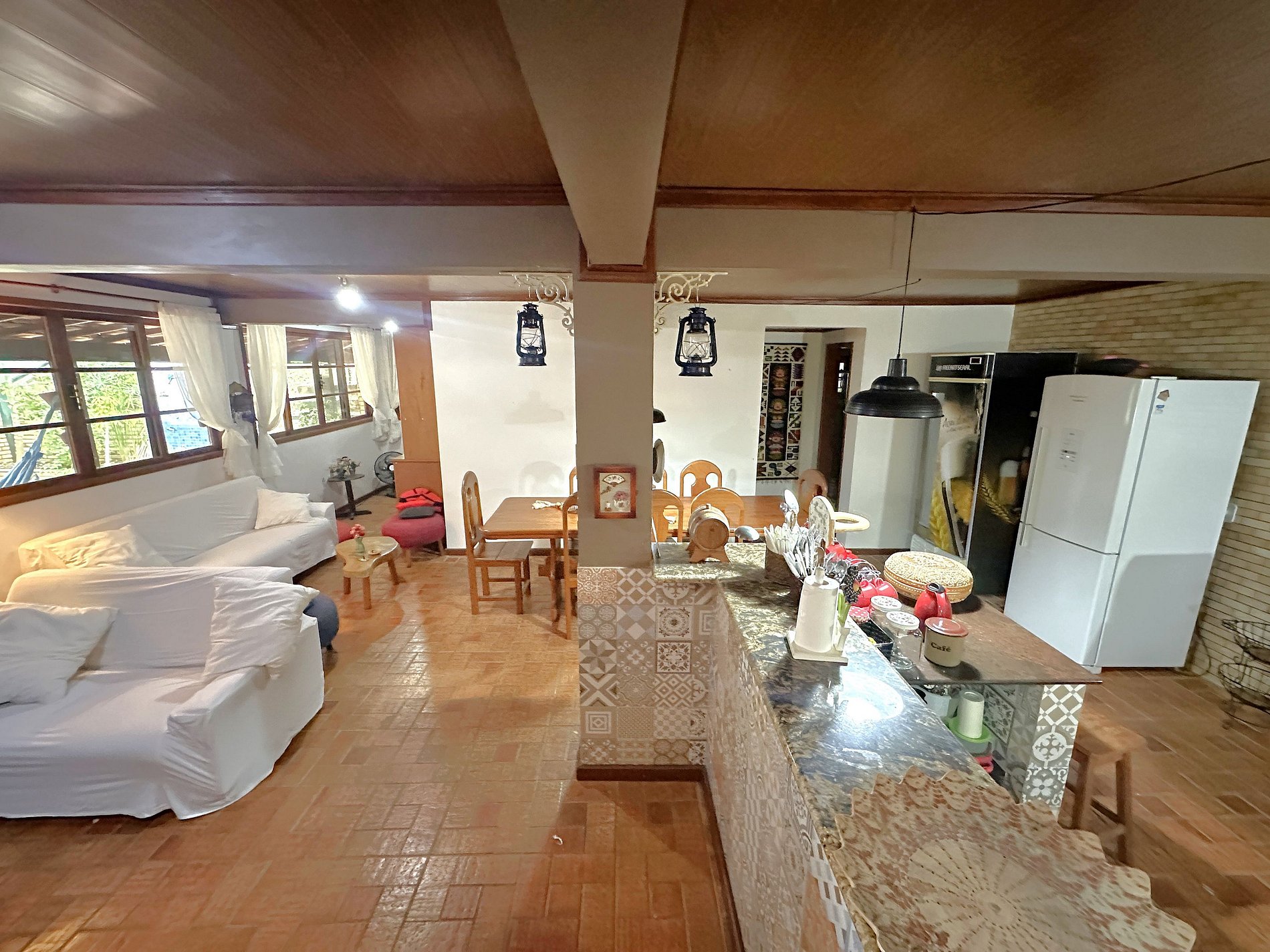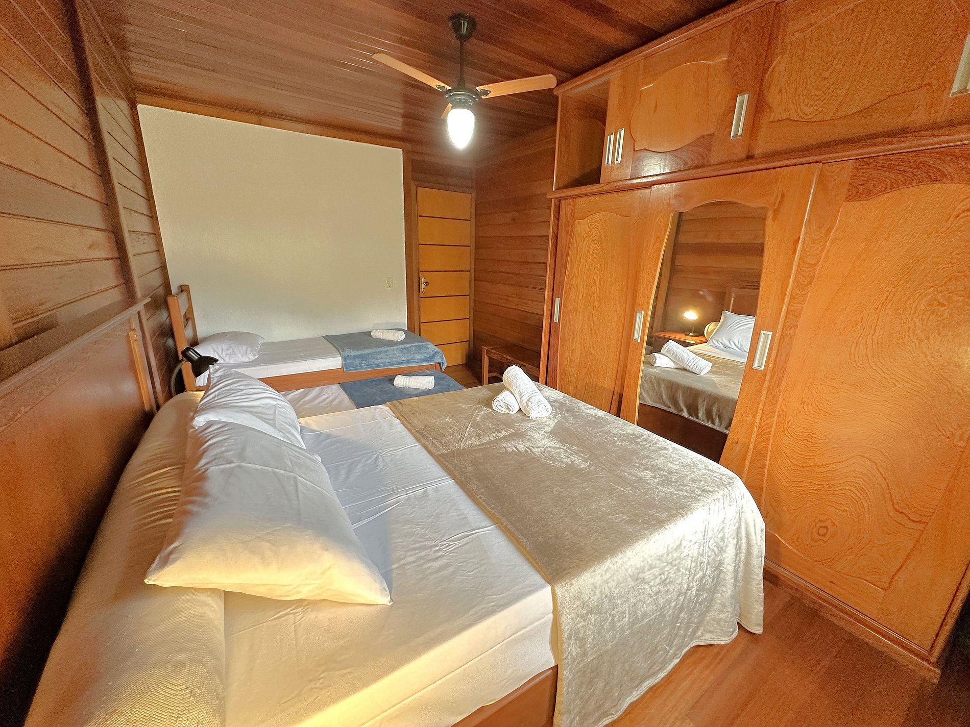 A casa possui 4 quartos, sendo 1 suíte, duas salas amplas, duas cozinhas e mais 2 banheiros. Todos os cômodos são decorados e equipados para comodidade dos hóspedes. Porém a grande atração está na área externa. Em um terreno de 1000m², temos um jardim maravilhoso com frutíferas e diversos locais para descansar, além de um chuveirão e uma área de churrasco ampla, com direito a fogão a lenha.