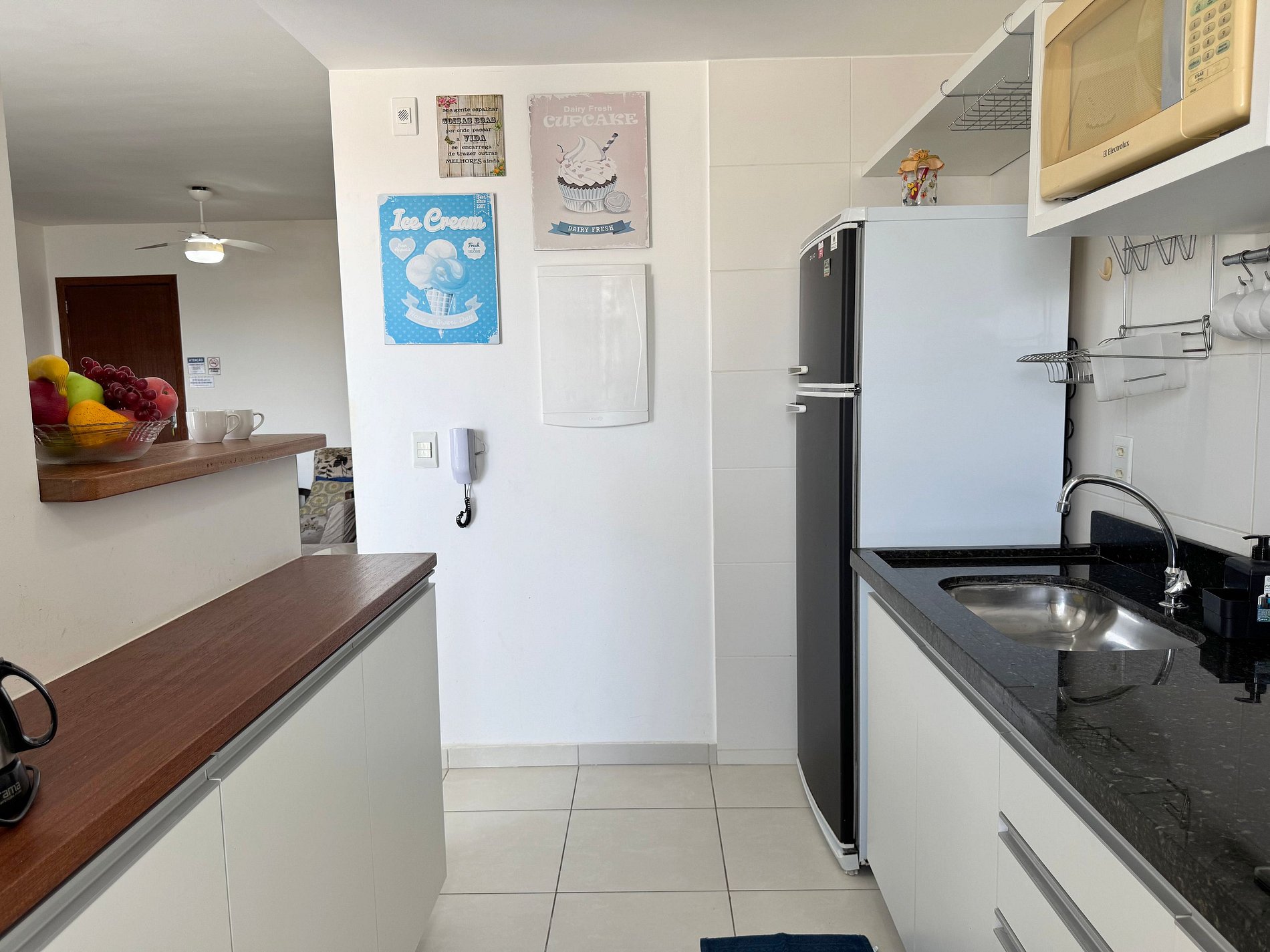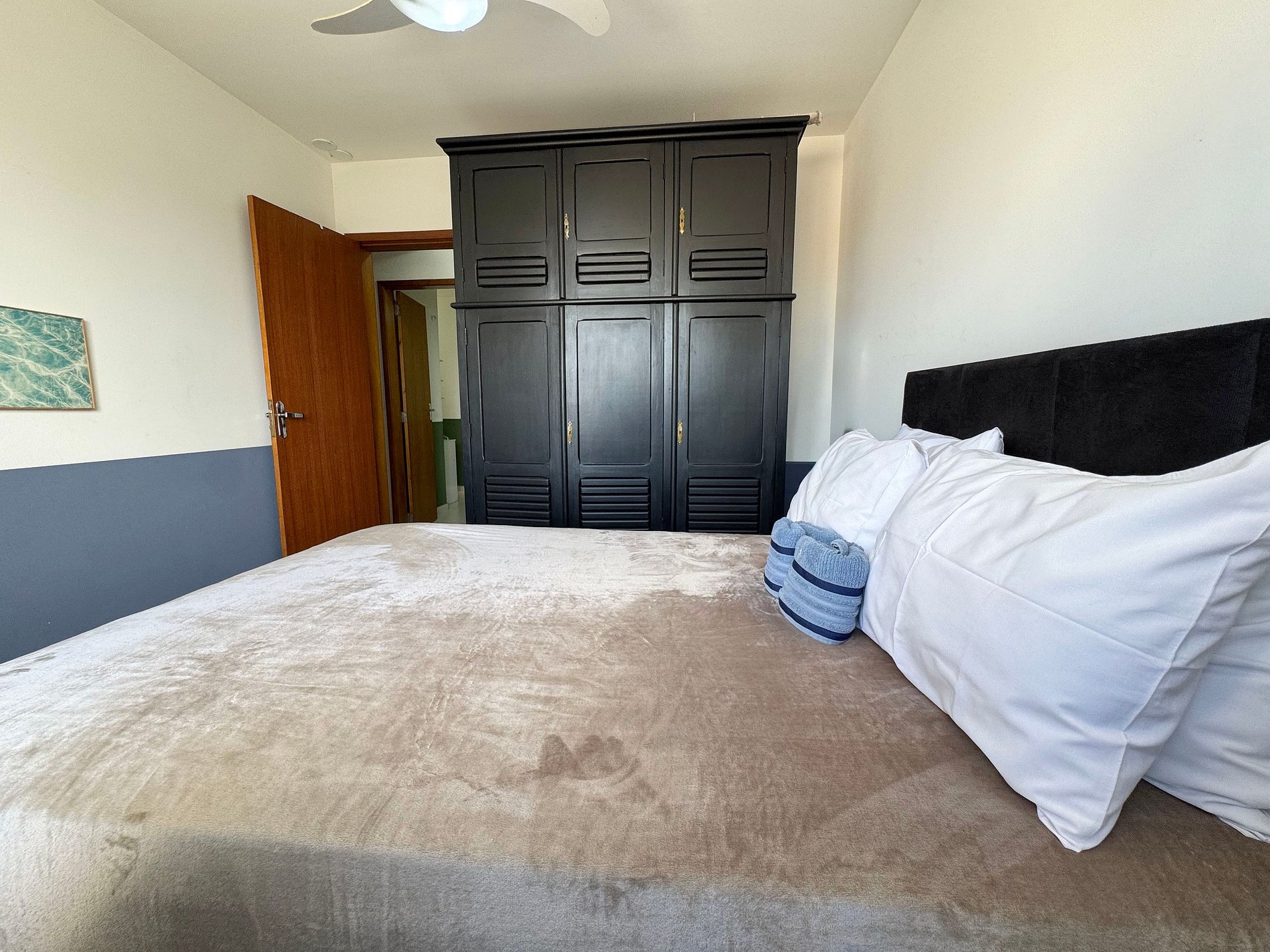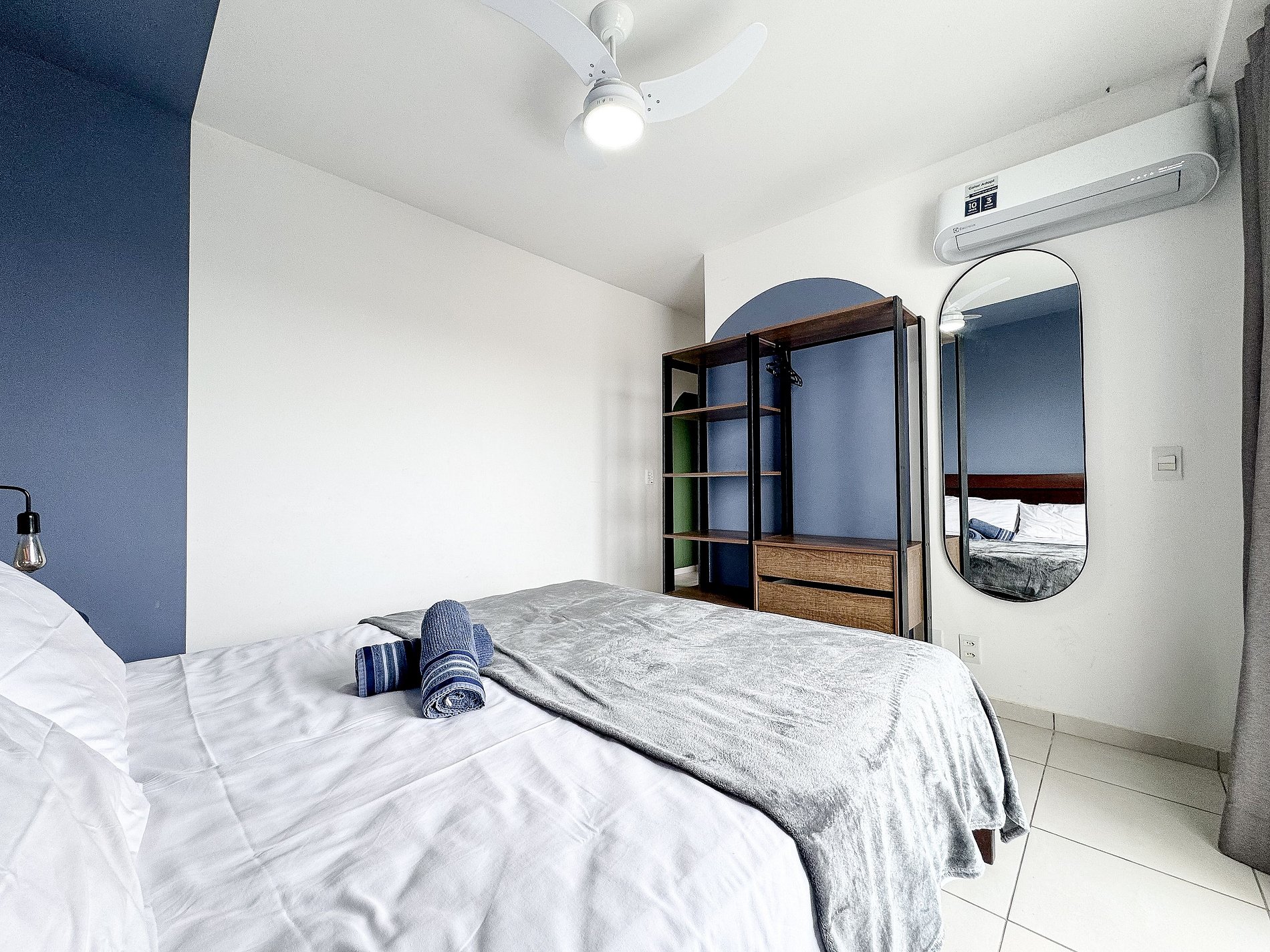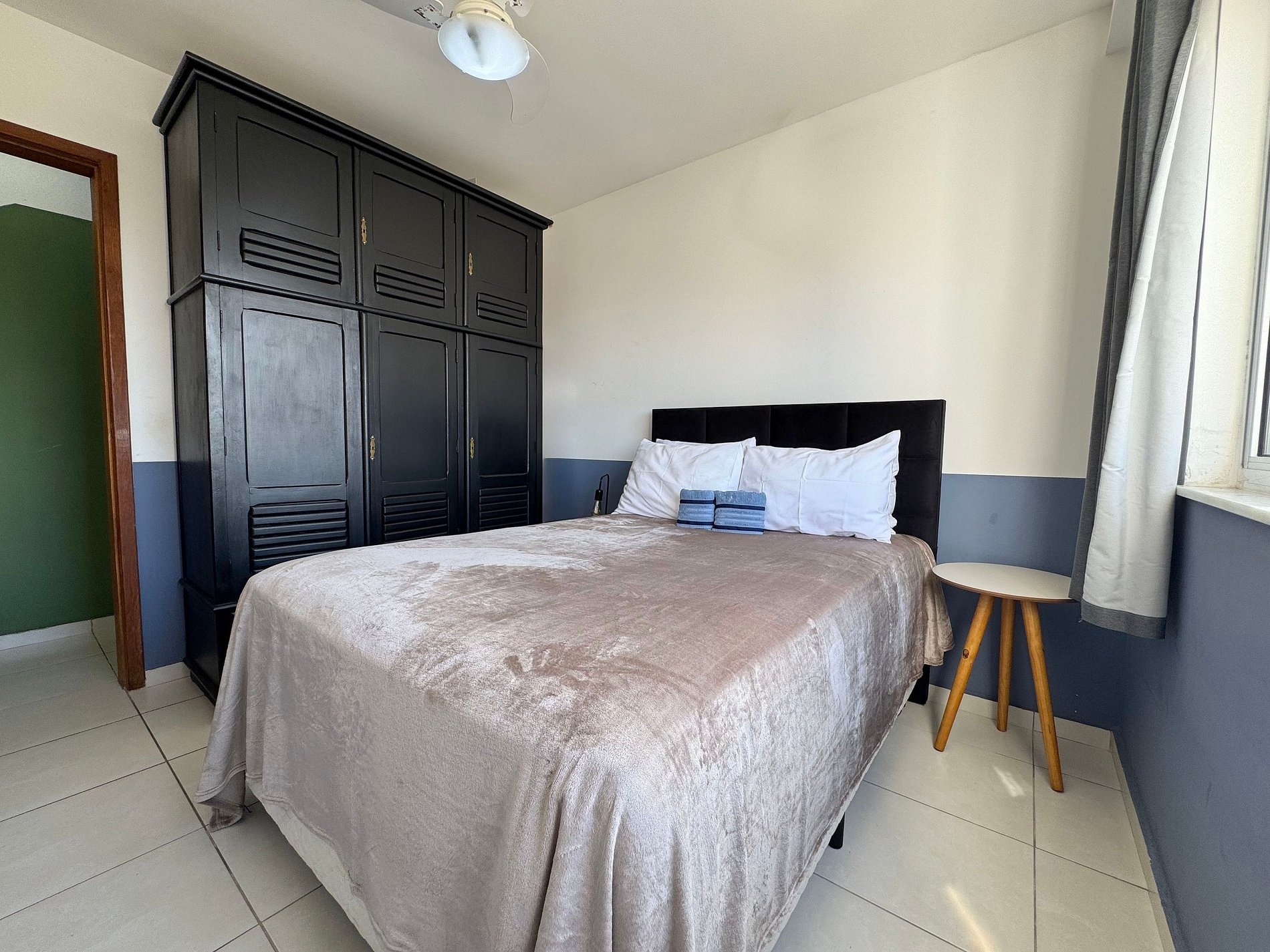 Apartamento com 3 quartos, sendo 2 quartos com ar-condicionado, incluindo a suíte e 1 quarto com ventilador de teto, cozinha completa, sala e varanda.