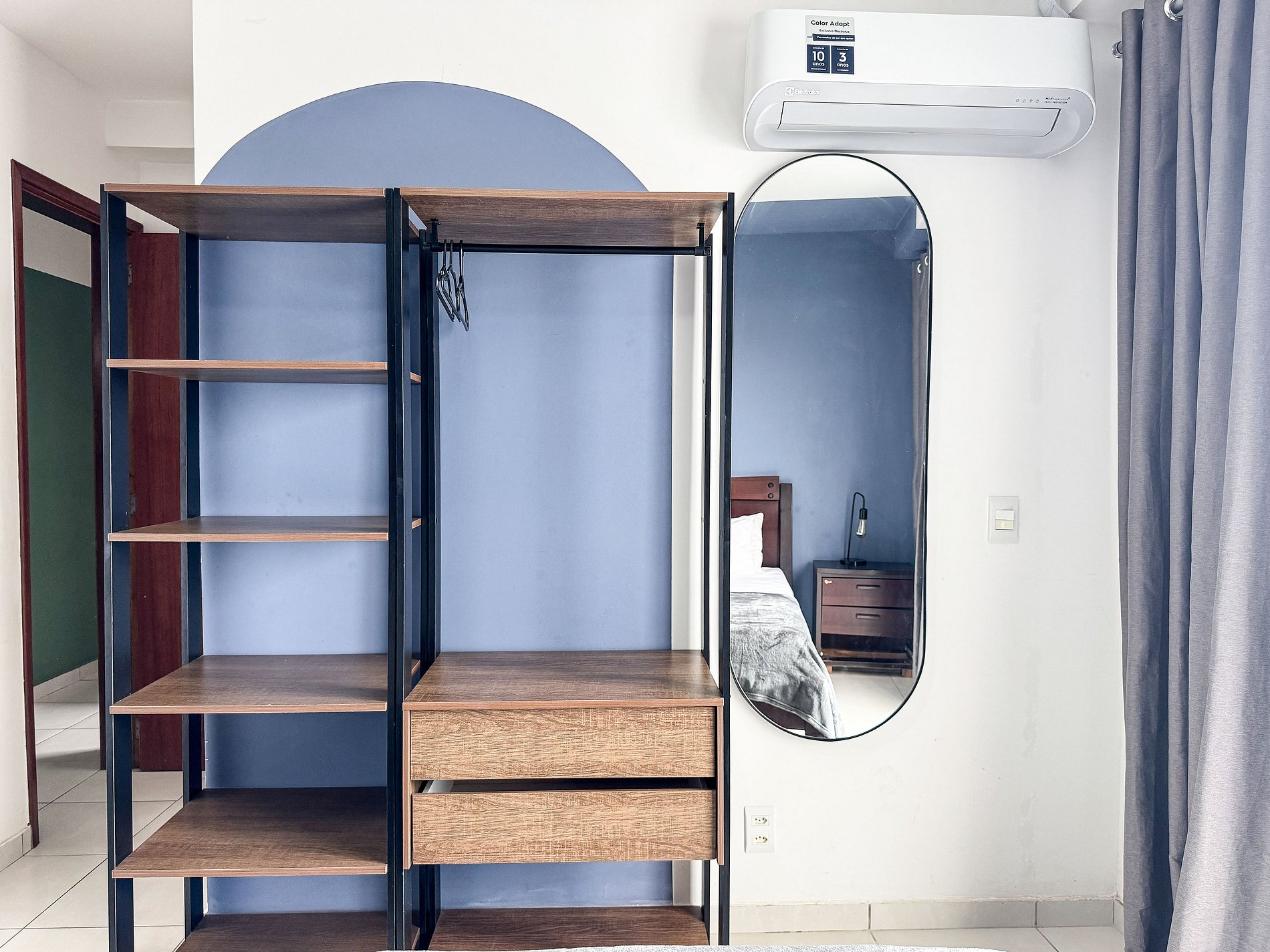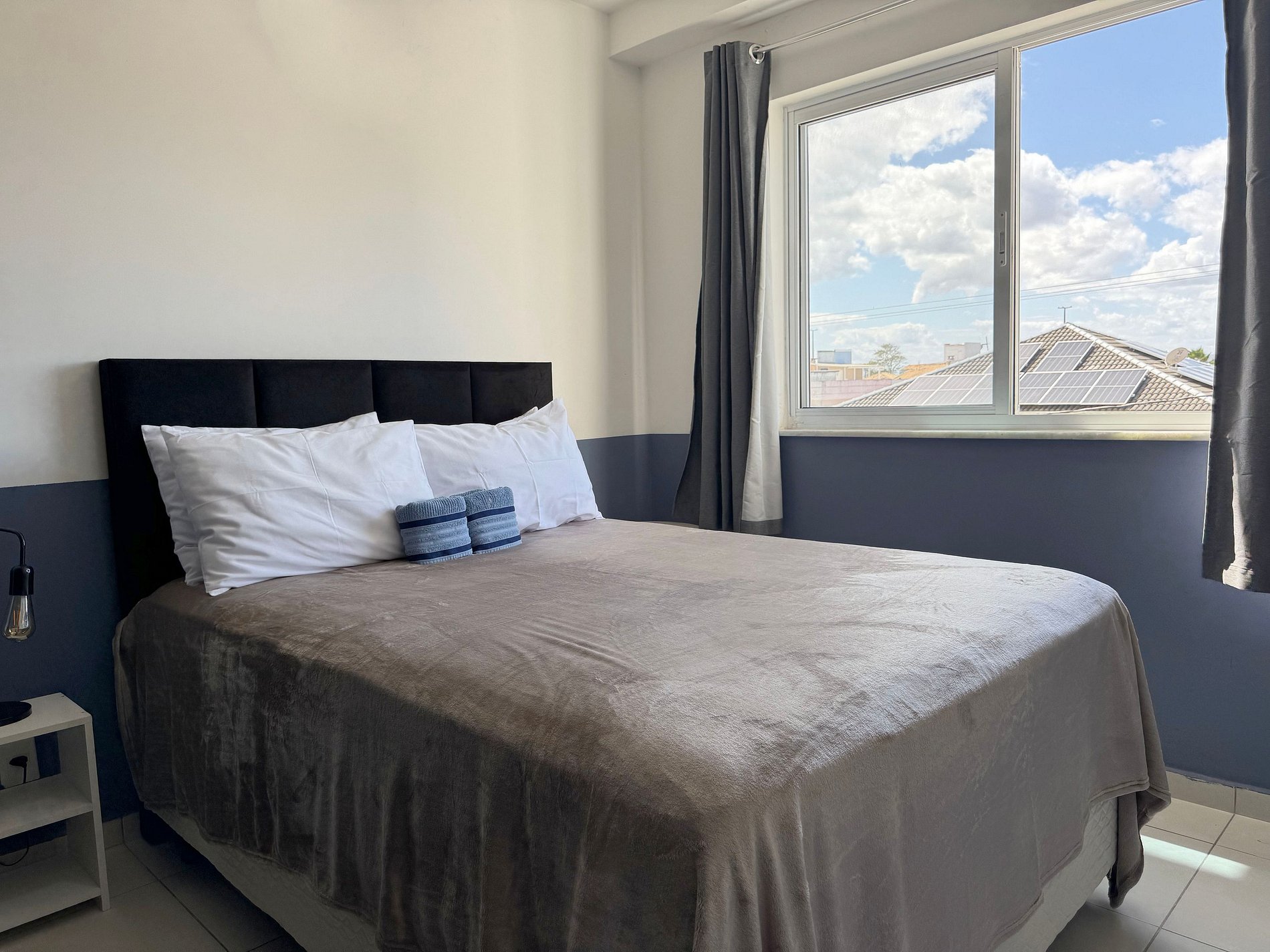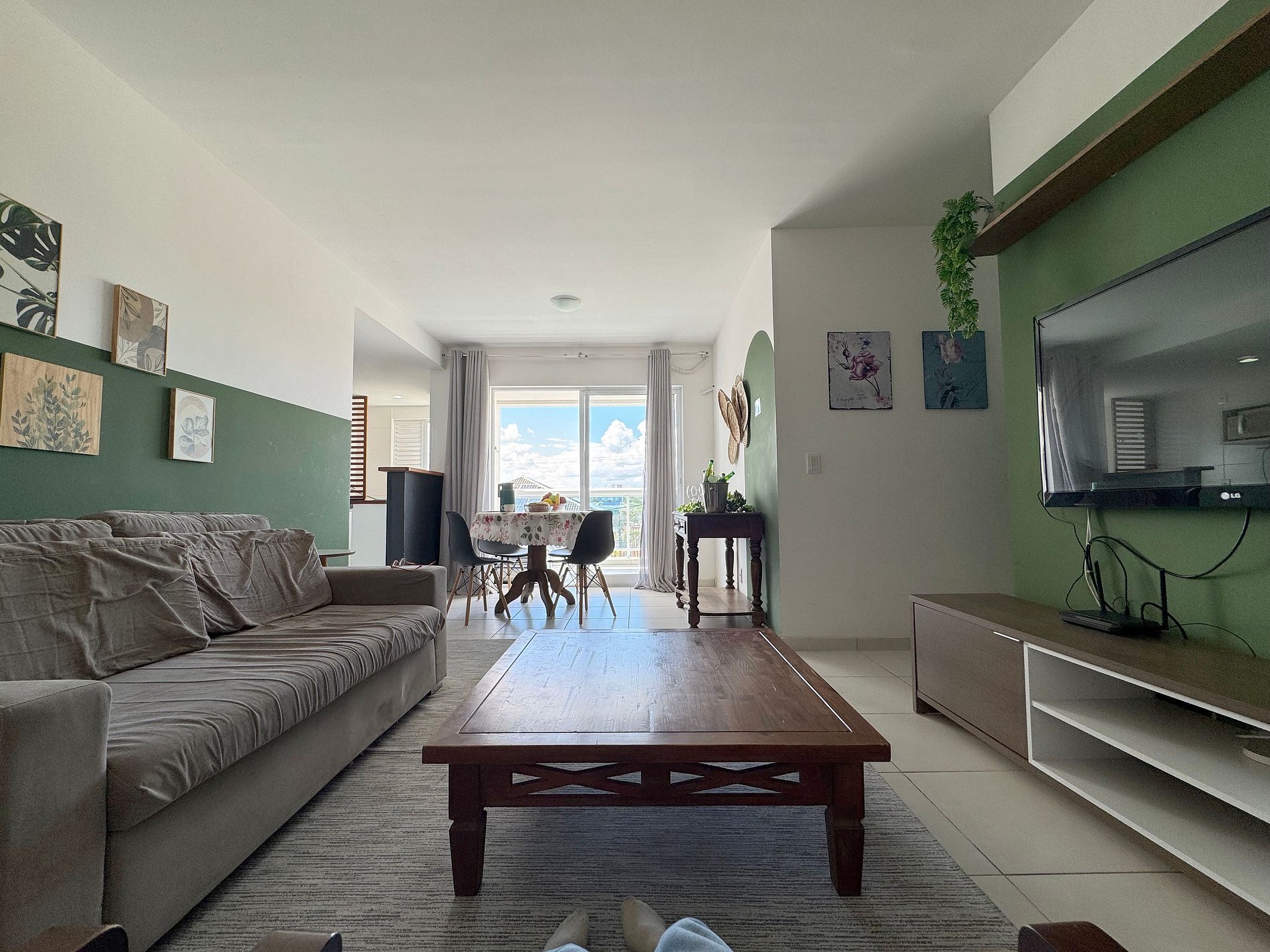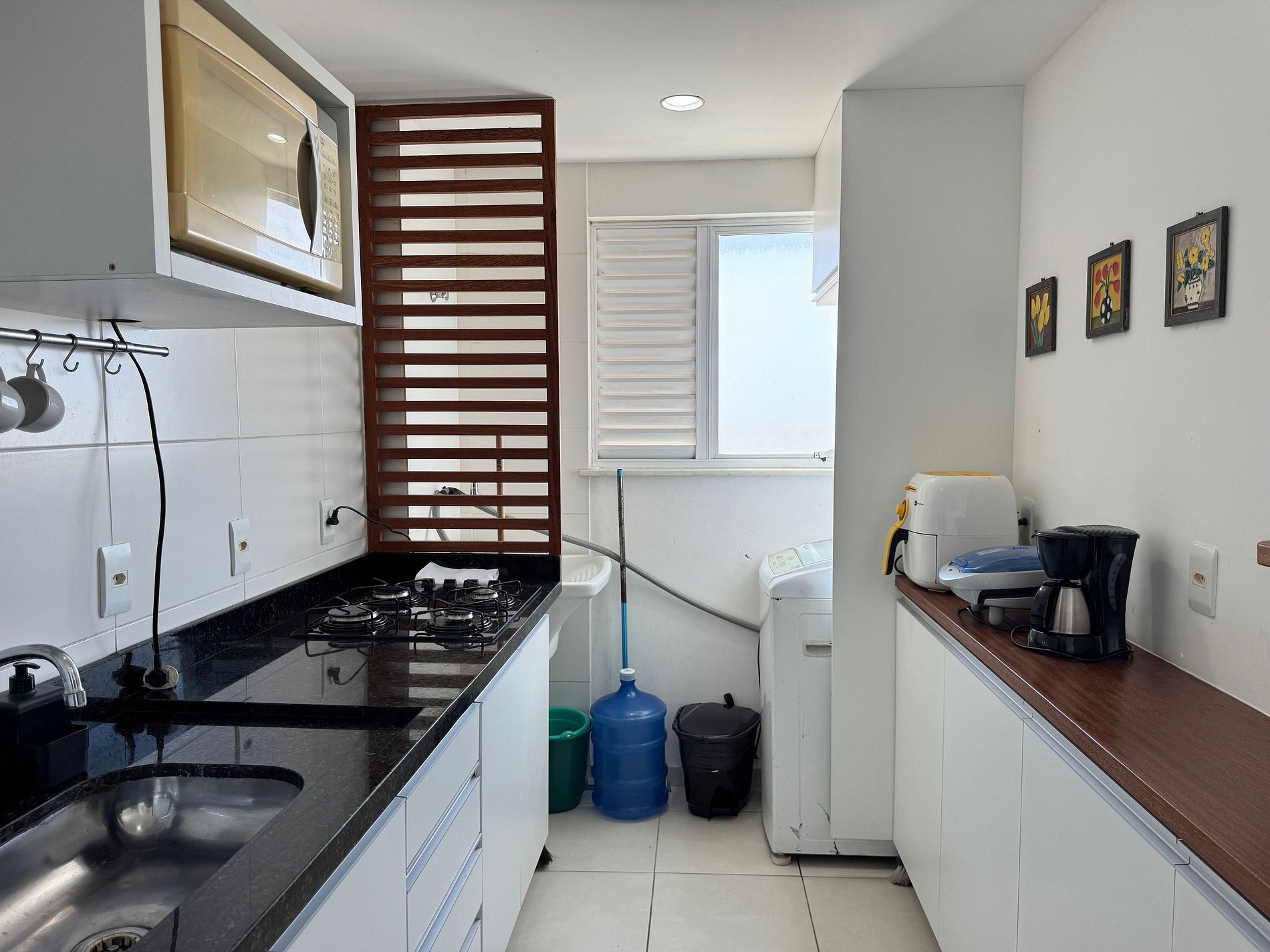 Apartamento com 3 quartos, sendo 2 quartos com ar-condicionado, incluindo a suíte e 1 quarto com ventilador de teto, cozinha completa, sala e varanda.