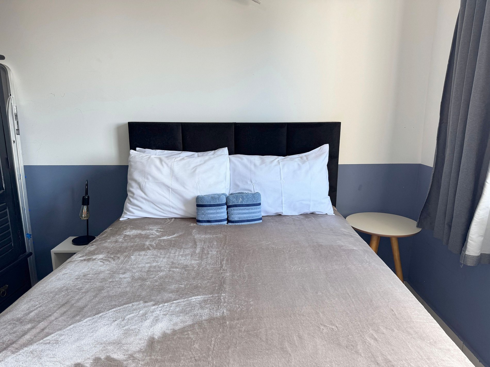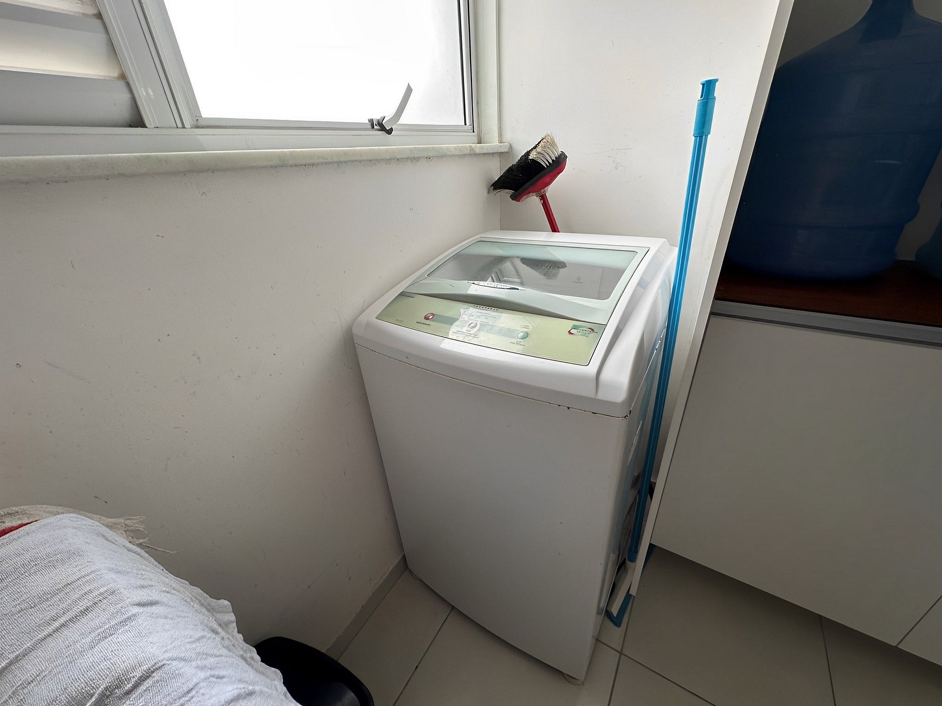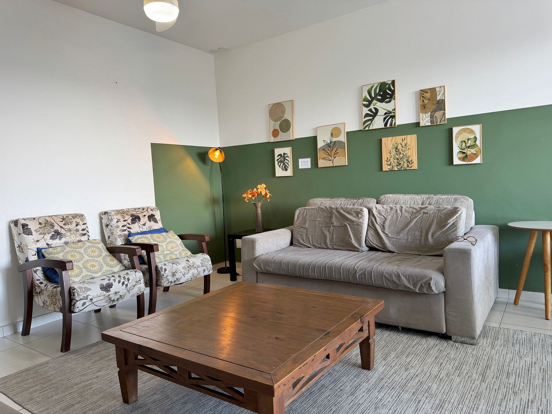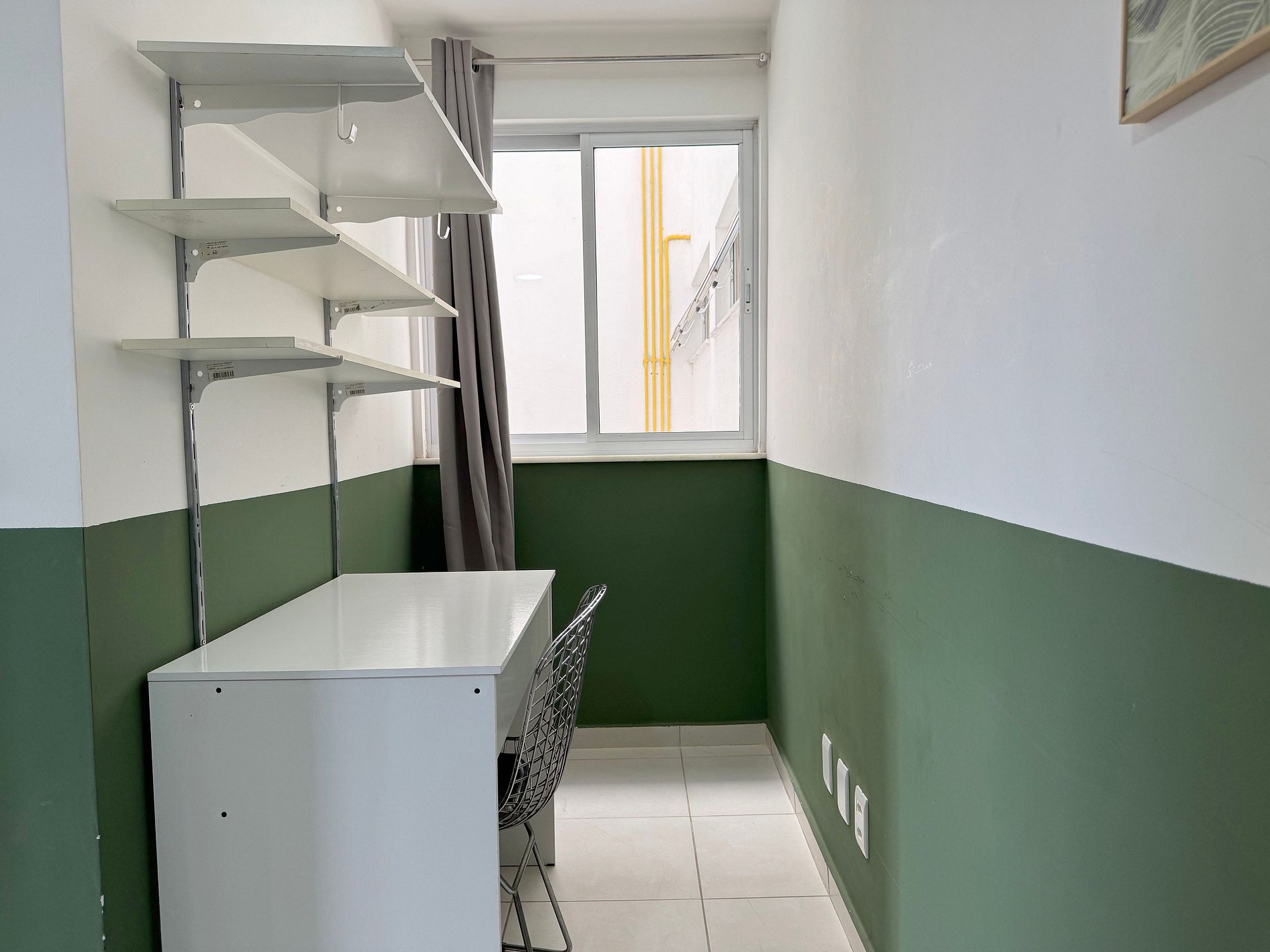 Apartamento com 3 quartos, sendo 2 quartos com ar-condicionado, incluindo a suíte e 1 quarto com ventilador de teto, cozinha completa, sala e varanda.