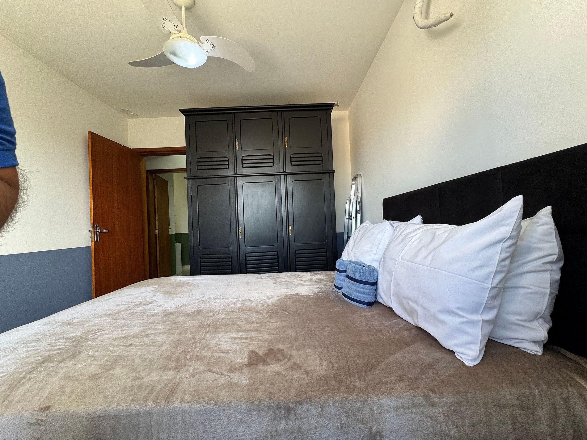 Apartamento com 3 quartos com ventilador de teto, cozinha completa, sala e varanda.