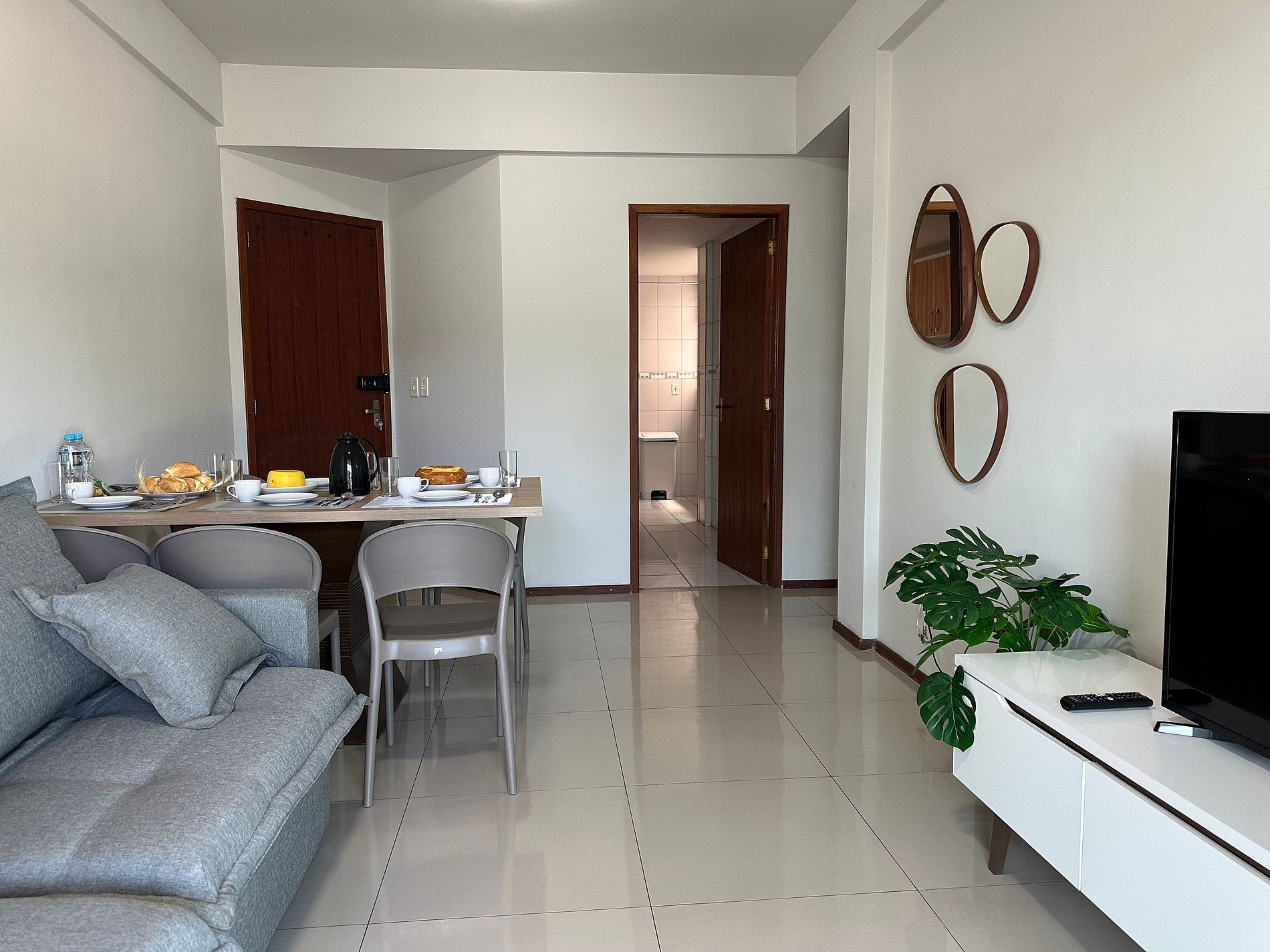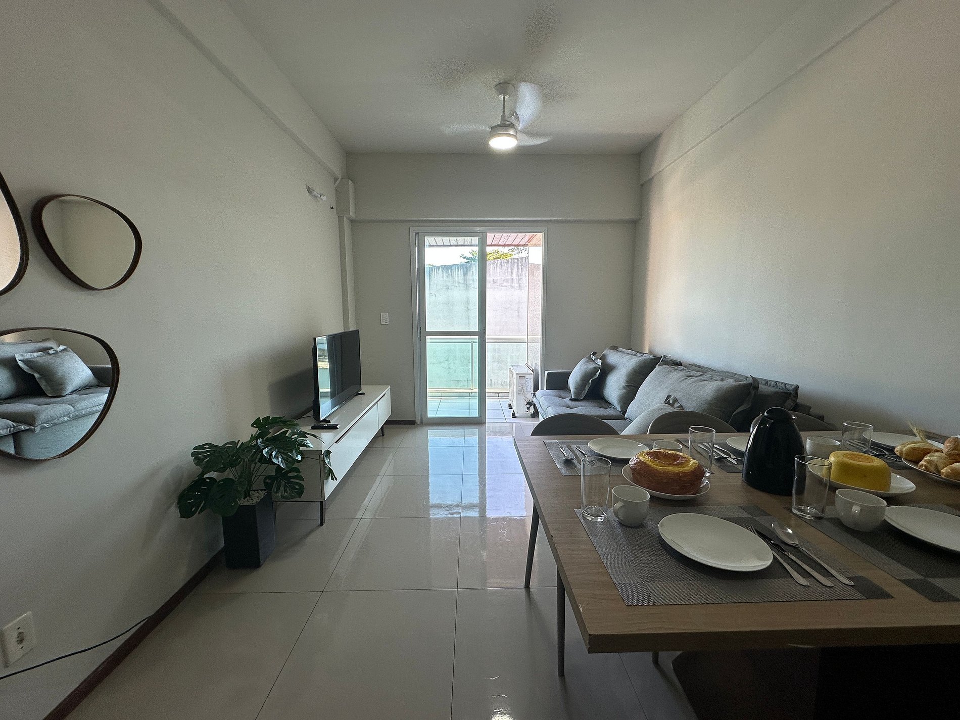 O apartamento possui 2 quartos com ar condicionado, sendo uma suíte, 2 banheiros, sala aconchegante com TV smart e mesa para jantar. Cozinha completa com todos os tipos de utensílios e panelas. Área de serviço com máquina de lavar.