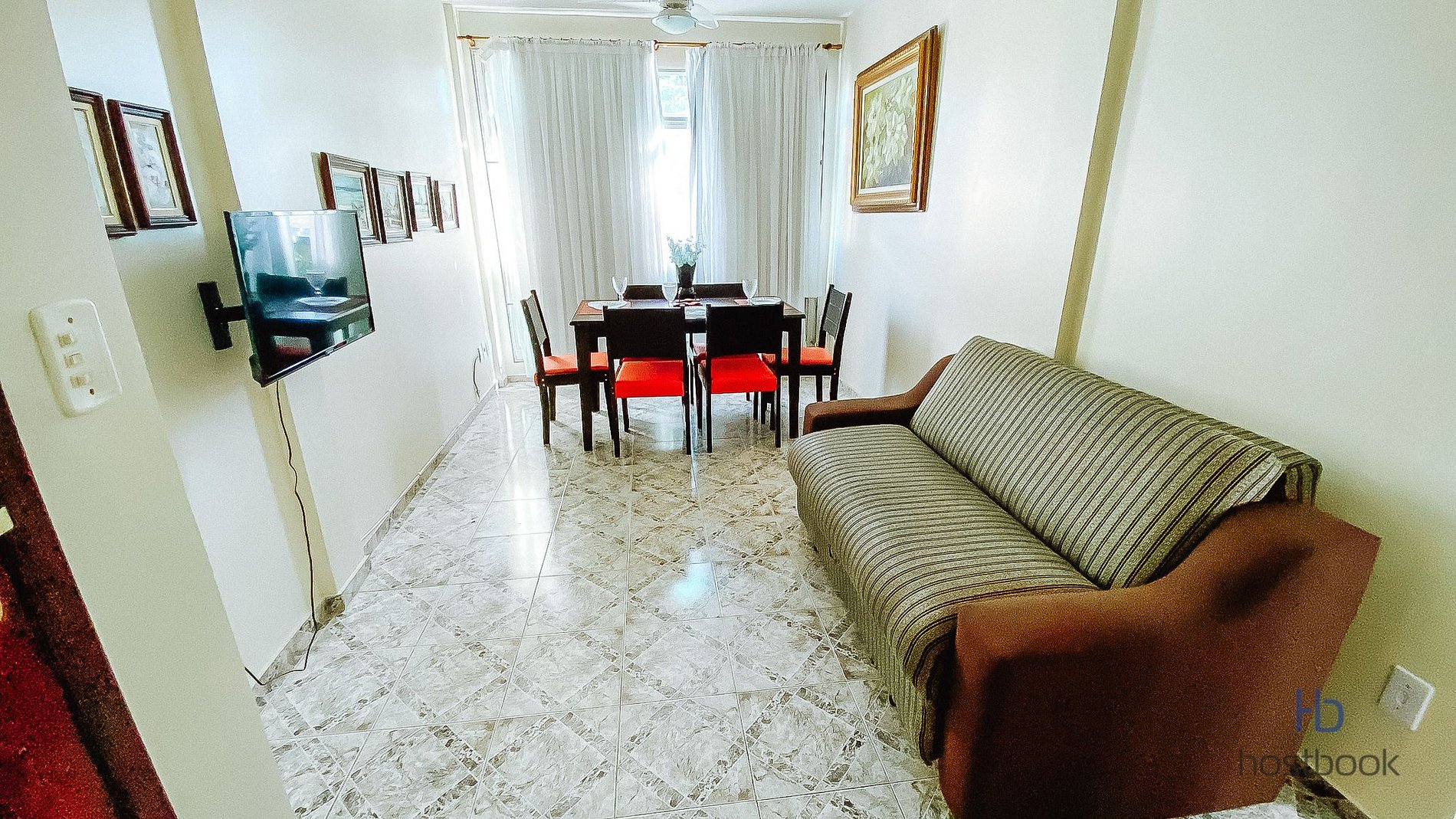 Sala com mesa de Jantar, sofá-cama e TV Smart.