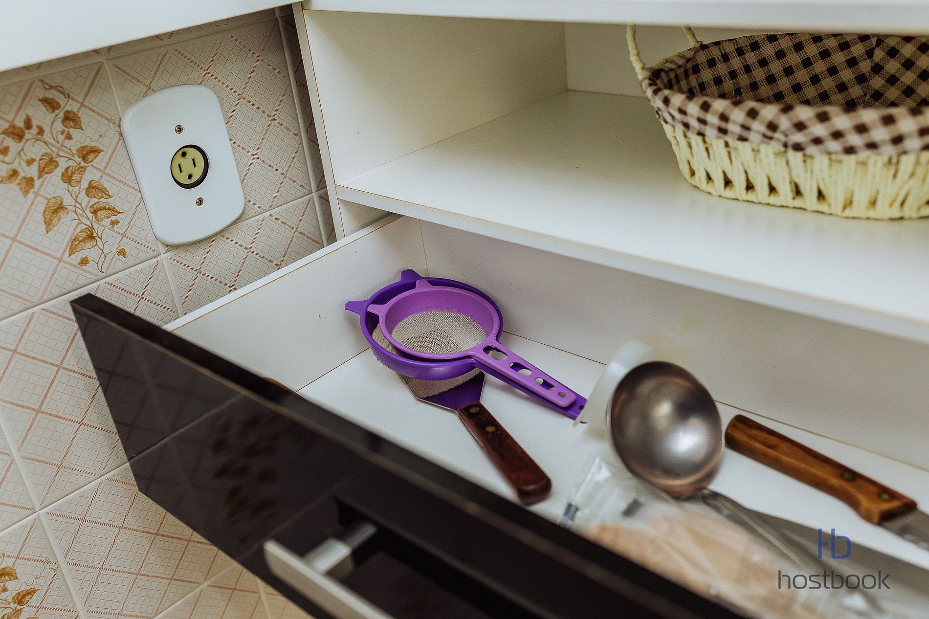 Cozinha com todos os utensílios para cozinhar, prato, copos e taças.