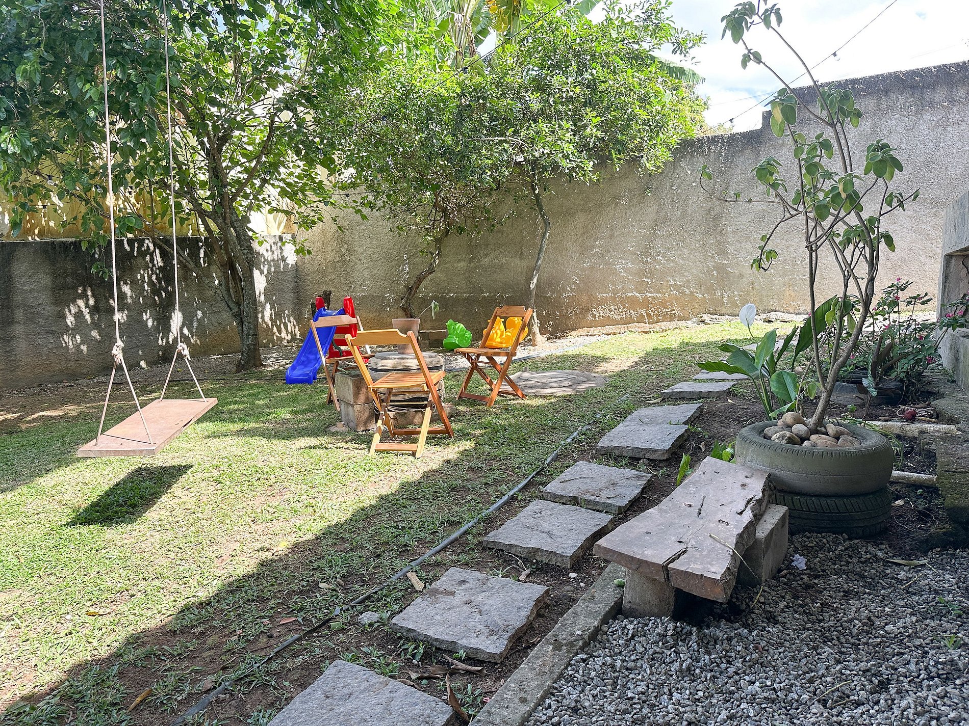 A casa possui dois quartos, dois banheiros, varanda ampla, churrasqueira, chuveirão, lavanderia e uma rede. Sala integrada com cozinha completa e mesa interna. Possui também um quintal gramado e arborizado.