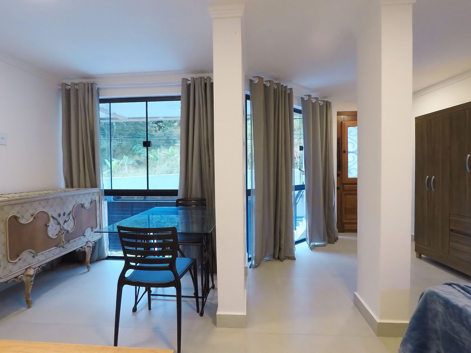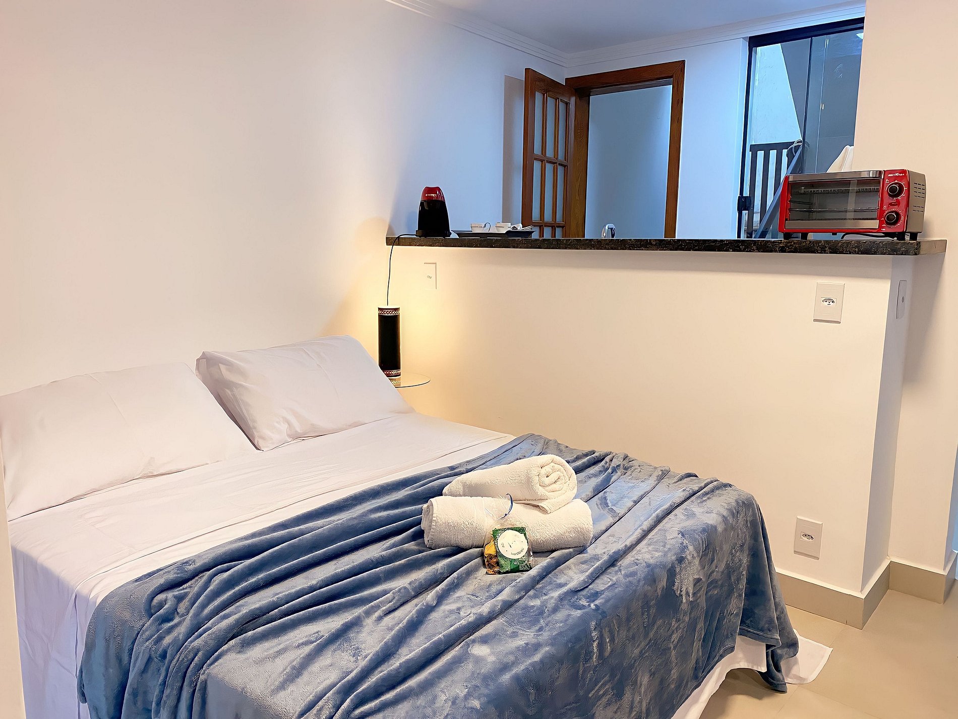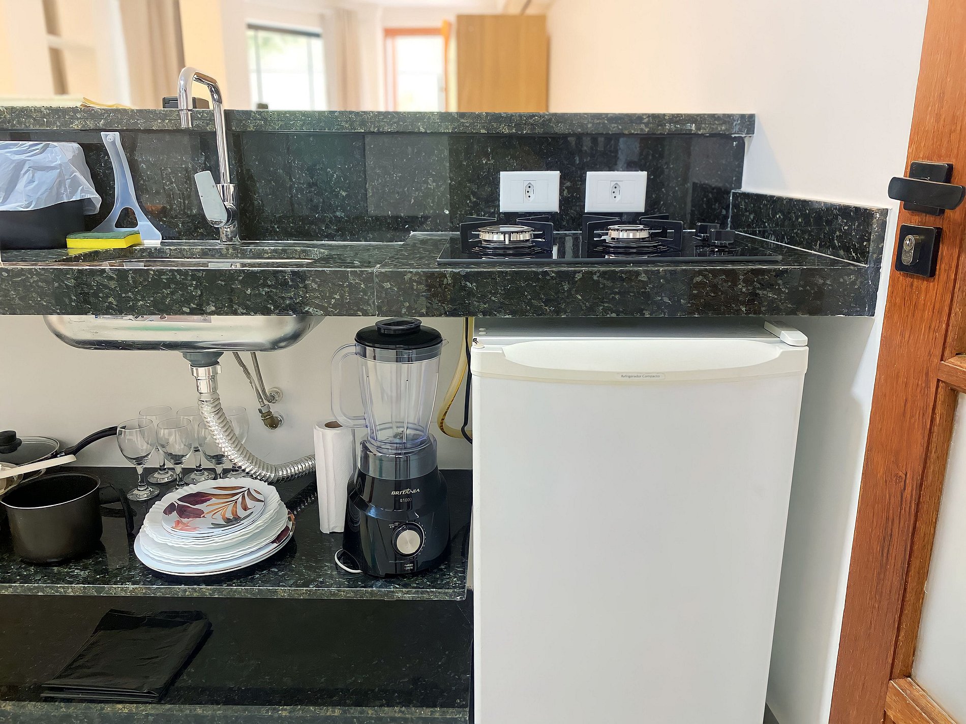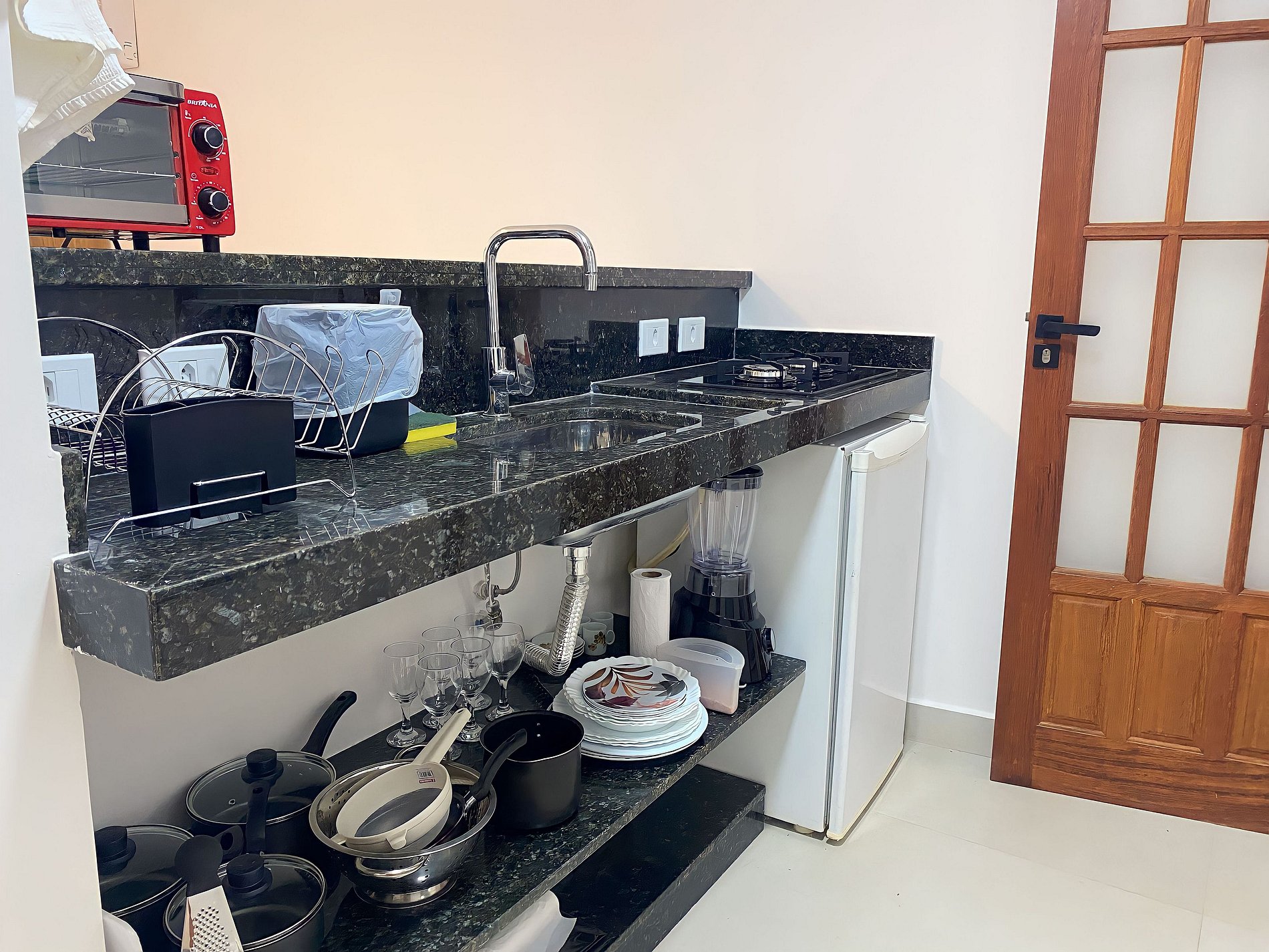 O loft é amplo e completo. Você encontrará um ambiente pensado para temporada, com sala, quarto, cozinha e banheiro, área de serviço e garagem. A cozinha é simples e completa, com tudo que você possa precisar na sua estadia. O quarto possui uma cama de casal confortável e armário, além de ar-condicionado. Na sala há um espaço em que é possível colocar um colchonete. Os ambientes não possuem divisão por portas, apenas no banheiro. Há um chuveirão na garagem.