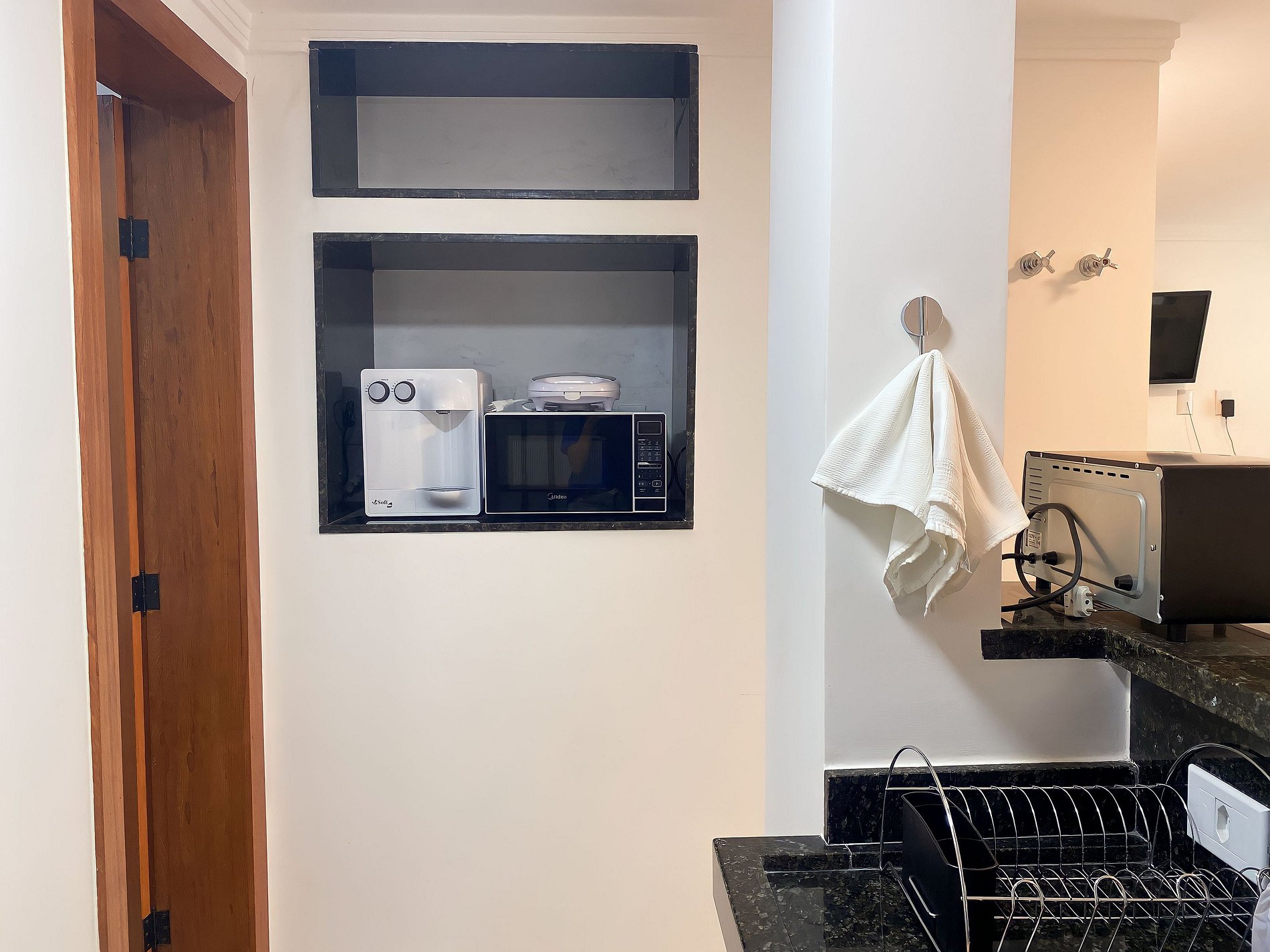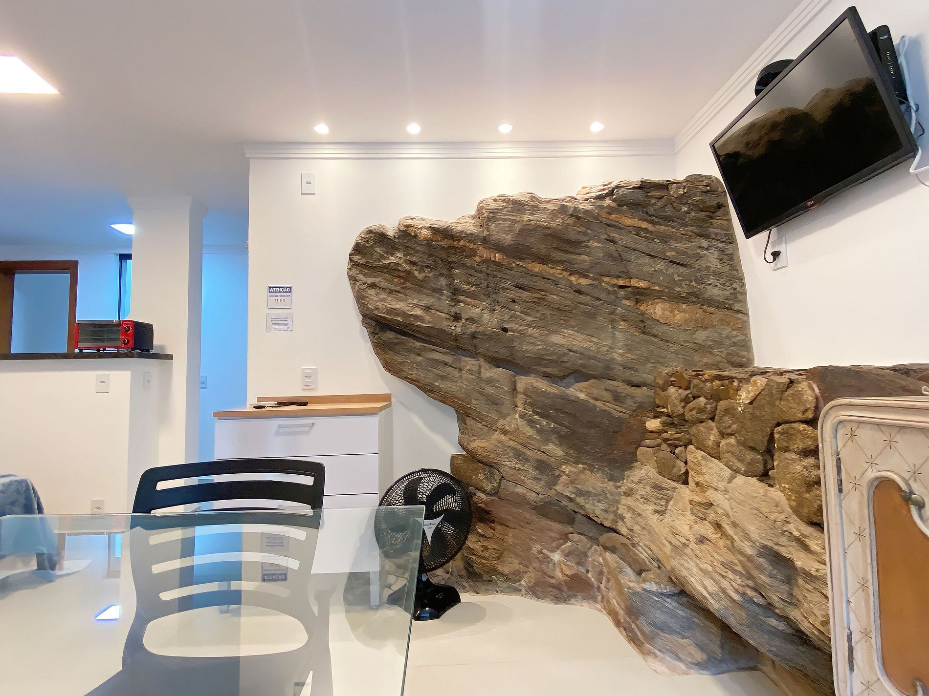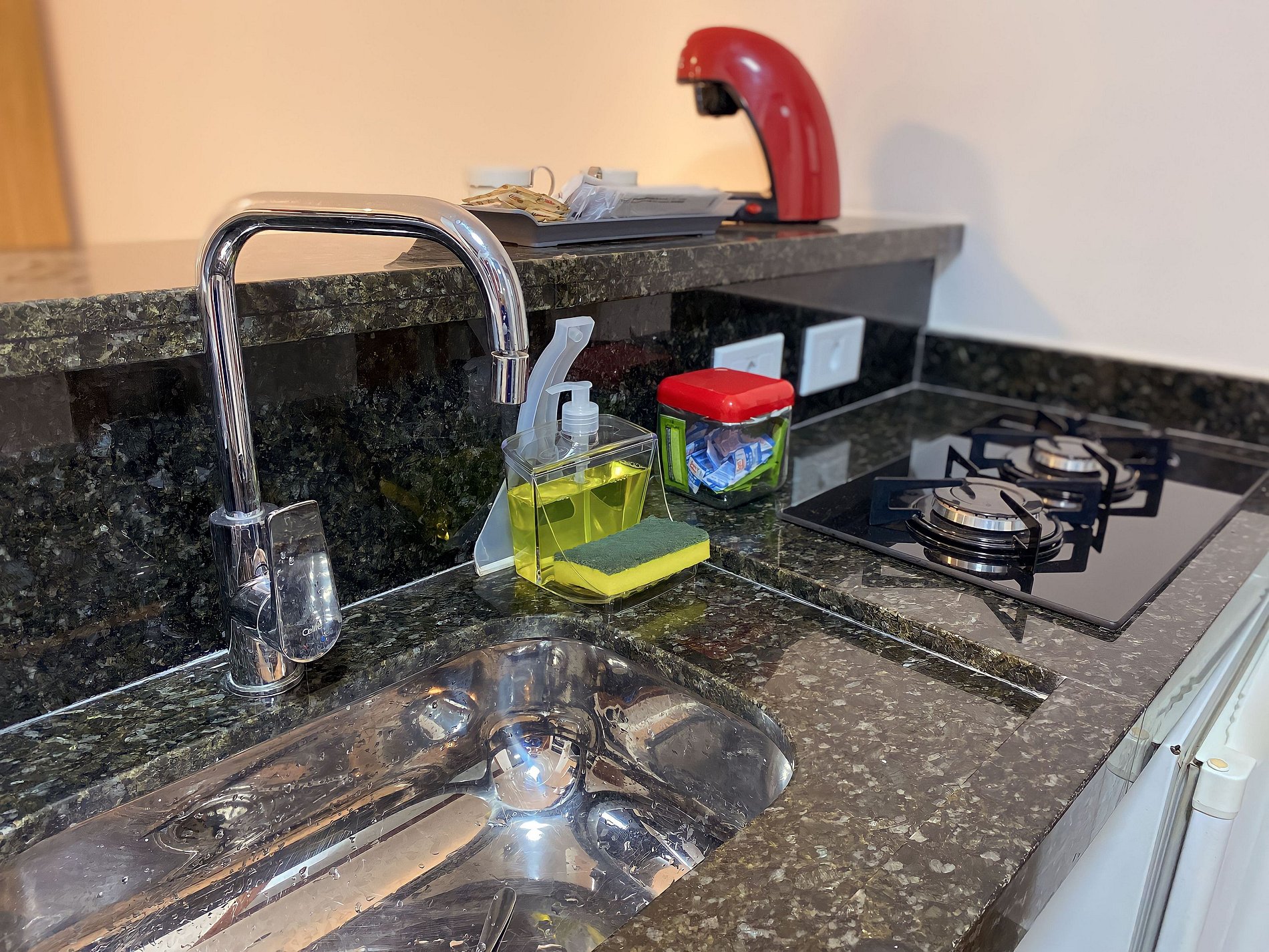 O loft é amplo e completo. Você encontrará um ambiente pensado para temporada, com sala, quarto, cozinha e banheiro, área de serviço e garagem. A cozinha é simples e completa, com tudo que você possa precisar na sua estadia. O quarto possui uma cama de casal confortável e armário, além de ar-condicionado. Na sala há um espaço em que é possível colocar um colchonete. Os ambientes não possuem divisão por portas, apenas no banheiro. Há um chuveirão na garagem.
