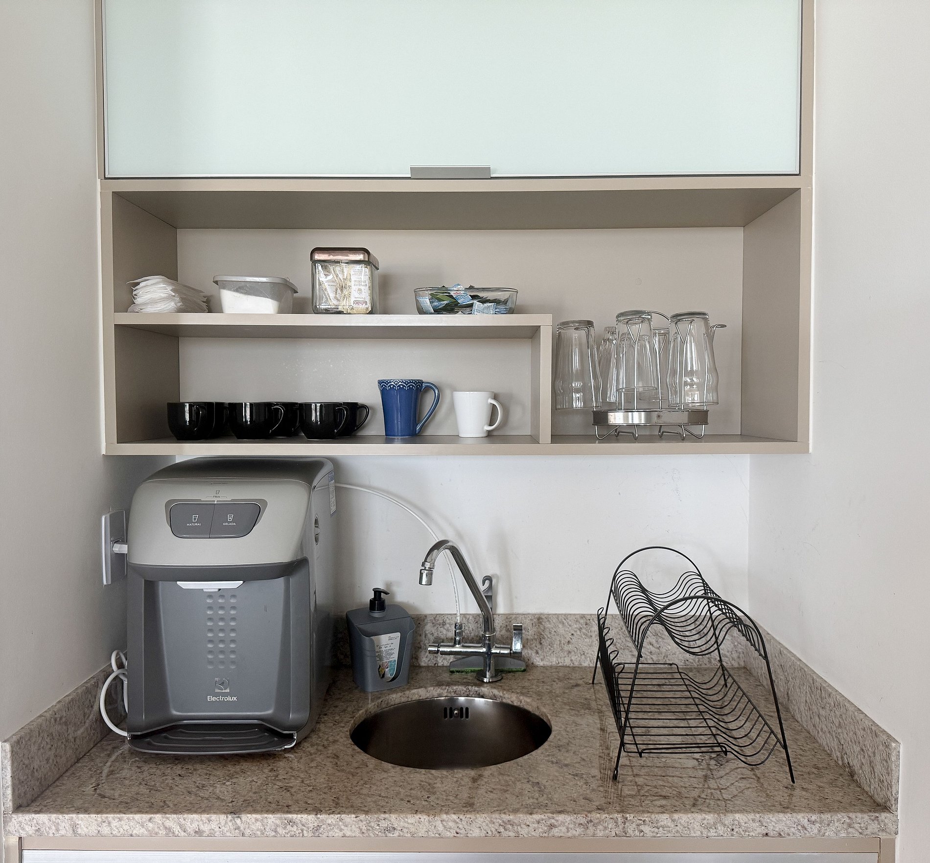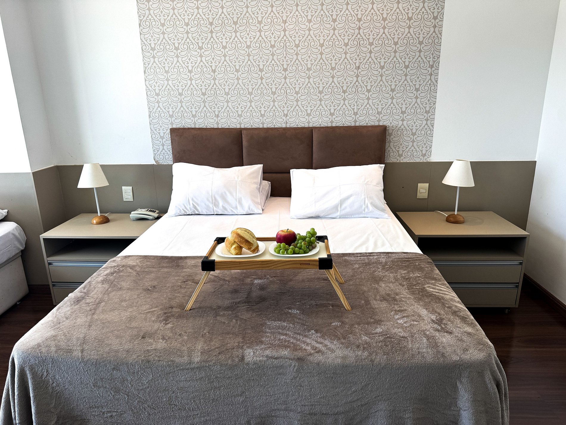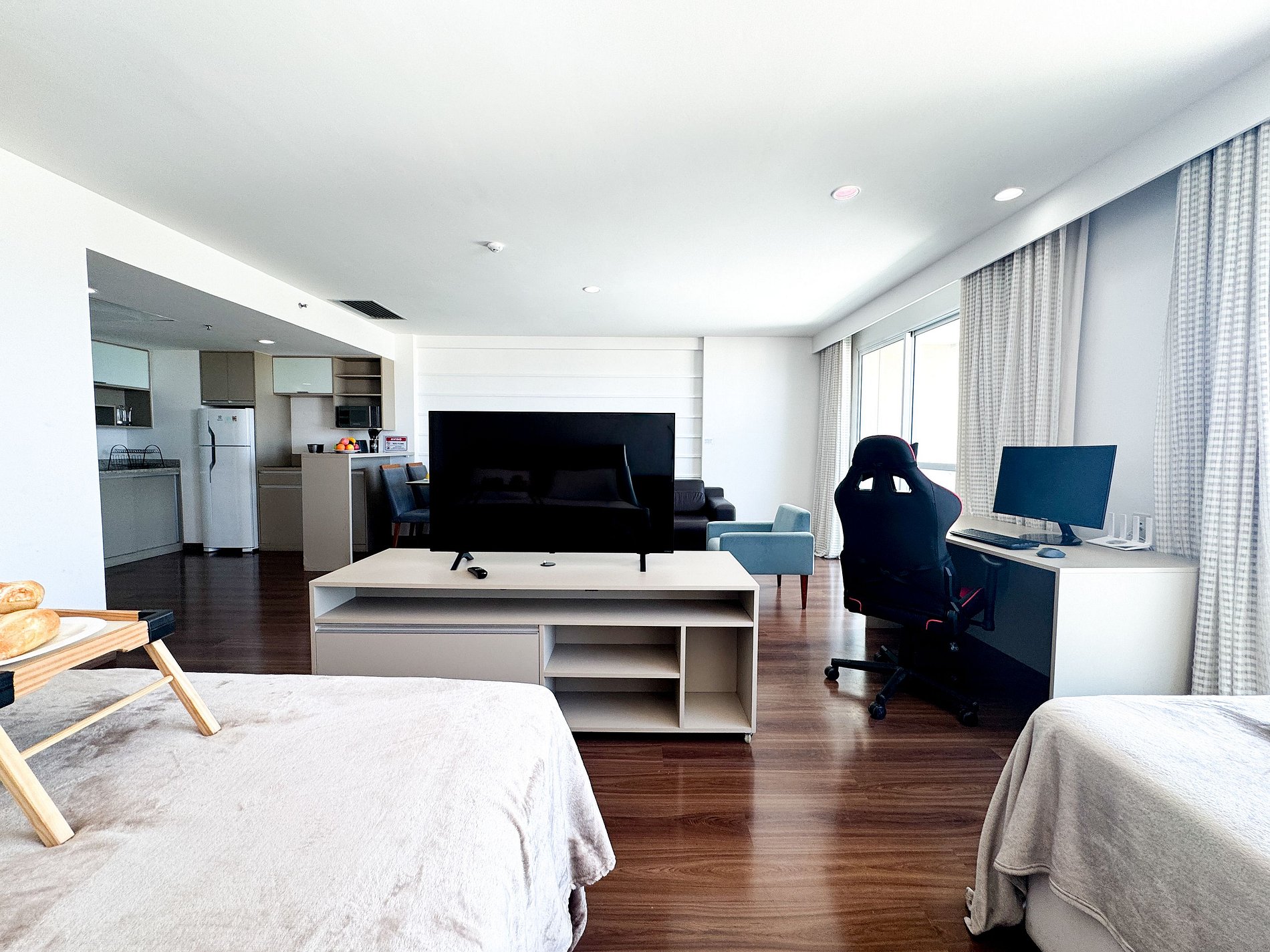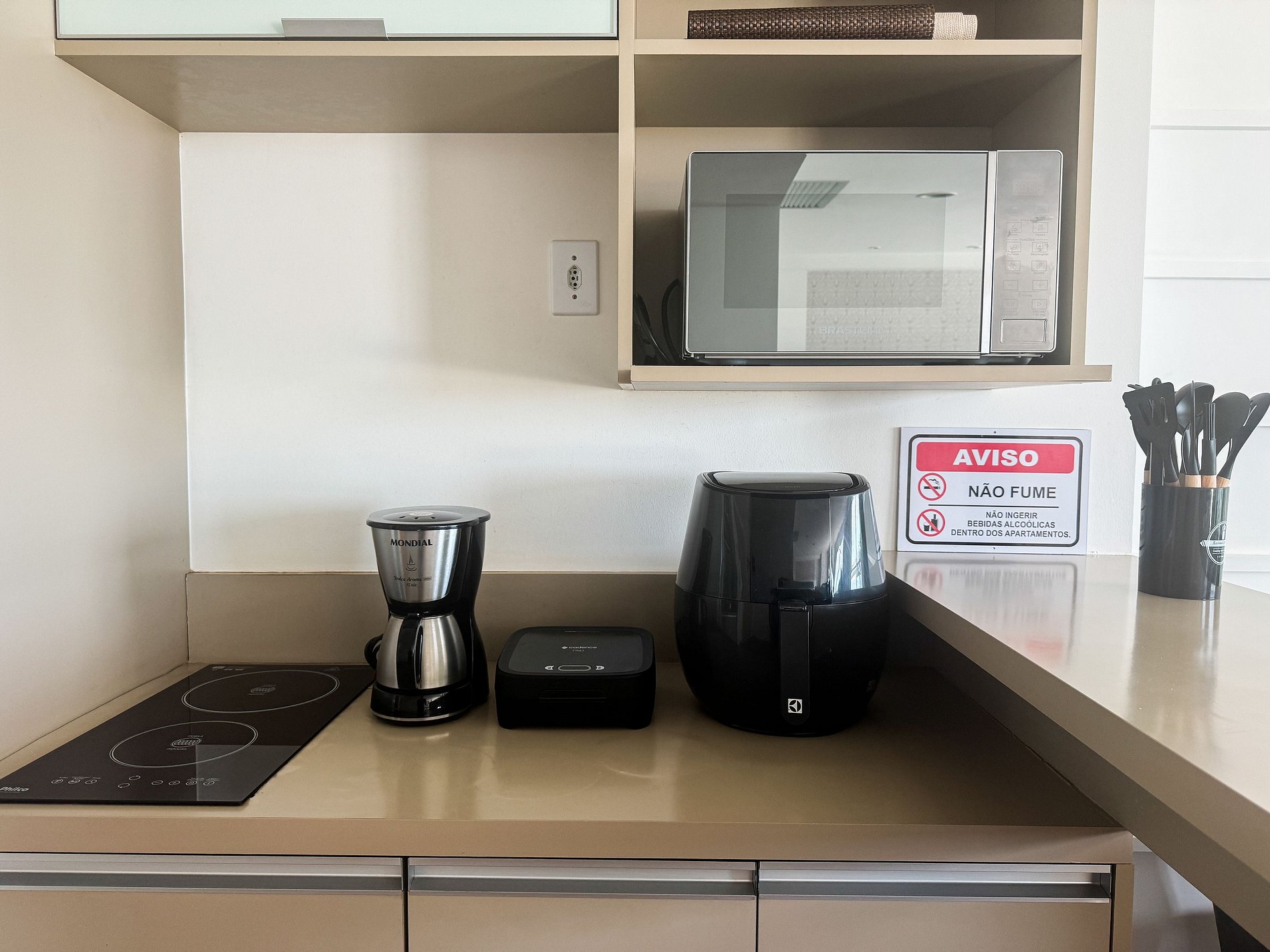 O espaço oferece cozinha completa com Airfryer, fogão, utensílios e mesa de jantar,. Sala com sofá amplo retrátil e Smartv 50" e canais fechados disponibilizados pelo condomínio. Temos um escritório para trabalho com monitor e teclado extras. No quarto existe uma cama de casal Queen e uma cama de solteiro. Temos ferro para passar, barraca de praia e filtro de água, sendo o apartamento muito completo para quem precisa passar uma temporada na cidade.